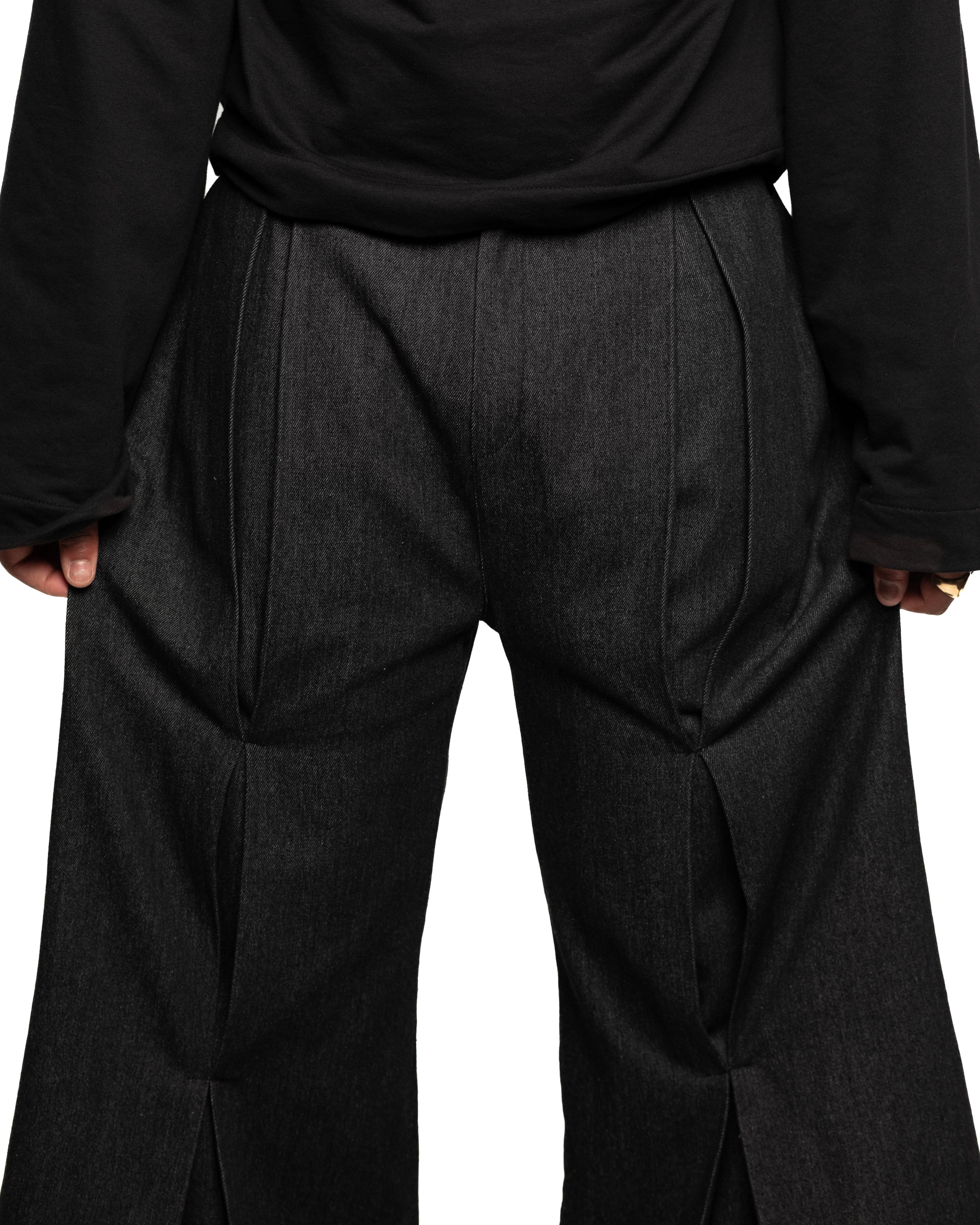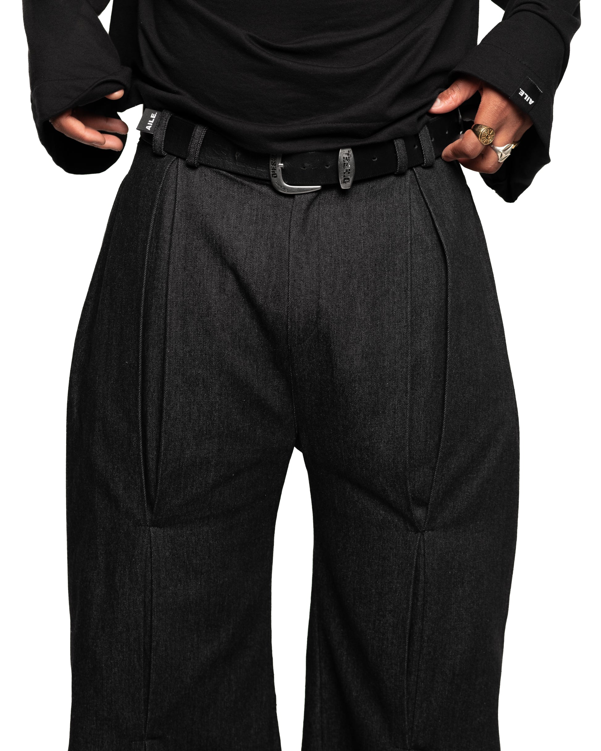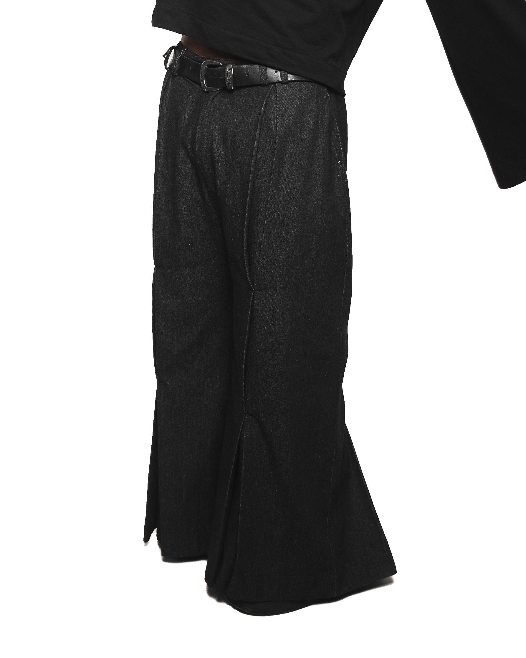 Long black denim trousers with vertical pleats on the front and back, side pockets. Belt loops and zip and two snap buttons closure.