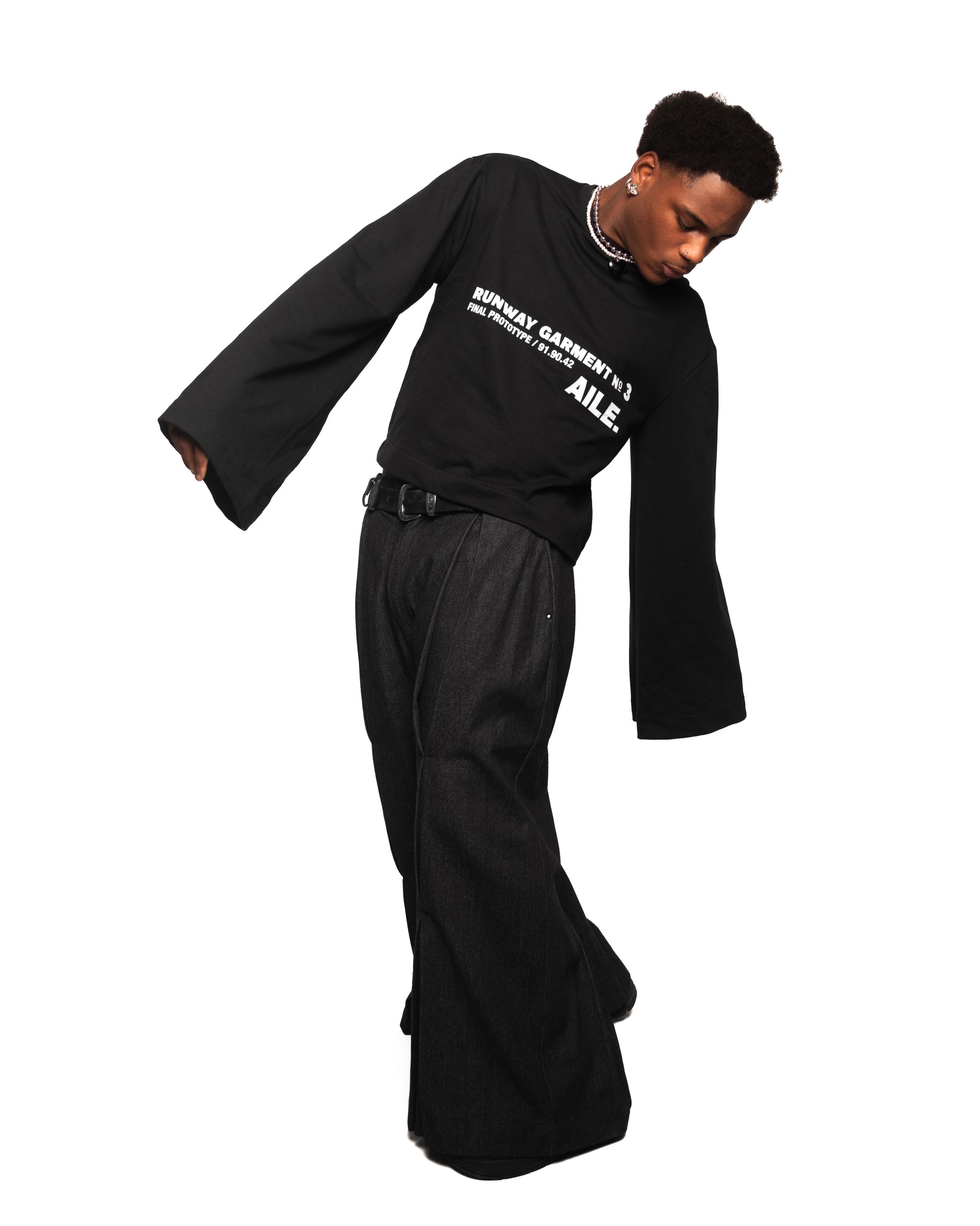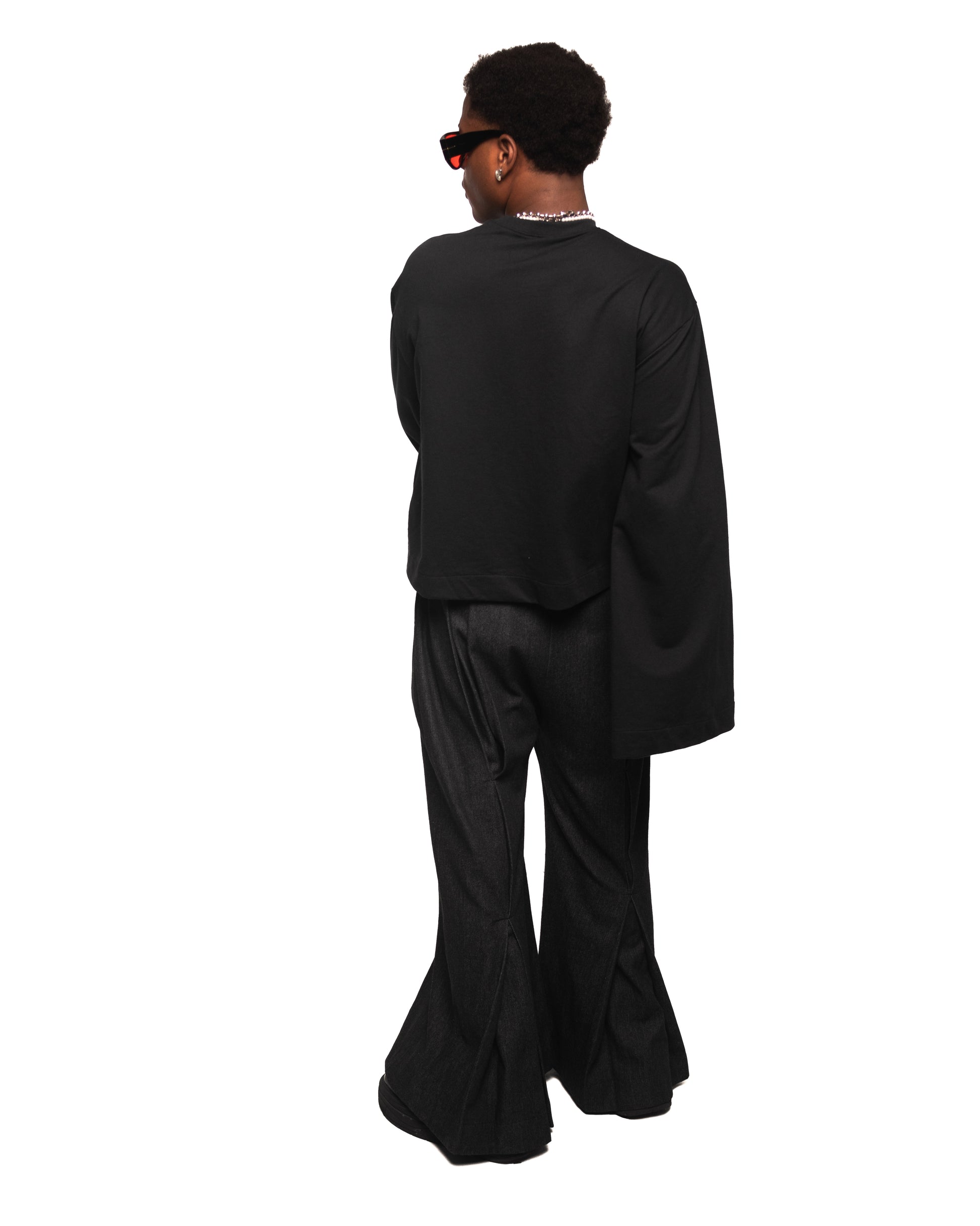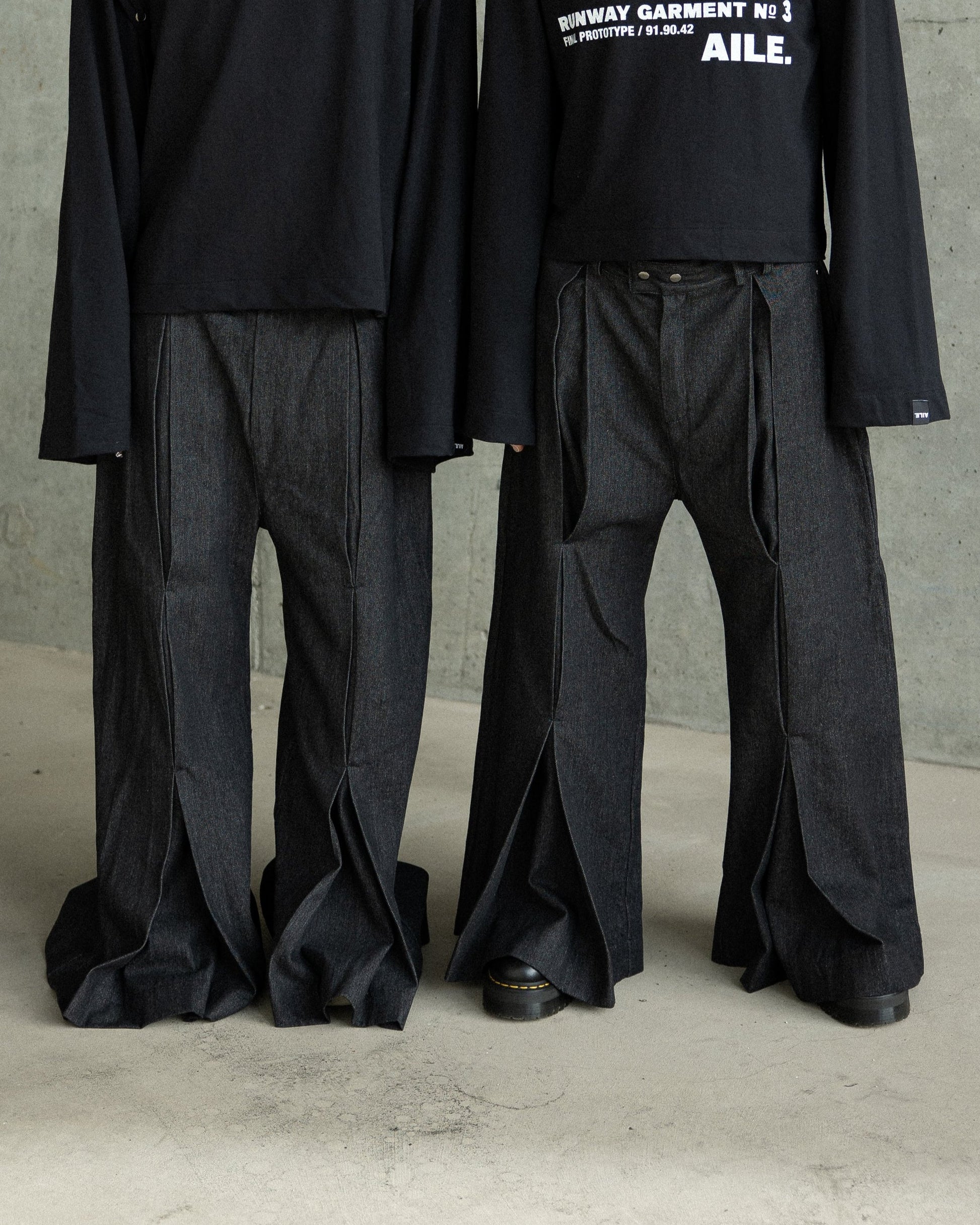 Long black denim trousers with vertical pleats on the front and back, side pockets. Belt loops and zip and two snap buttons closure.