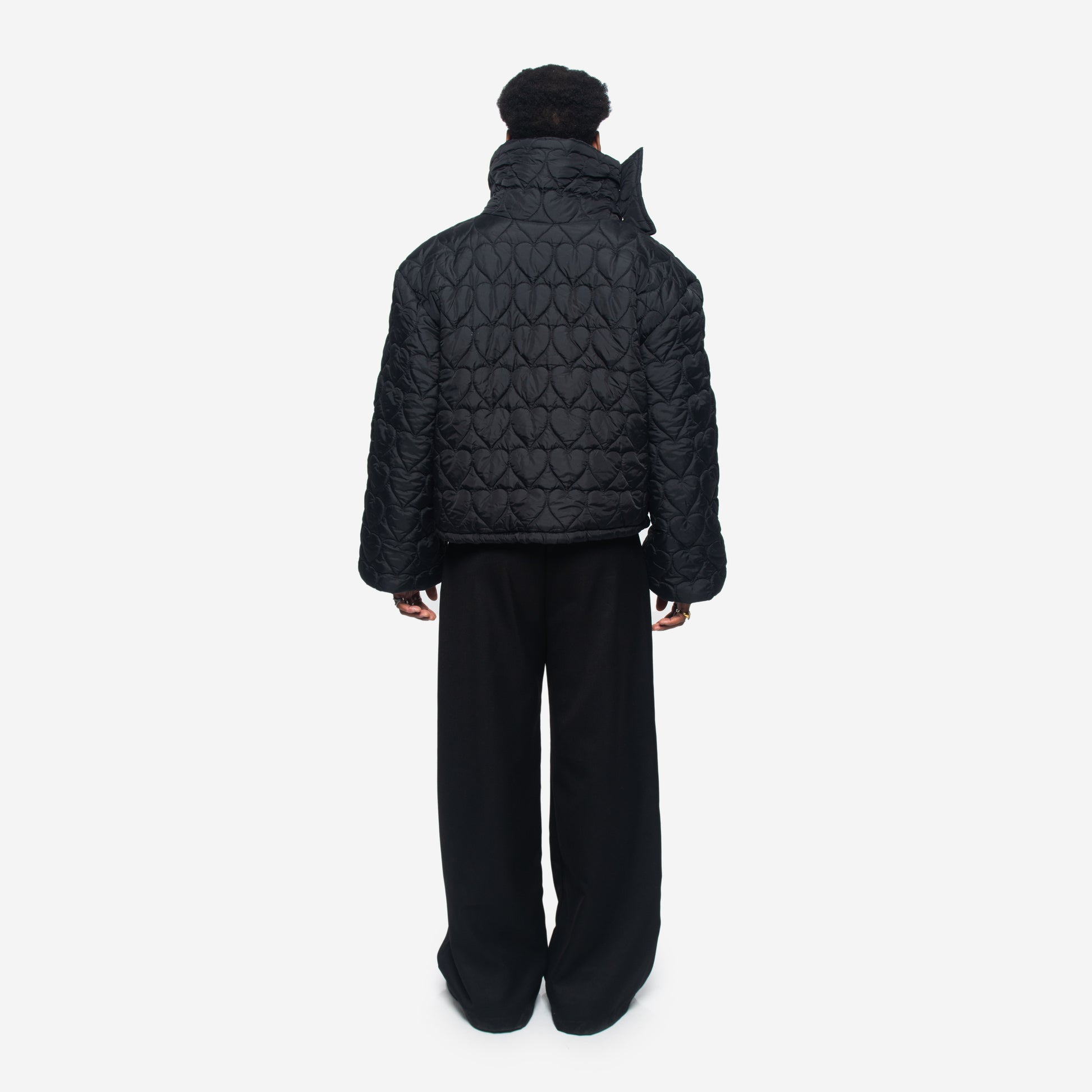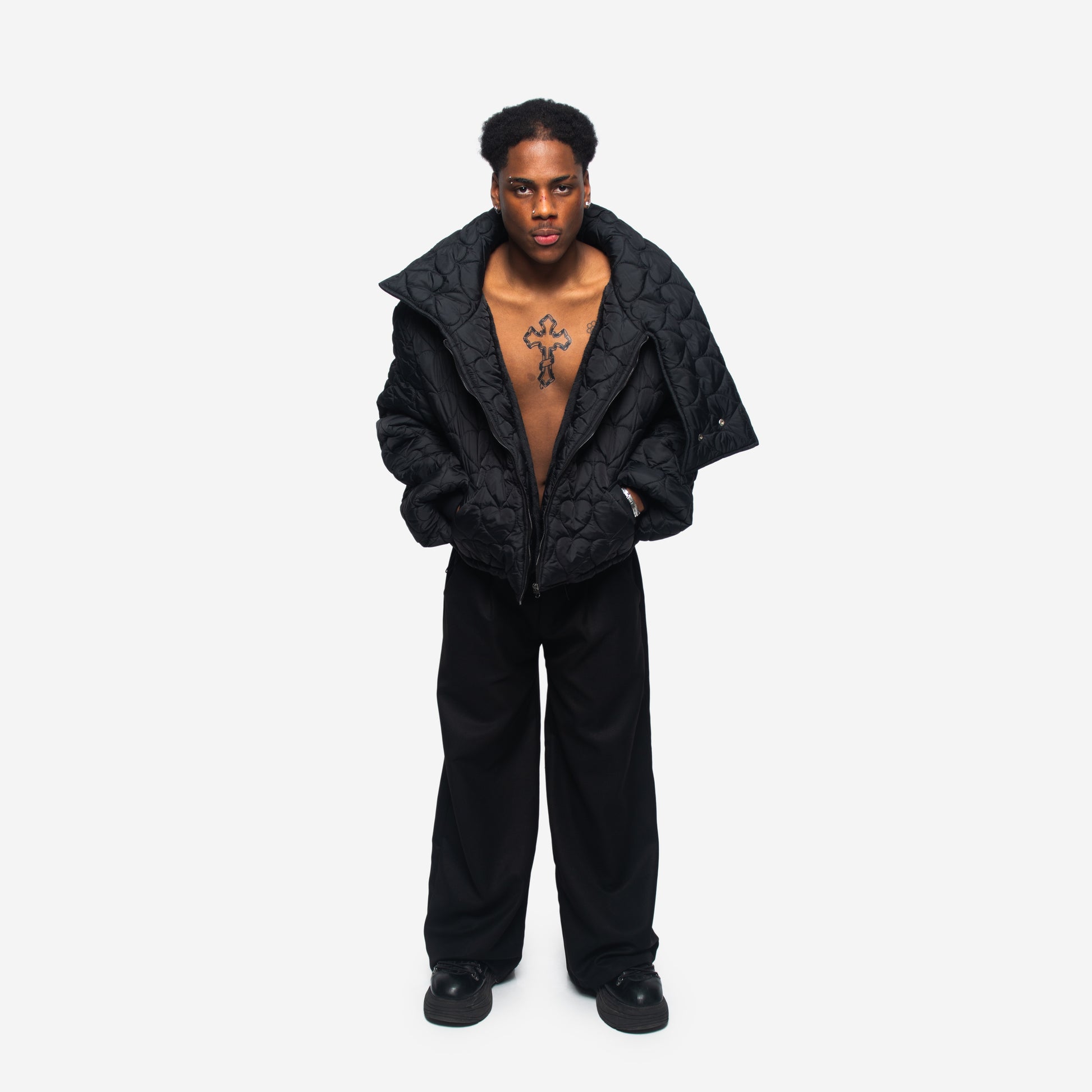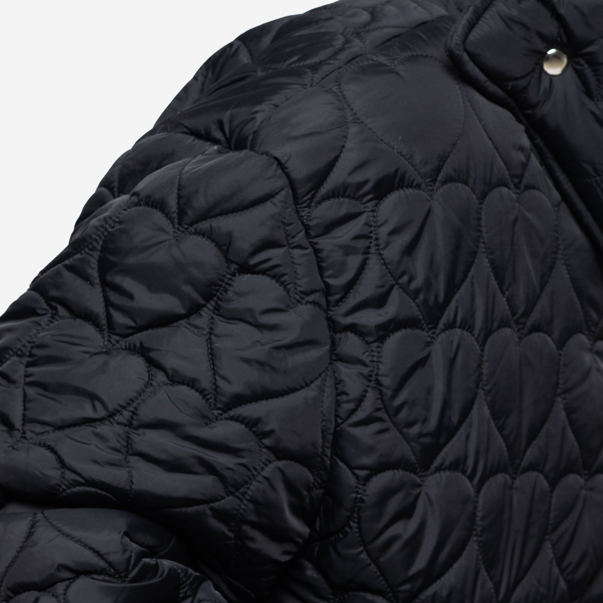 Black puffer with a heart pattern, lined with coral (fur) inside and tankas to adjust the waist. Coraline lined side pockets.