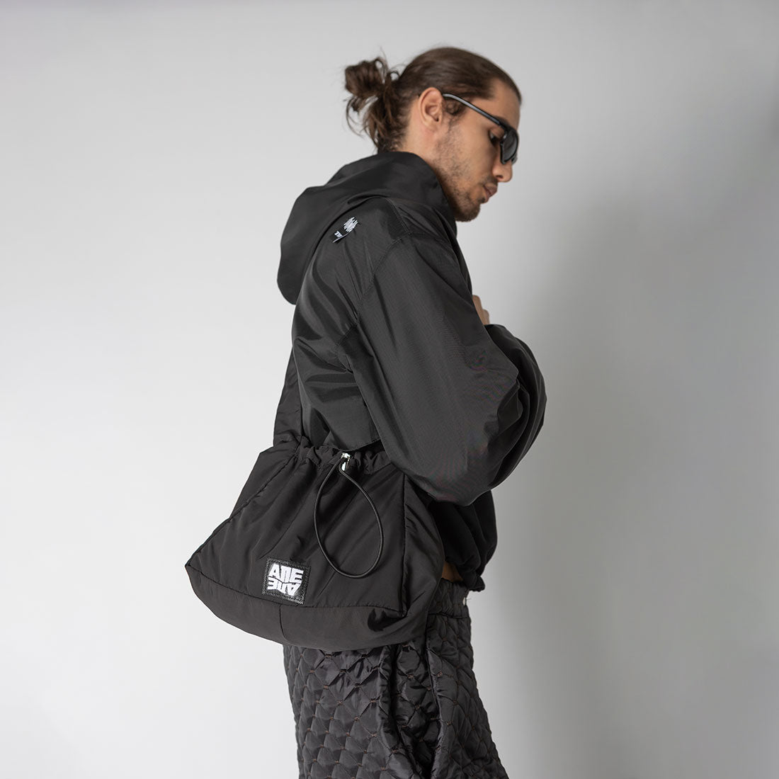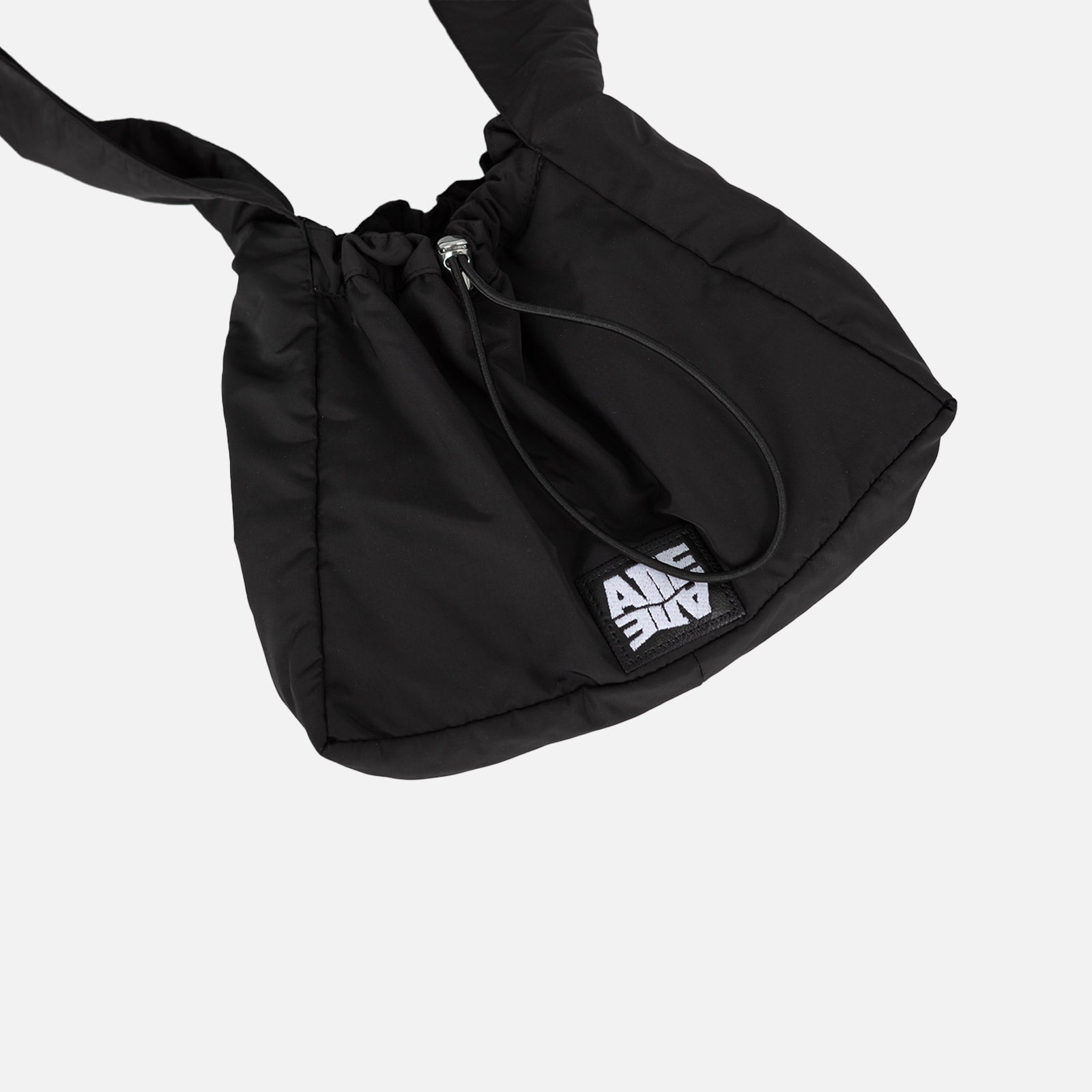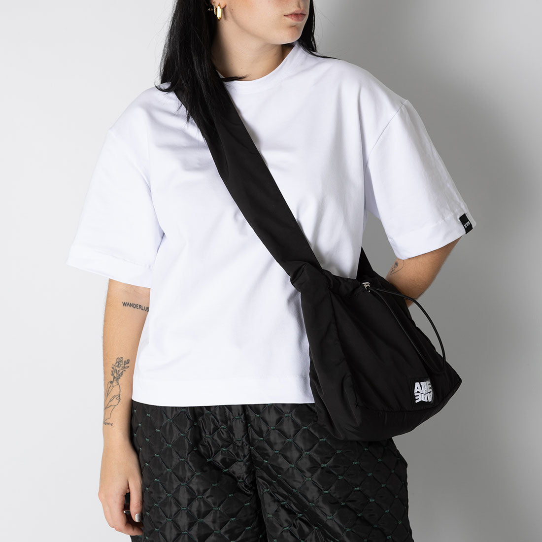 Crossbag/shoulder bag/nylon bag. White embroidery on a piece of leatherette and adjustable rubber with tanka. Interior pocket.