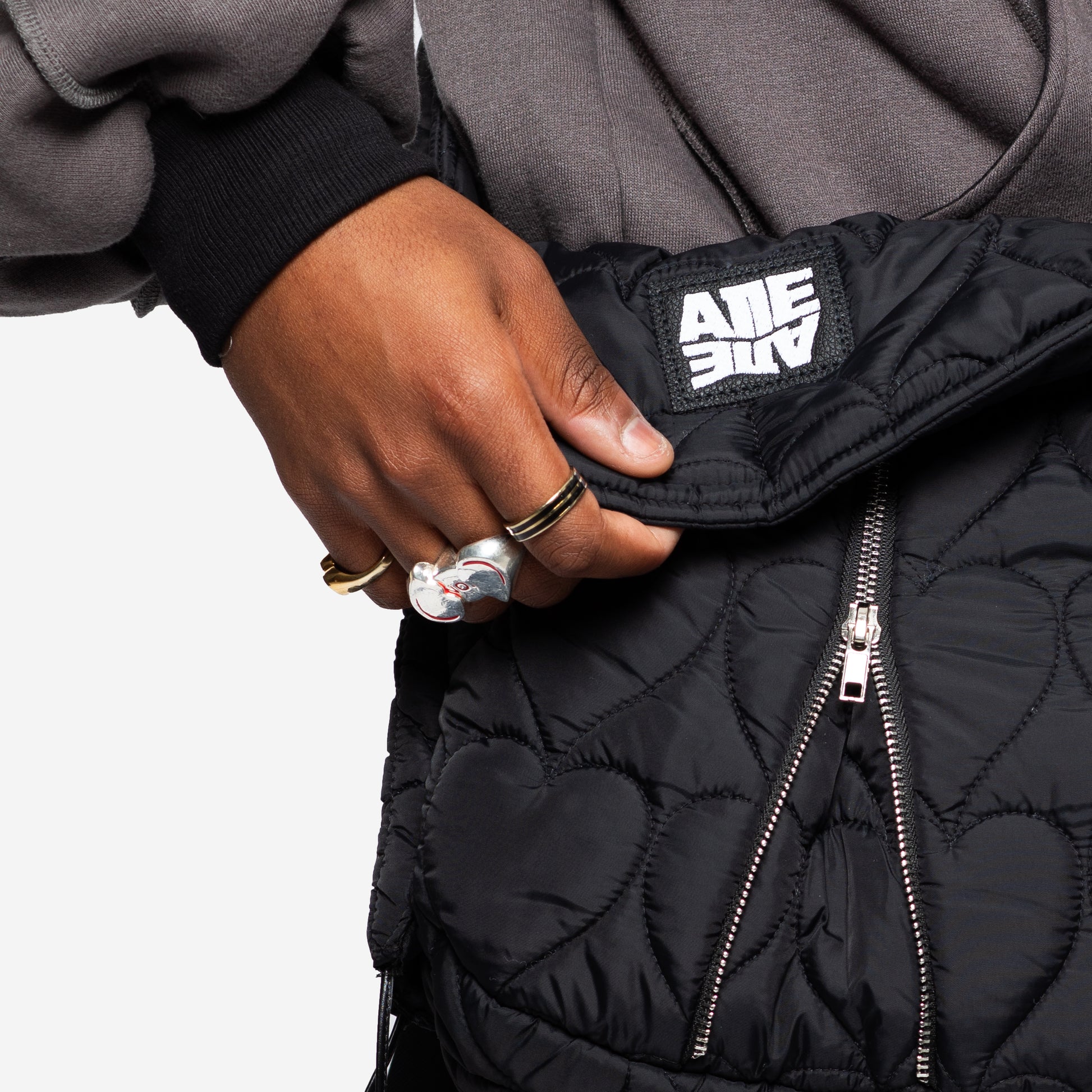 Quilted nylon crossbag/shoulder bag/handbag with large heart print with flap and hook-and-eye closure. White embroidery on a piece of leatherette. Interior pocket.