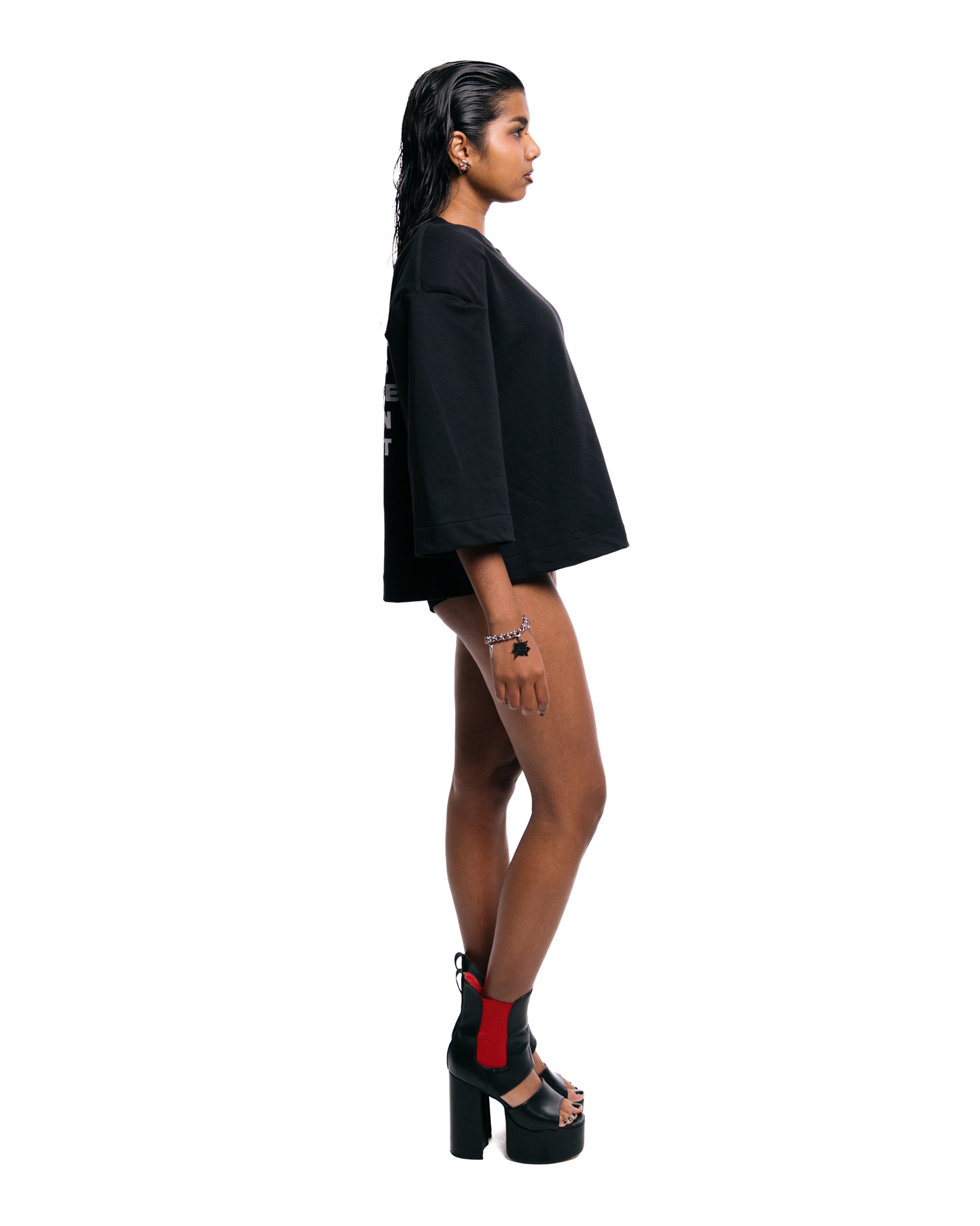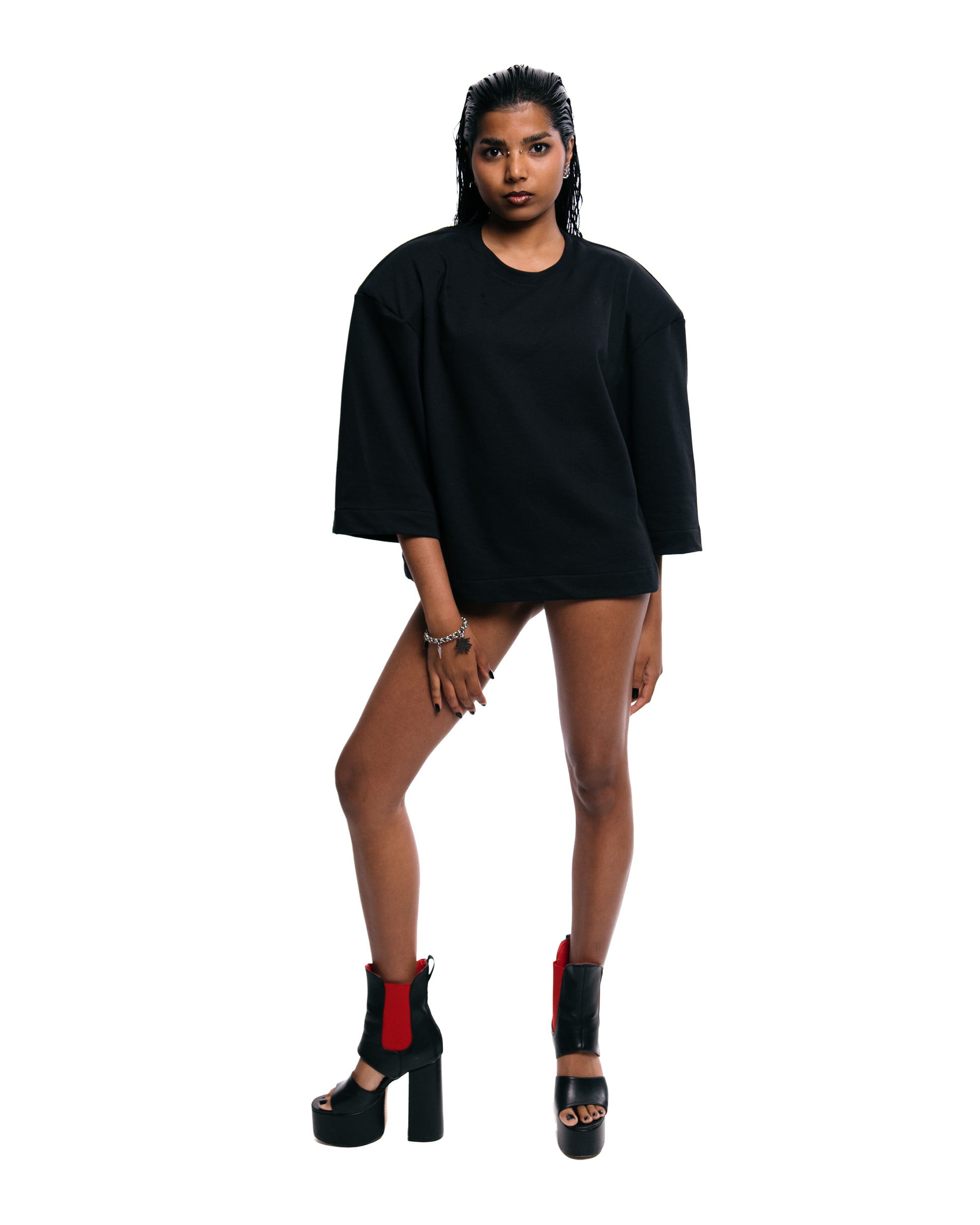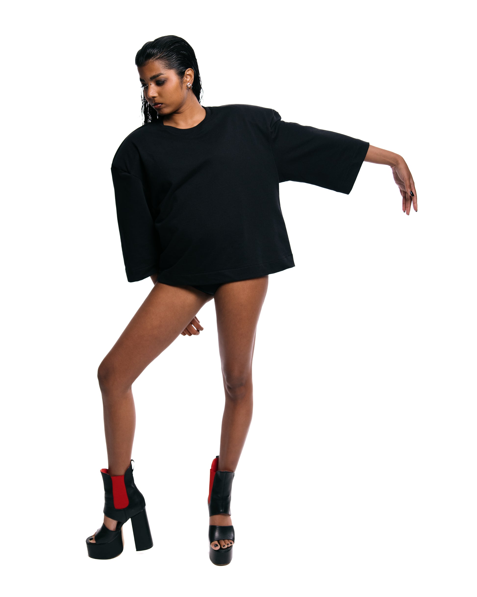 Short sleeve T-shirt with big shoulder pads. Detailed with an AILE COUTURE SCHOOL stamp logo. Printed with serigraphy technique on the back.