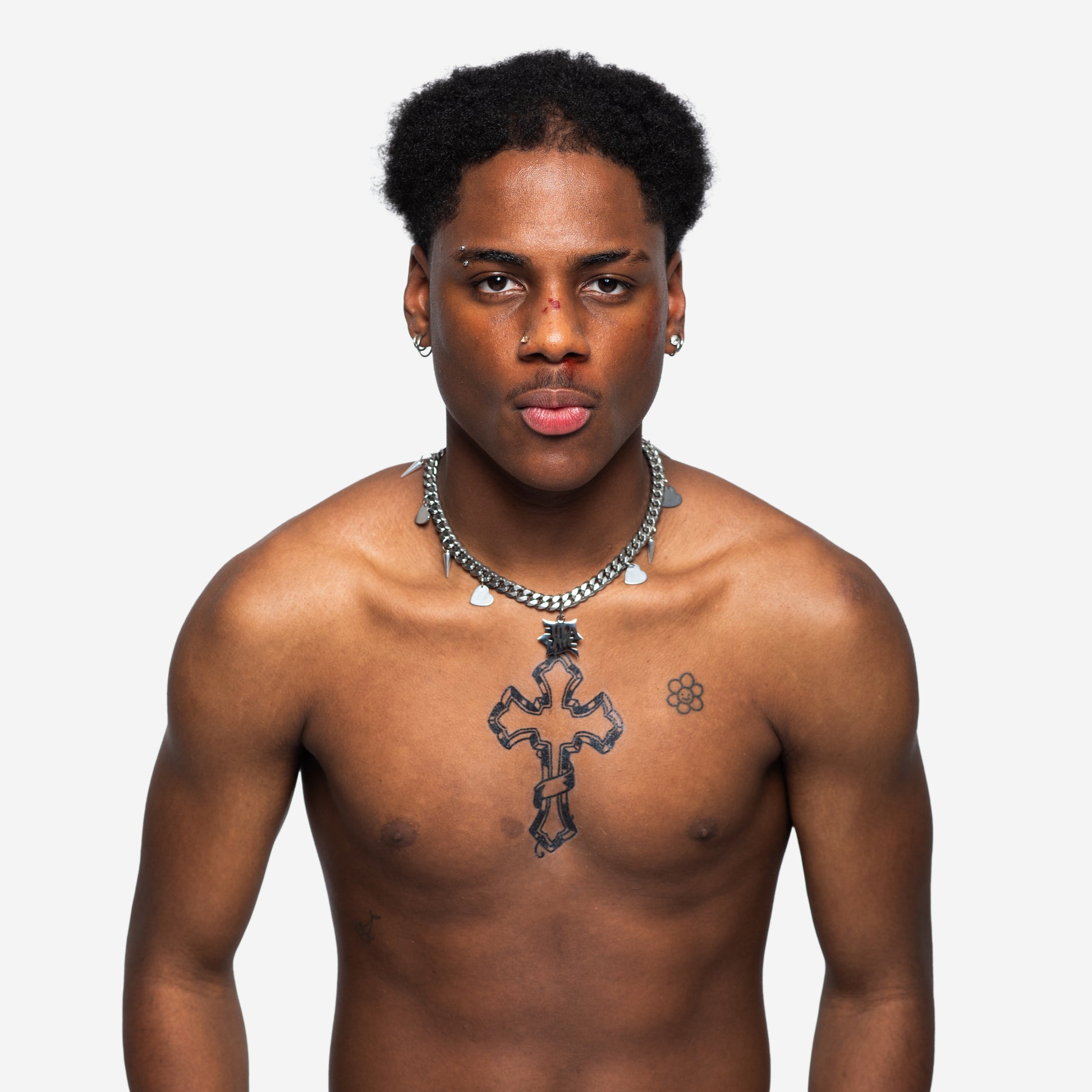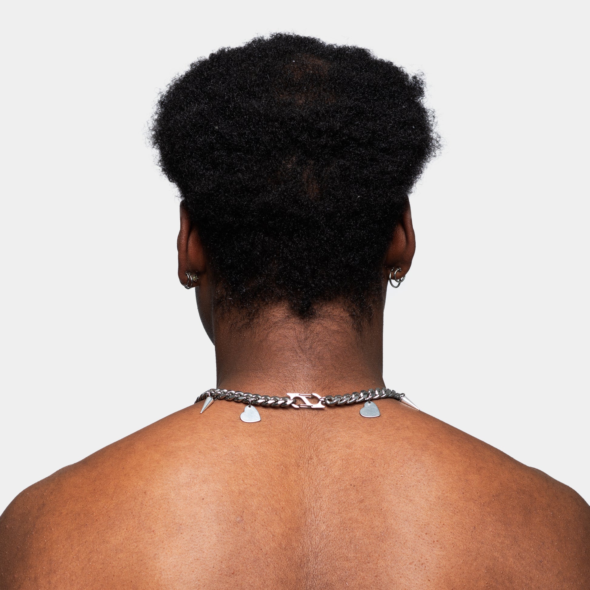 Stainless steel necklace with chain and charms. Front charm with AILE logo, studs and hearts.