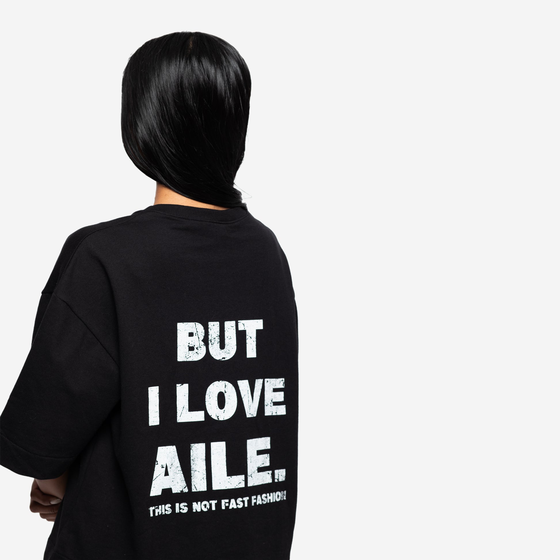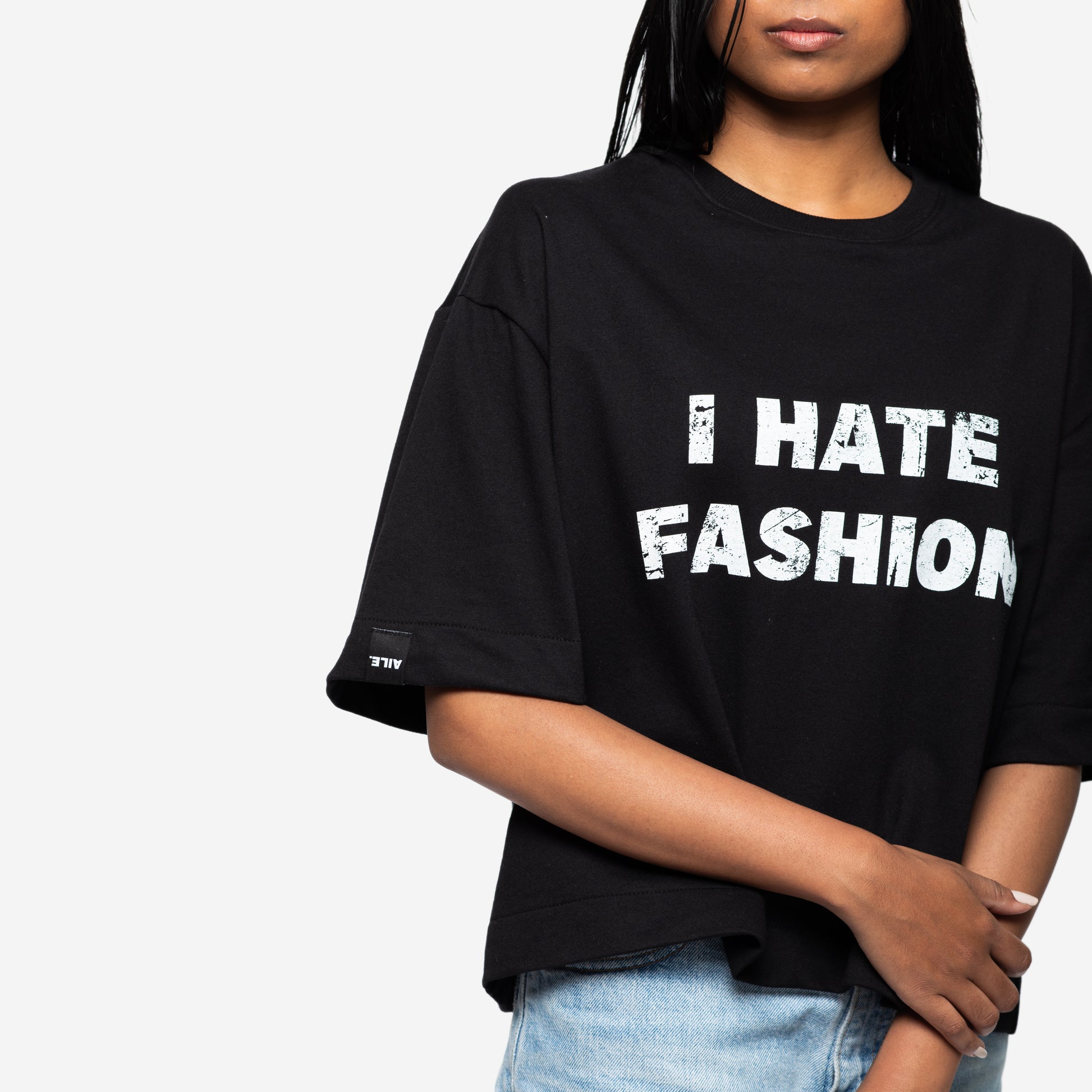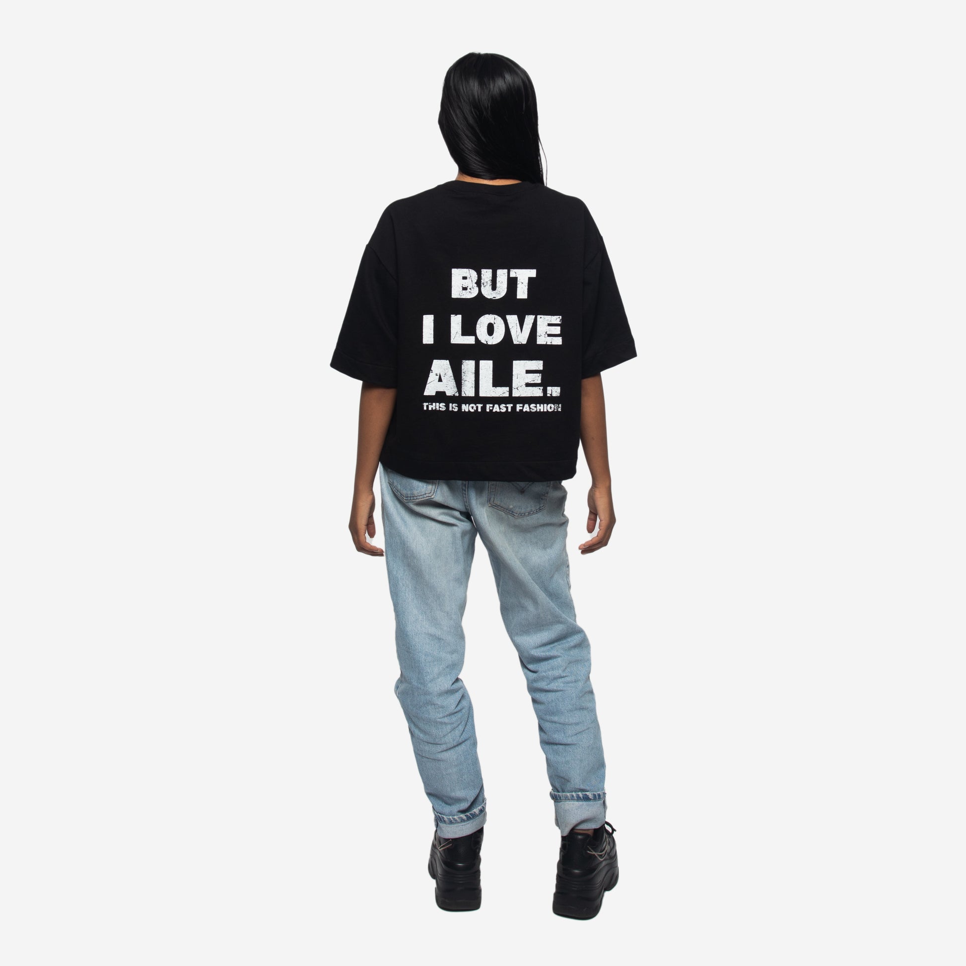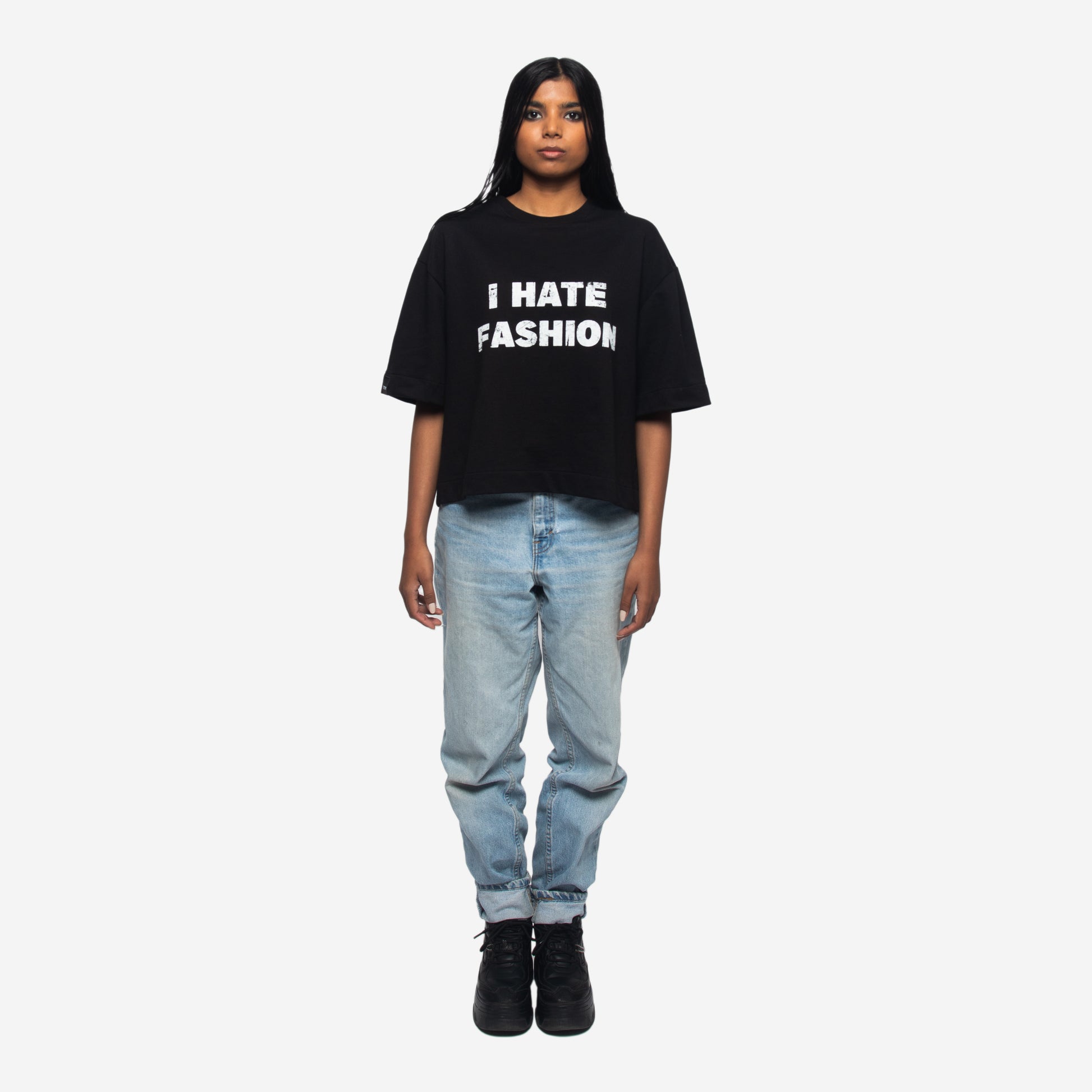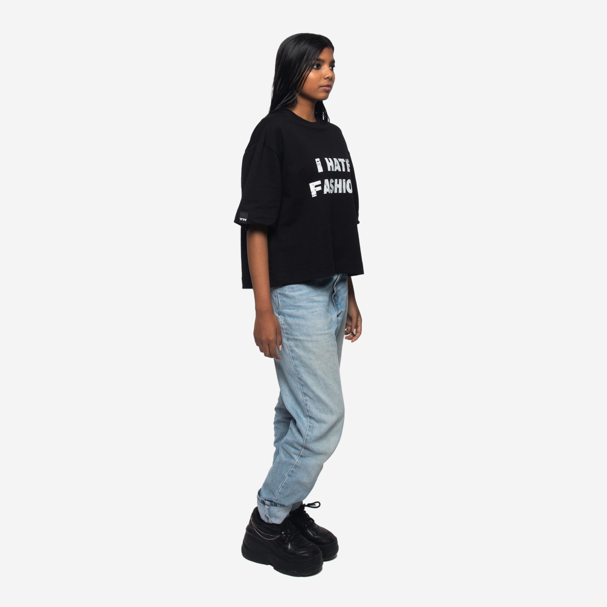 Cropped/boxy fit t-shirt in black. Front and back distressed screen printing.