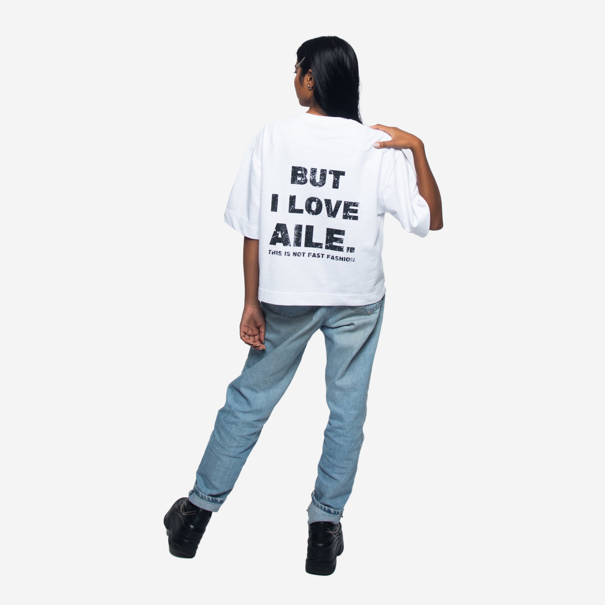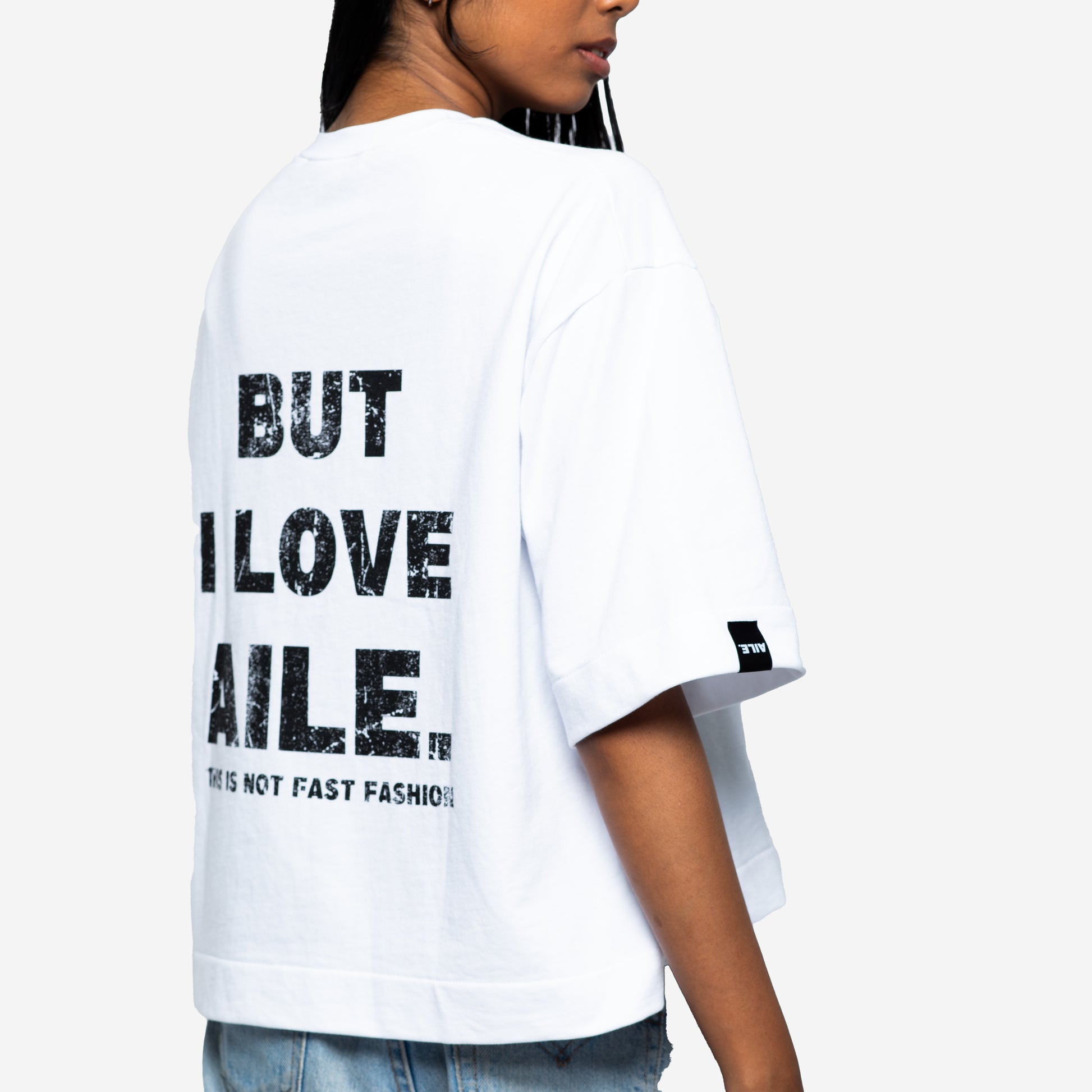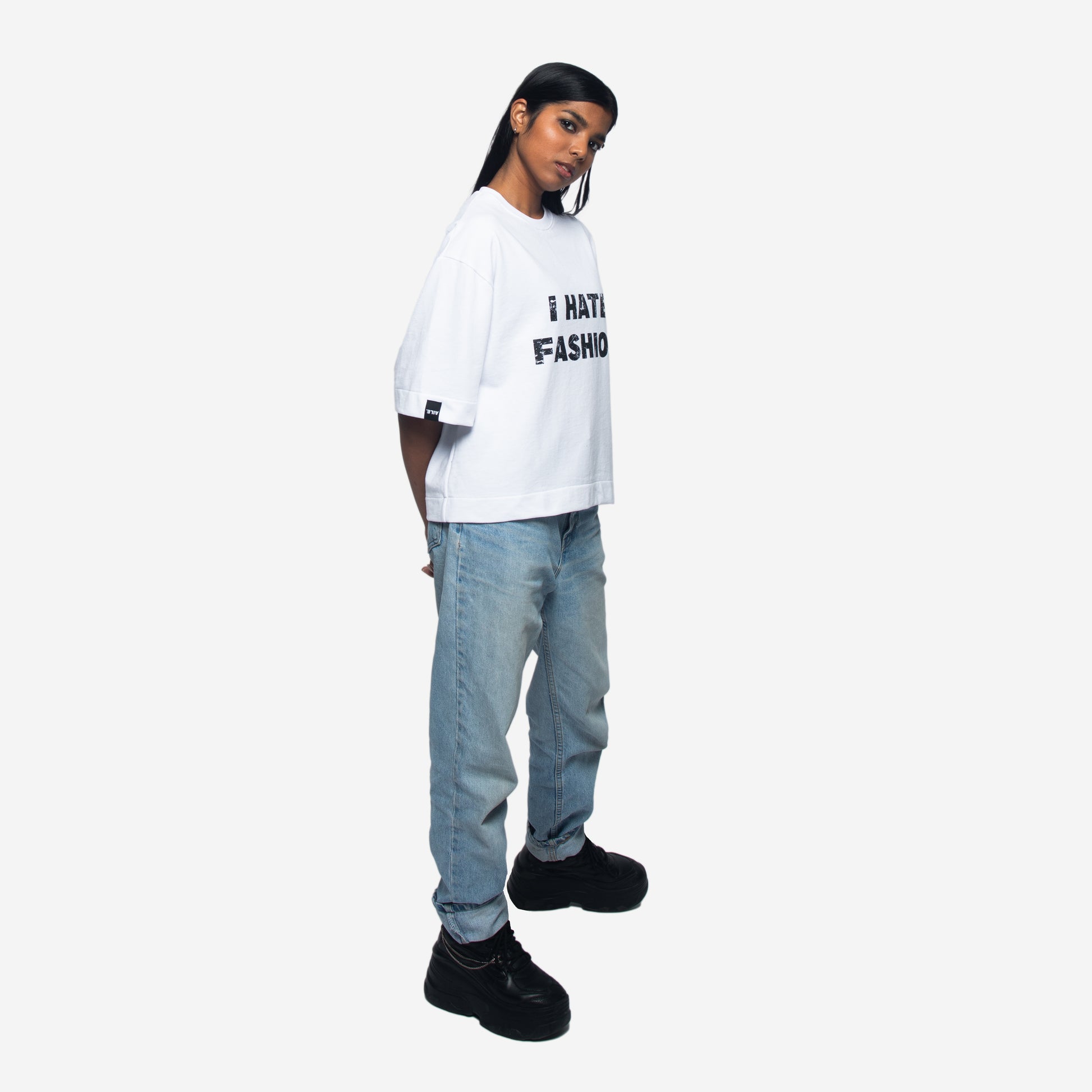 T-shirt with a cropped/boxy fit in white. Front and back distressed screen printing.