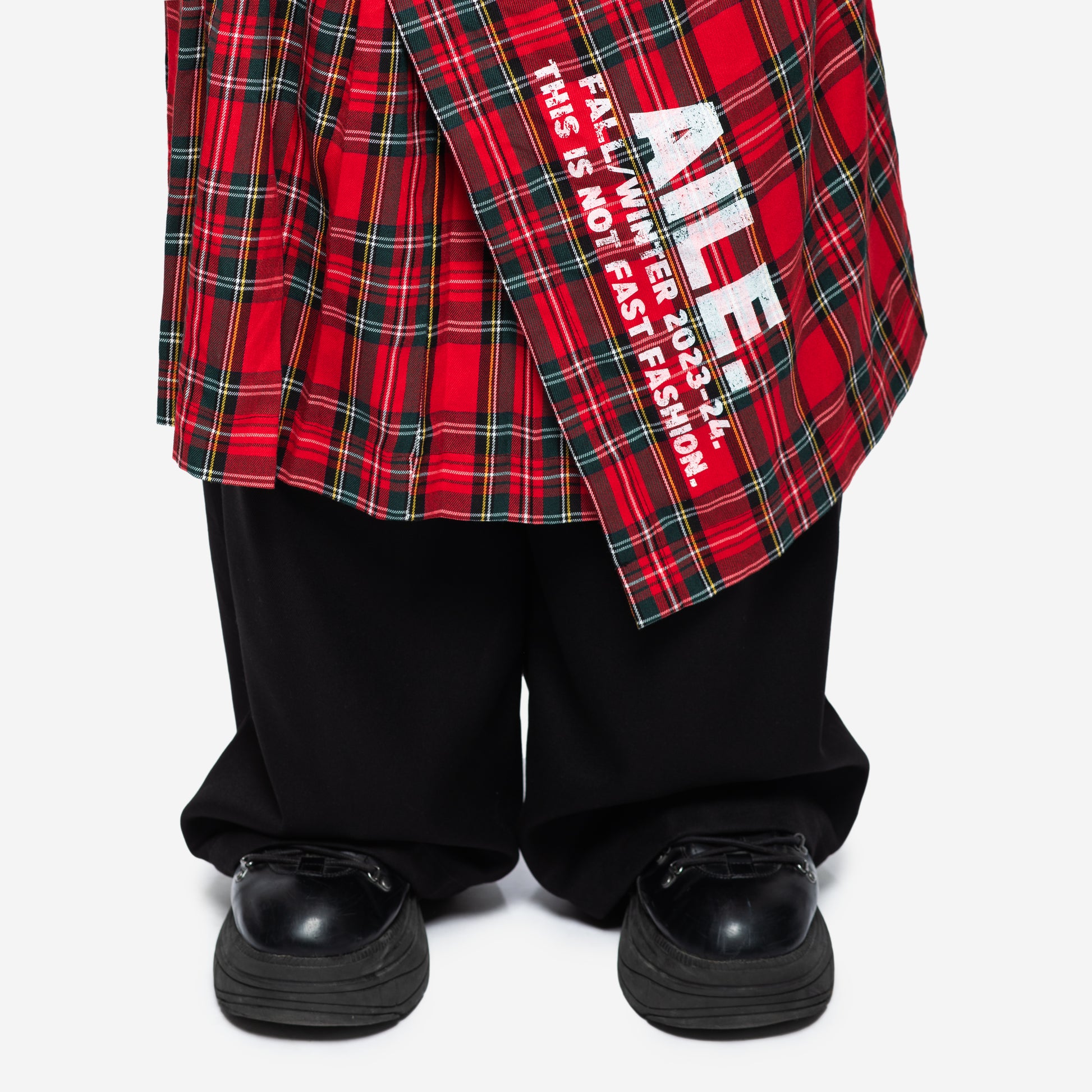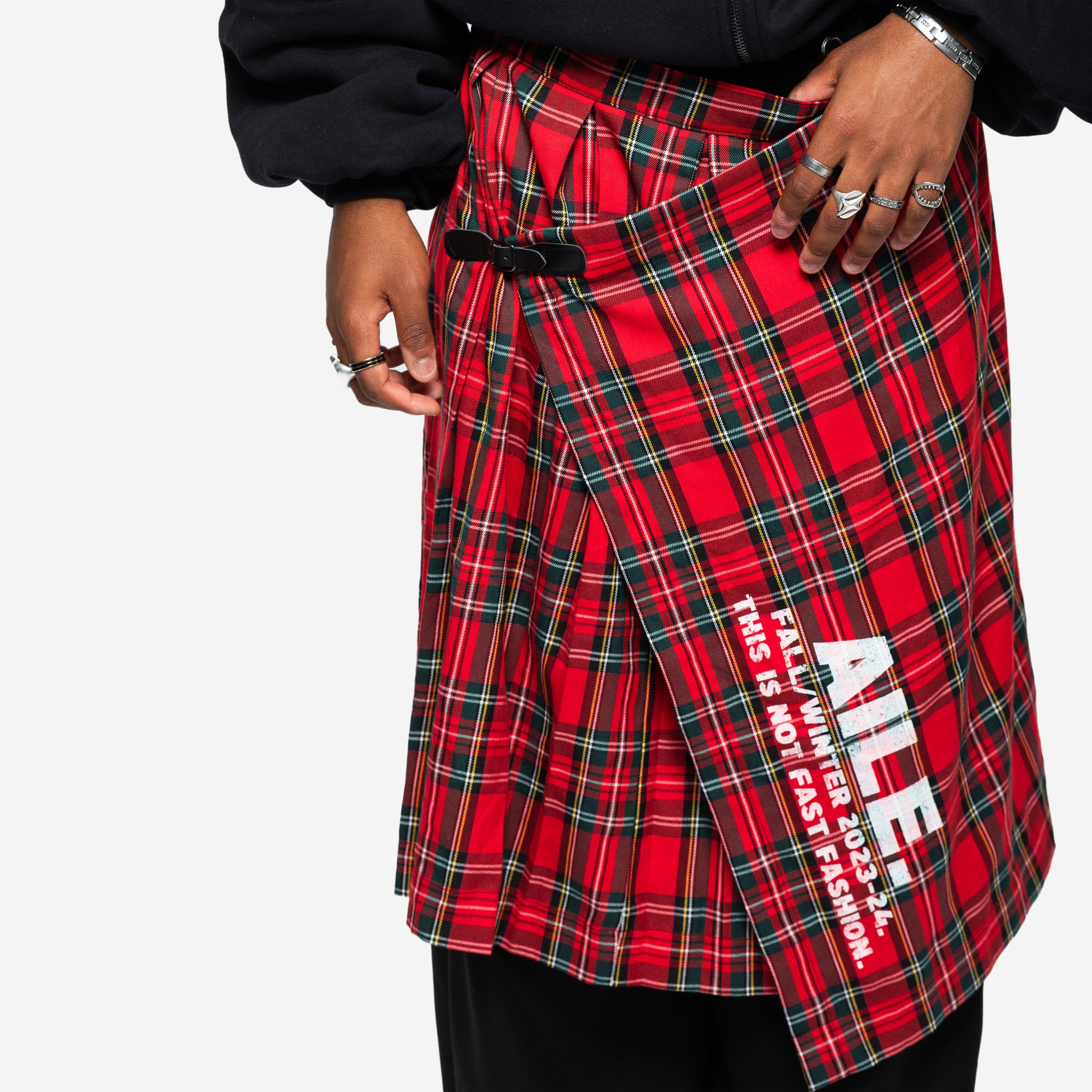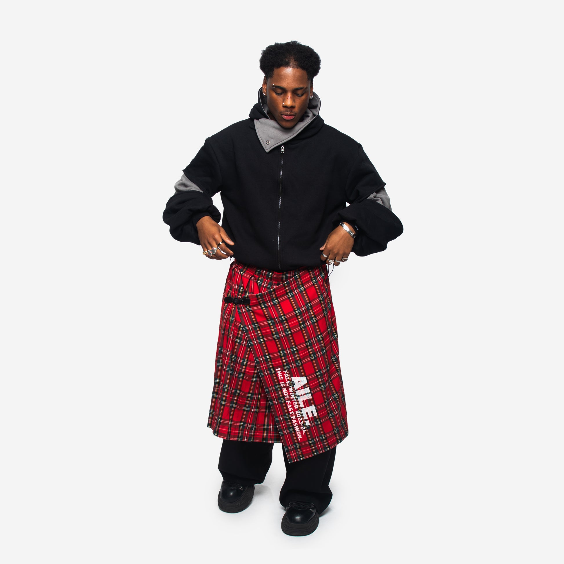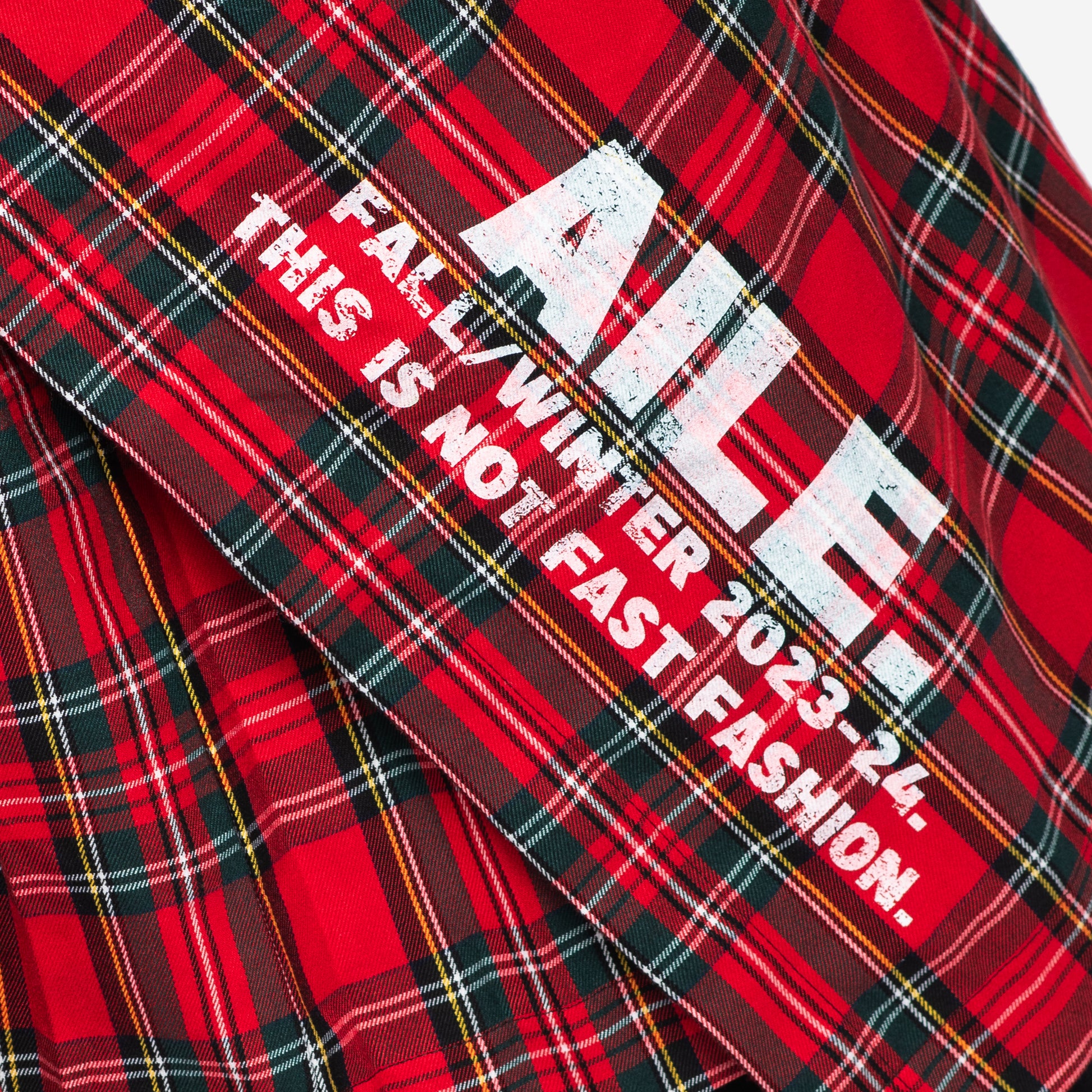 Asymmetrical tartan skirt. Adjuster inside the waist with 2 hooks and loops. Worn effect screen printing on the bottom of the skirt.