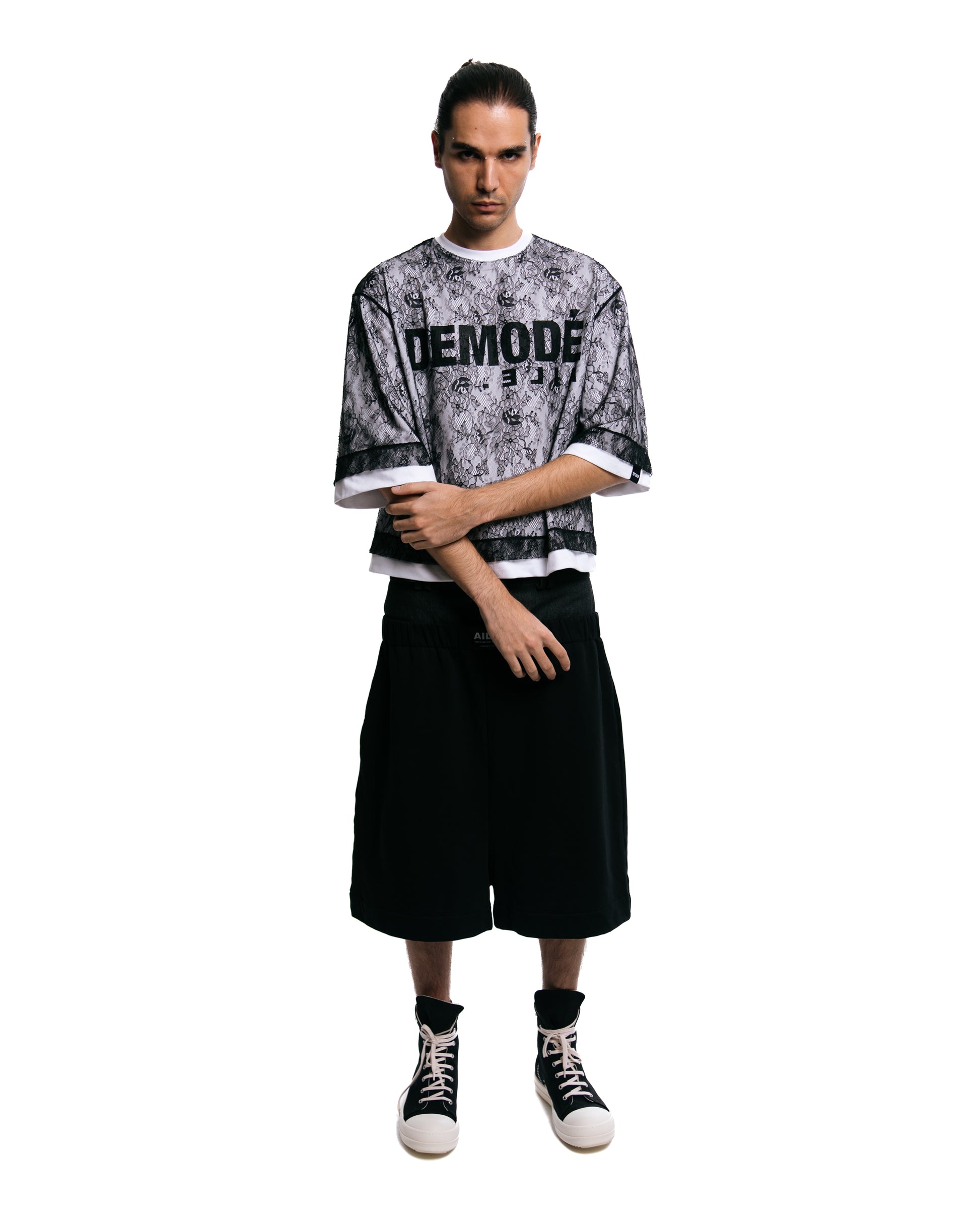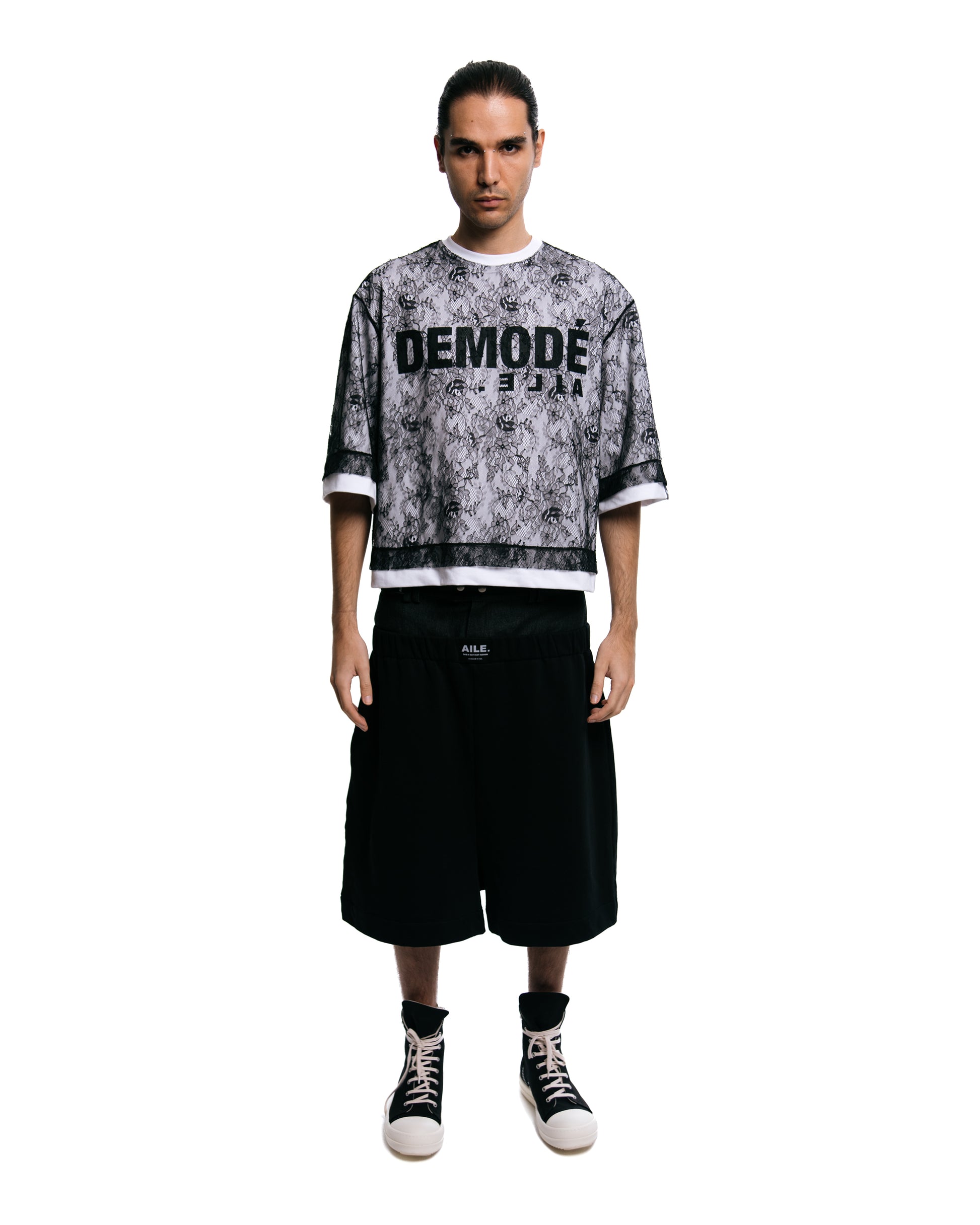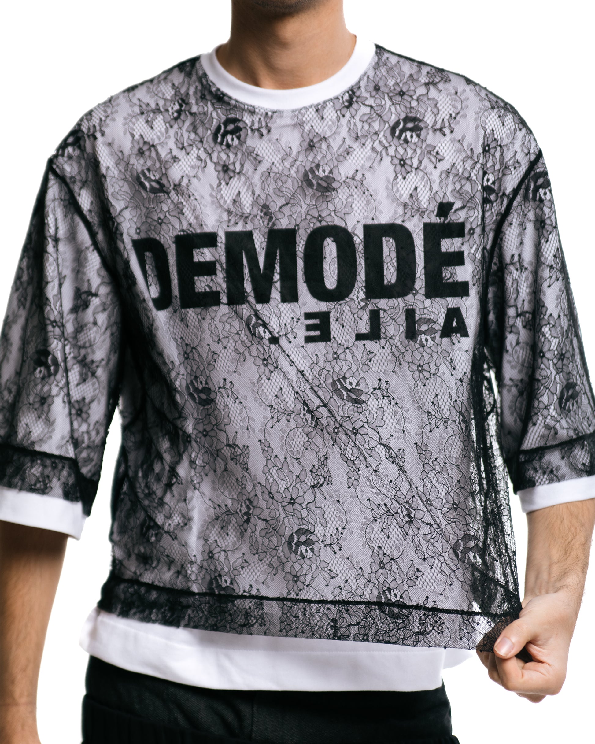 Double short sleeve T-shirt. White cotton t-shirt with black lace t-shirt overlay. Detailed with an "DEMODÉ, AILE" stamp logo.