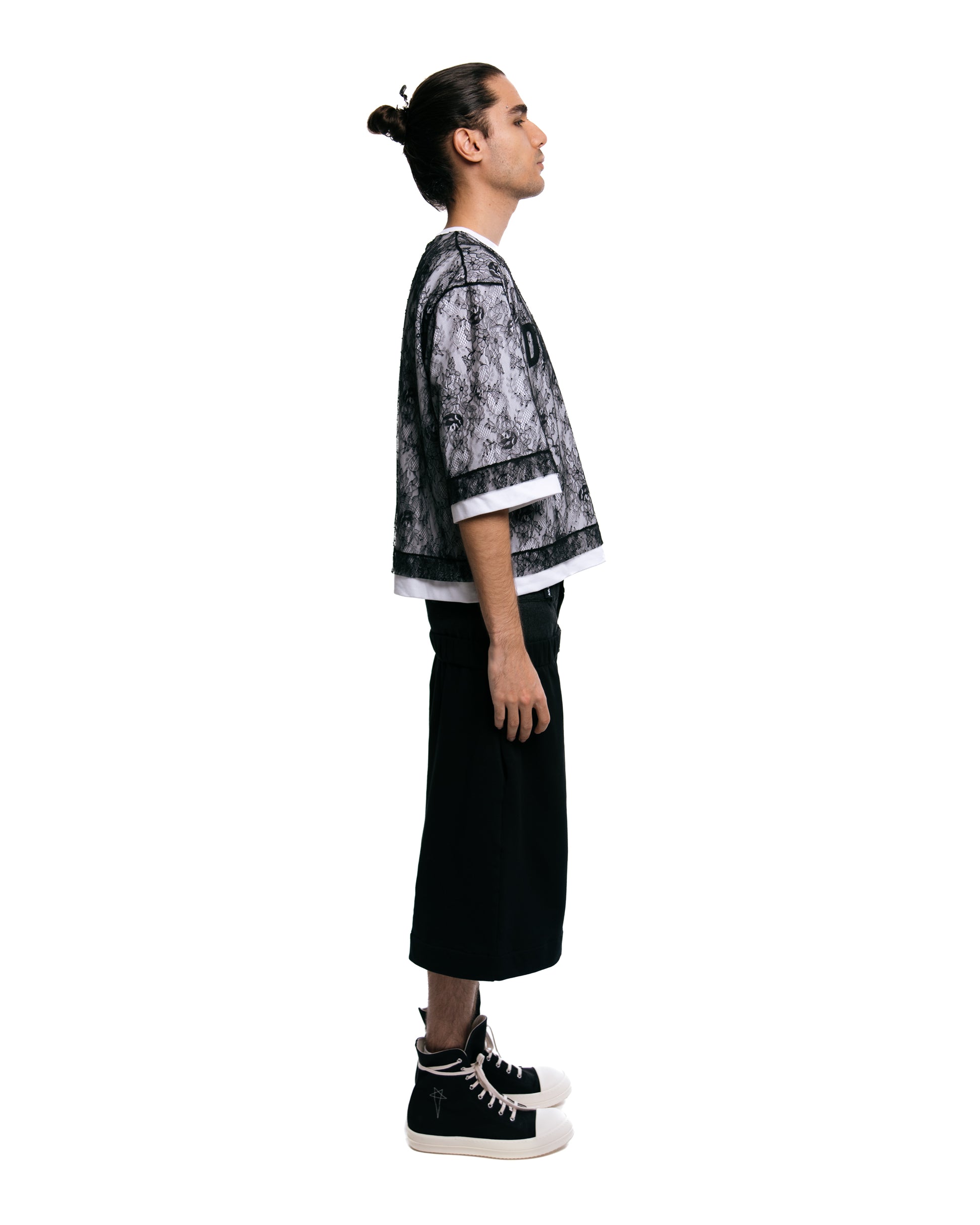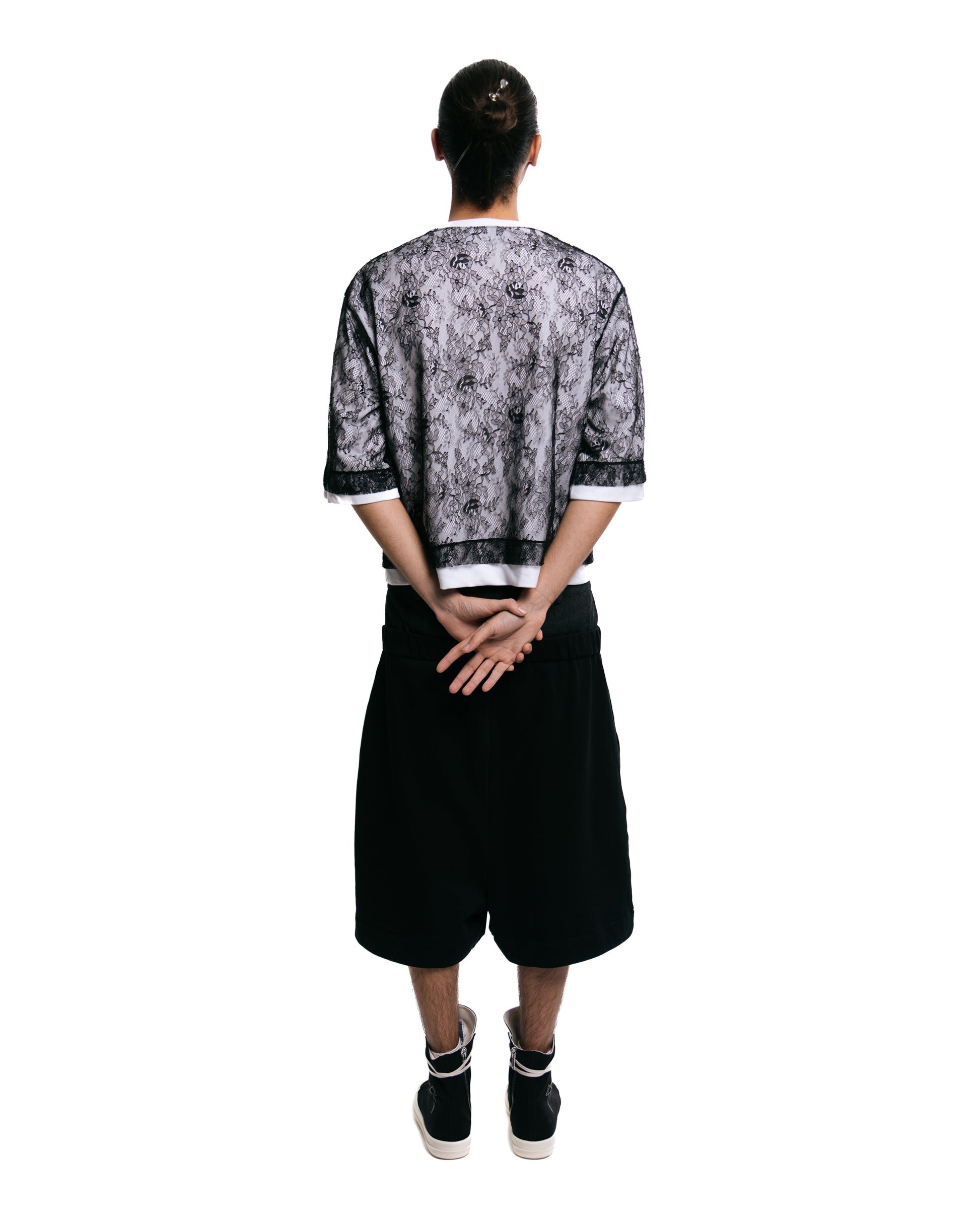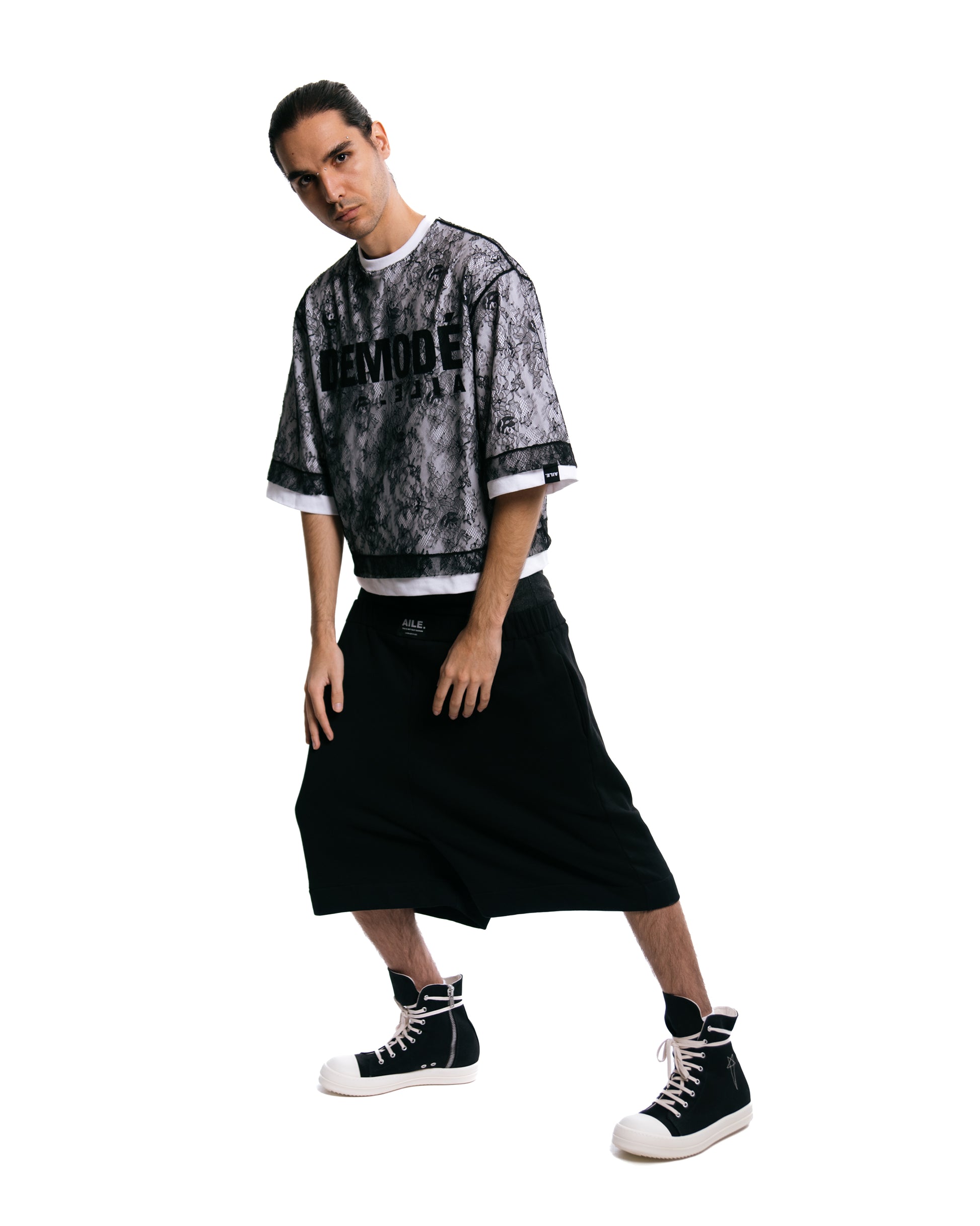 Double short sleeve T-shirt. White cotton t-shirt with black lace t-shirt overlay. Detailed with an "DEMODÉ, AILE" stamp logo.