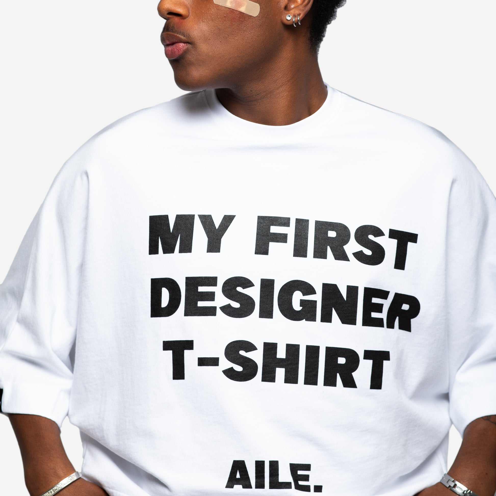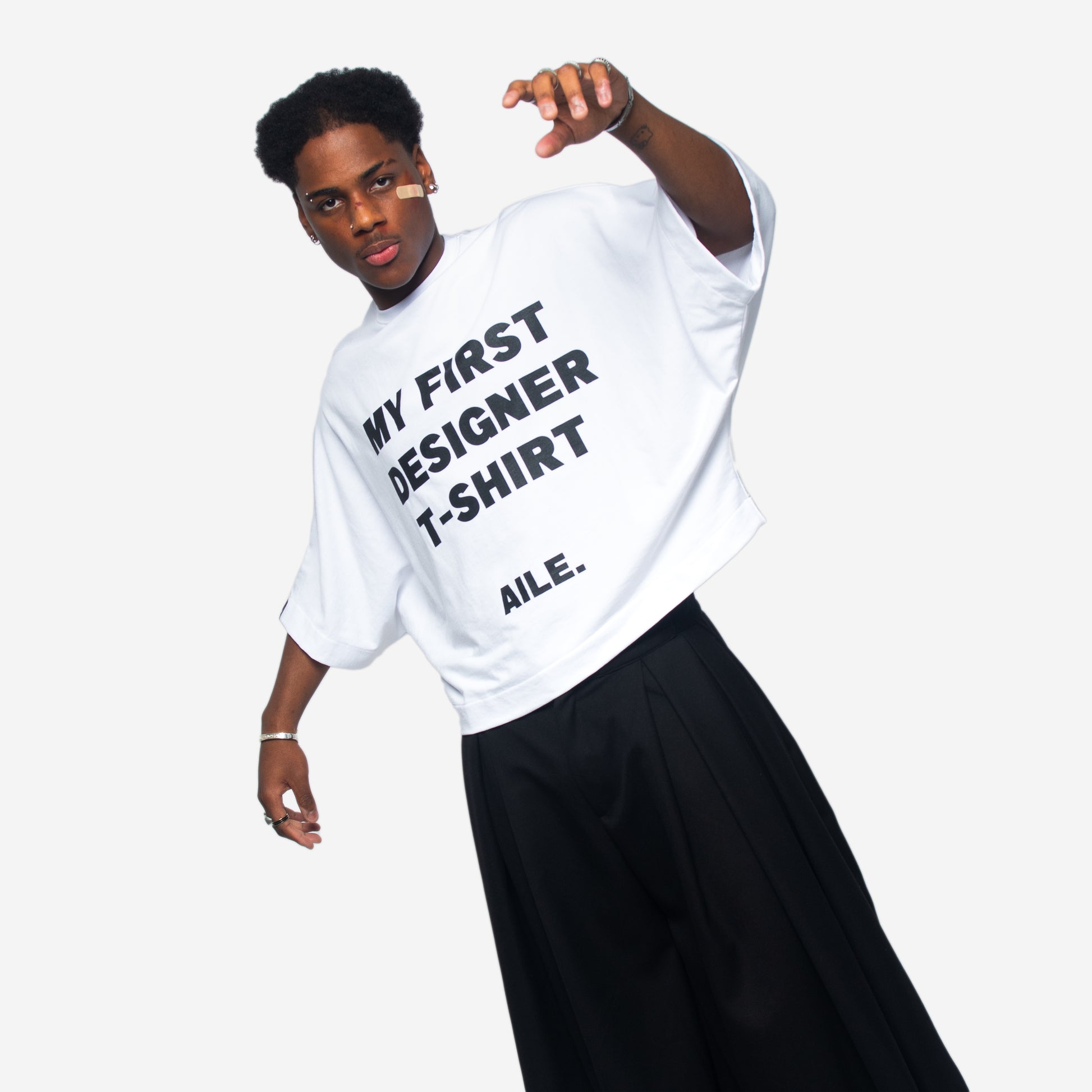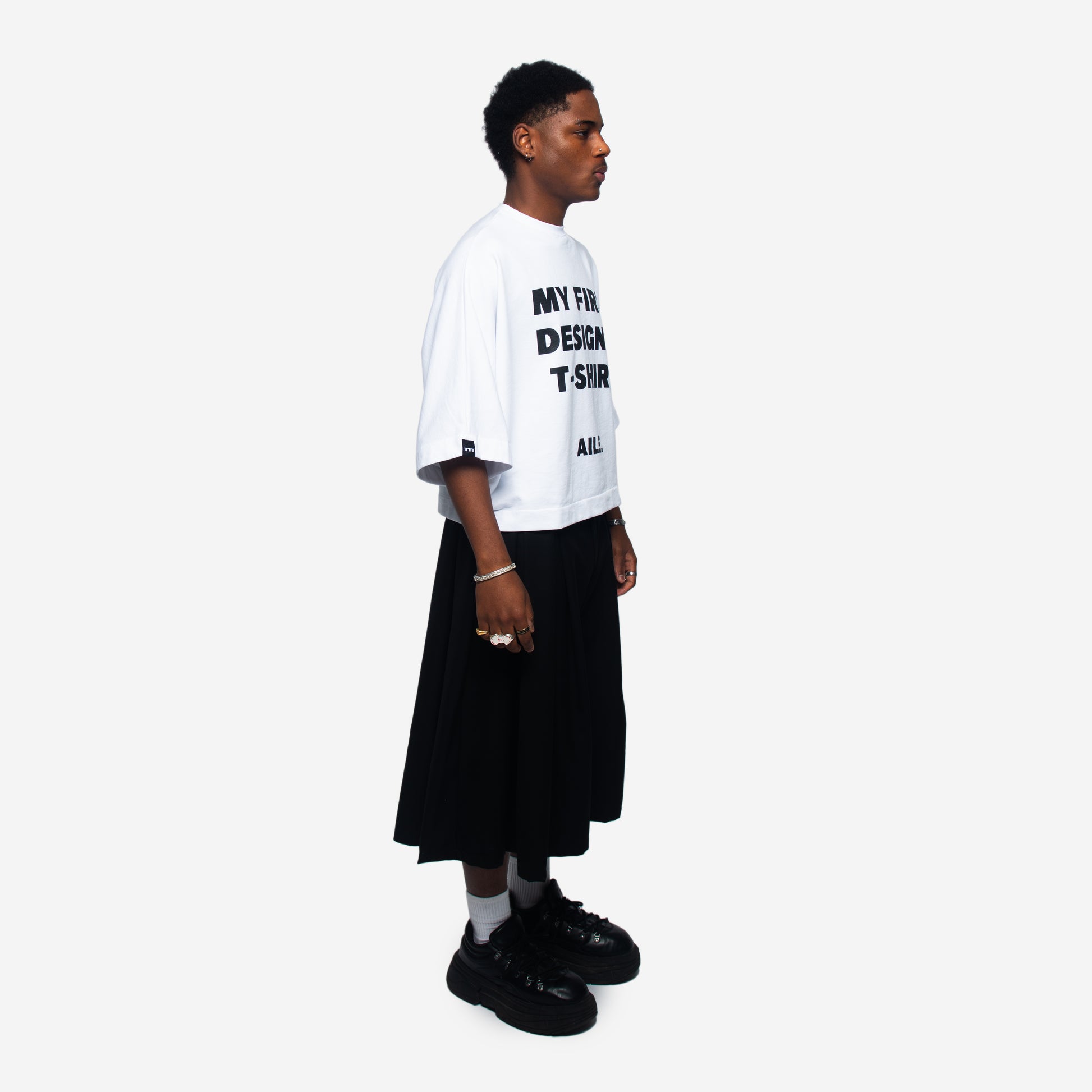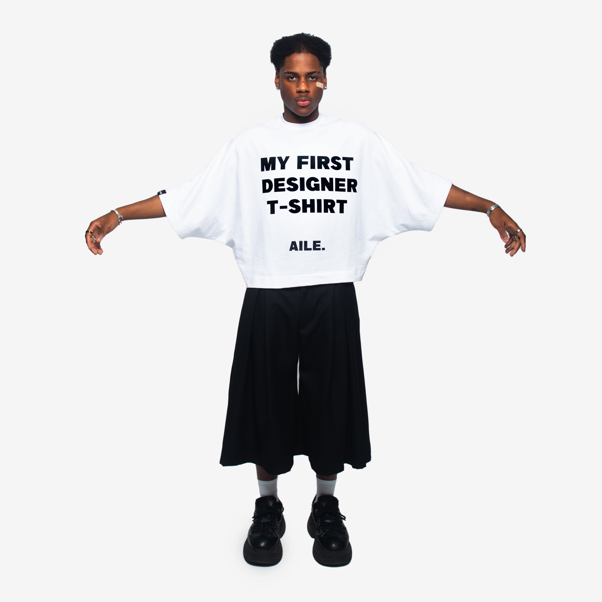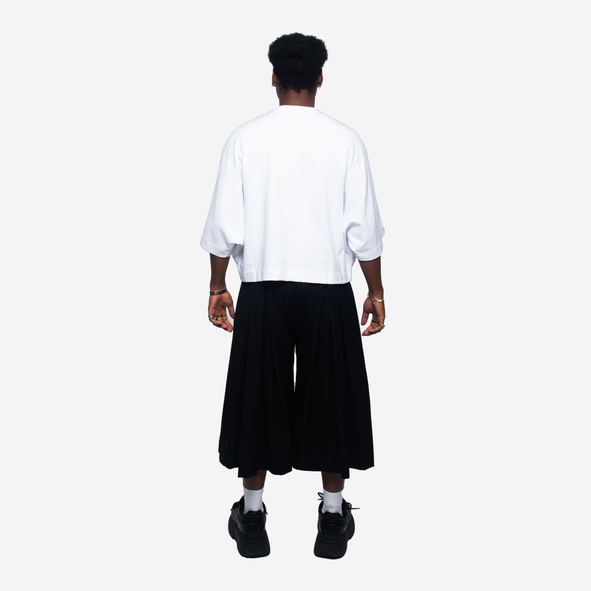 T-shirt with bat sleeves, cropped/boxy fit in white. Screen printing in black.