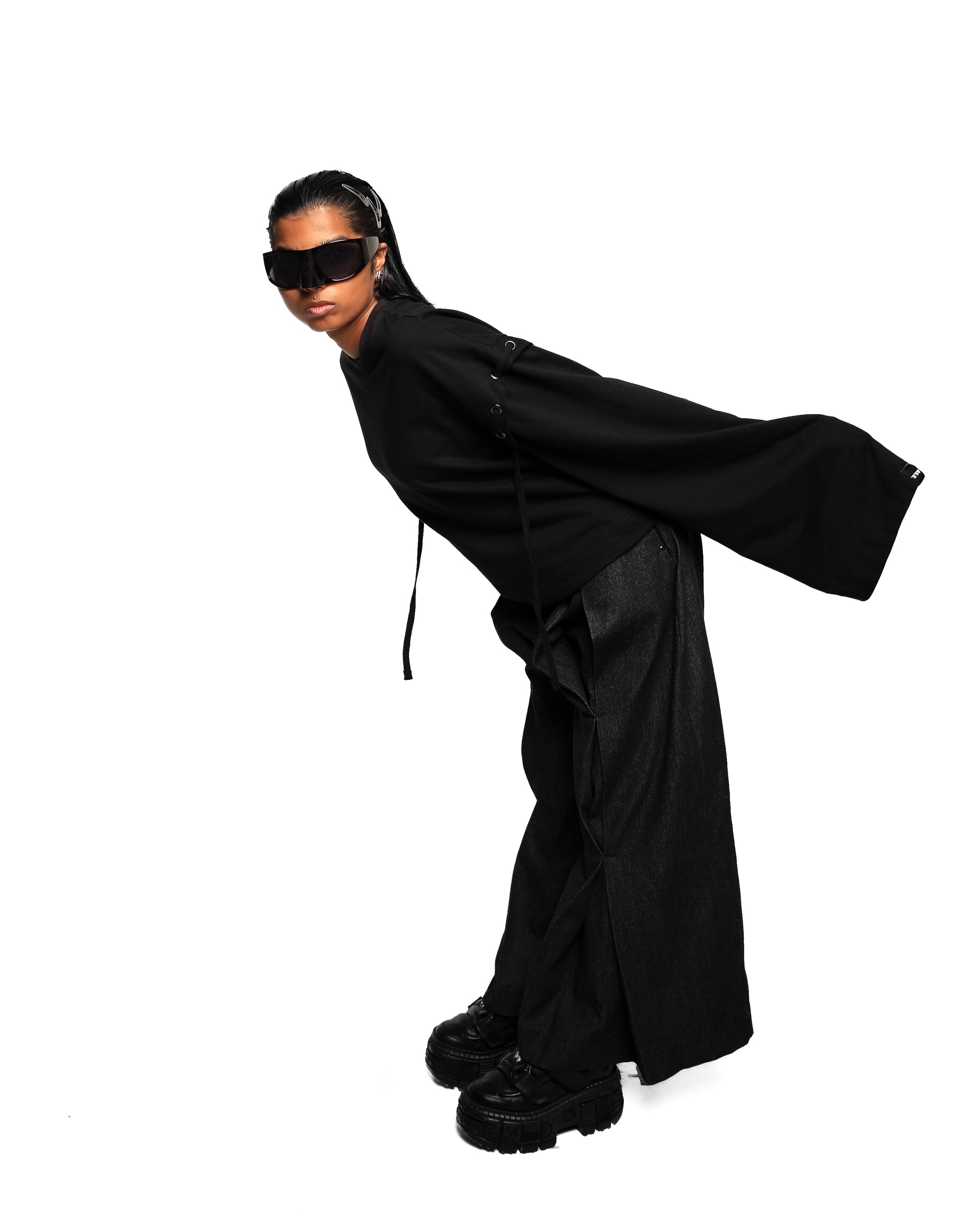 Black t-shirt with shoulder pad effect on long sleeves. Studs on shoulder pad with removable cords. White logo on the back of the t-shirt made with a high quality screen printing technique.