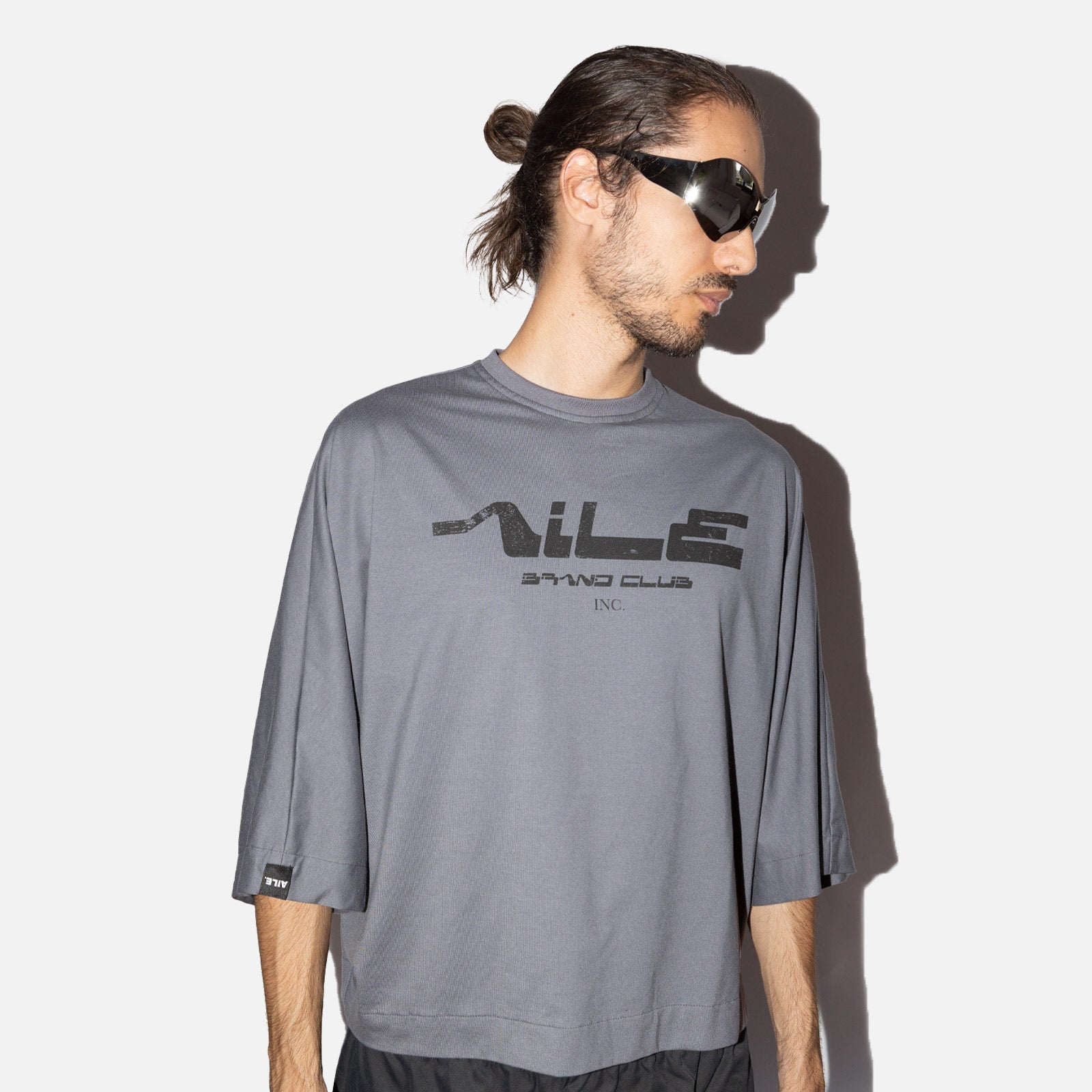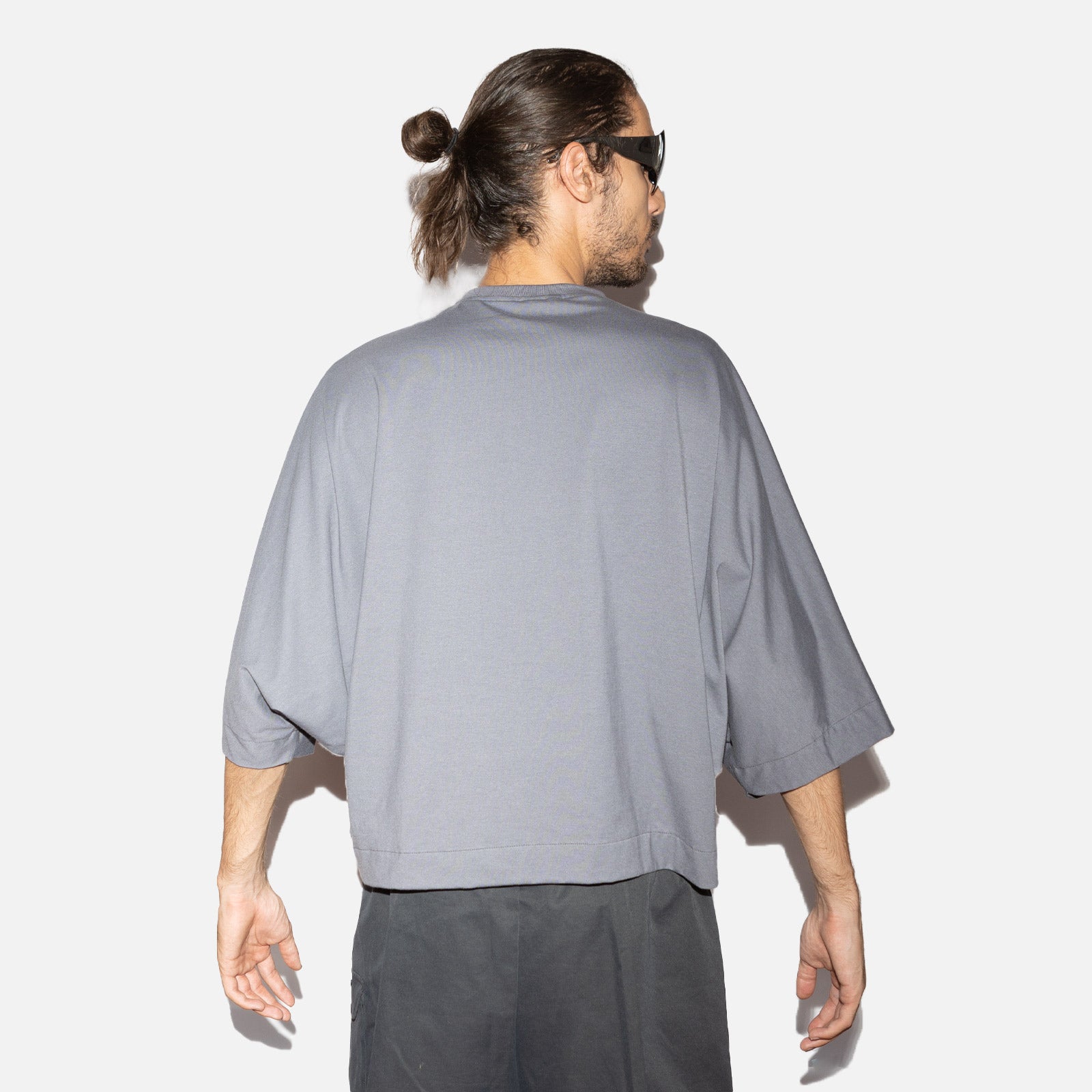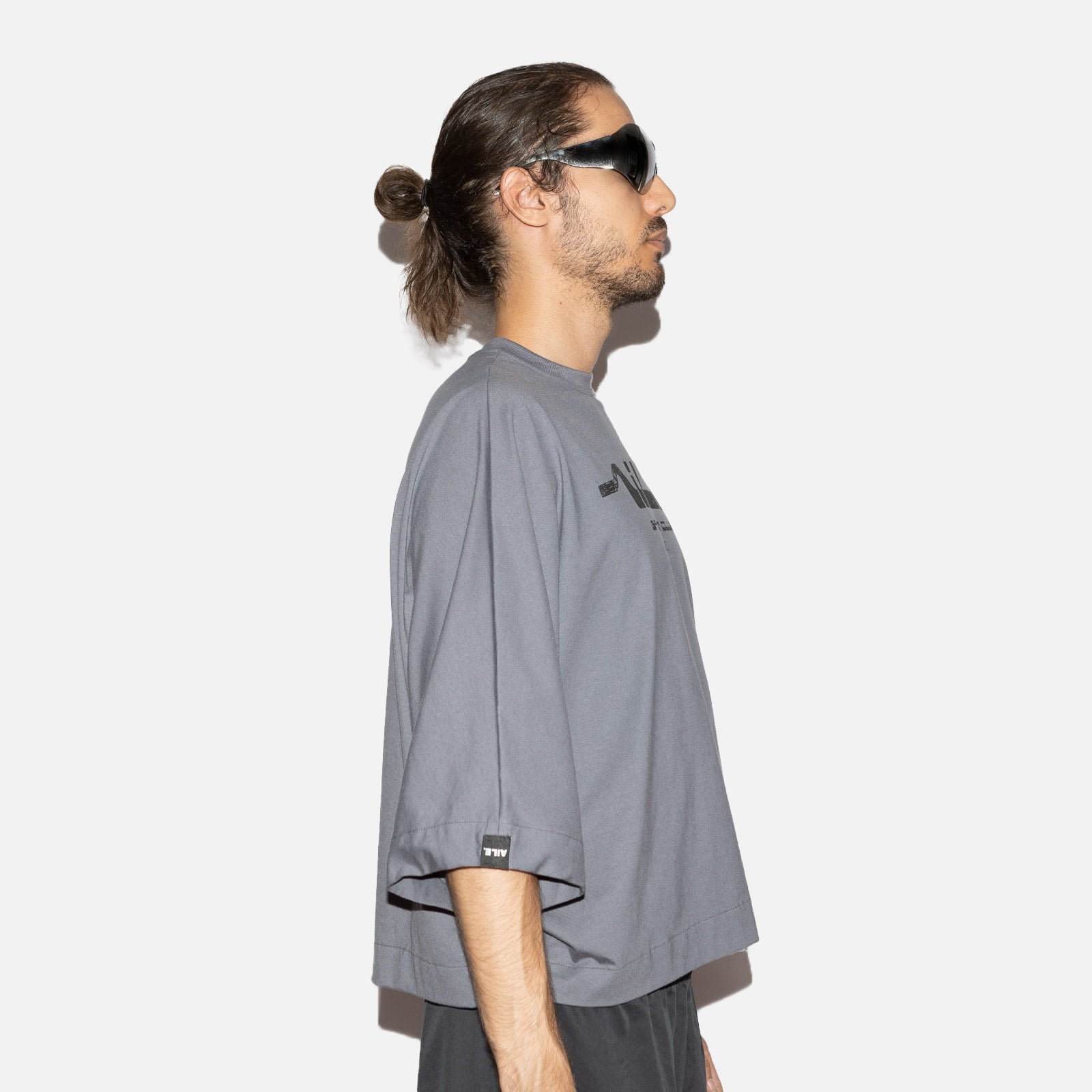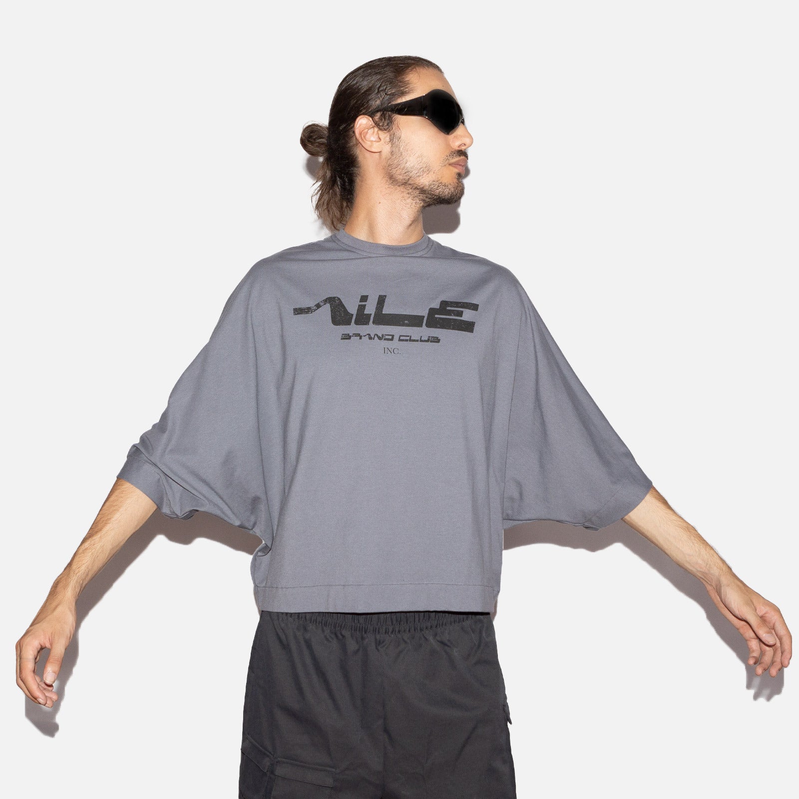 Gray t-shirt with batwing sleeves. Distressed print in black.