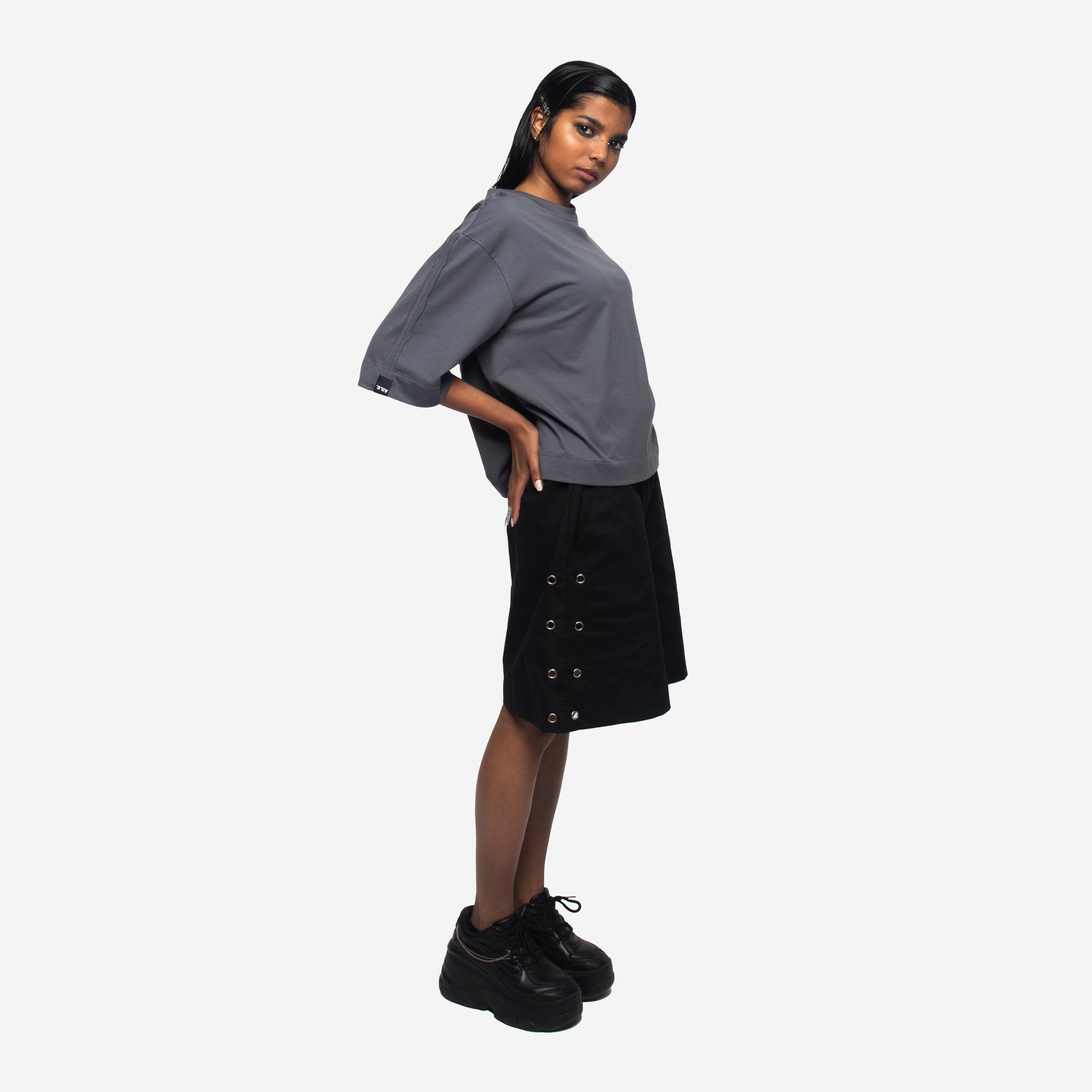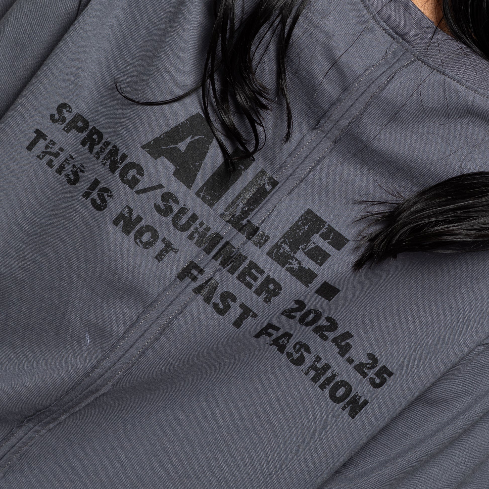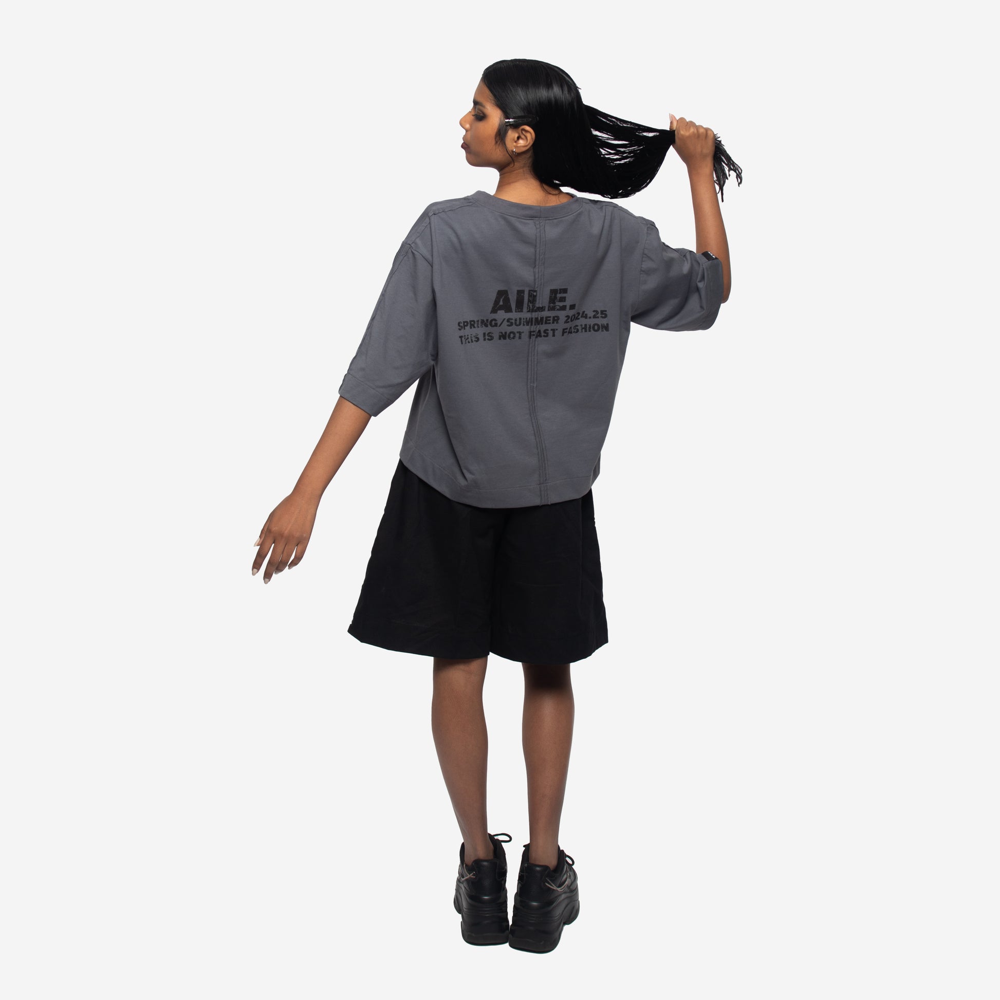 T-shirt with a cropped/boxy fit in gray with a single seam on the hemmed back and seamless sides. Screen printing on the back with a worn effect.