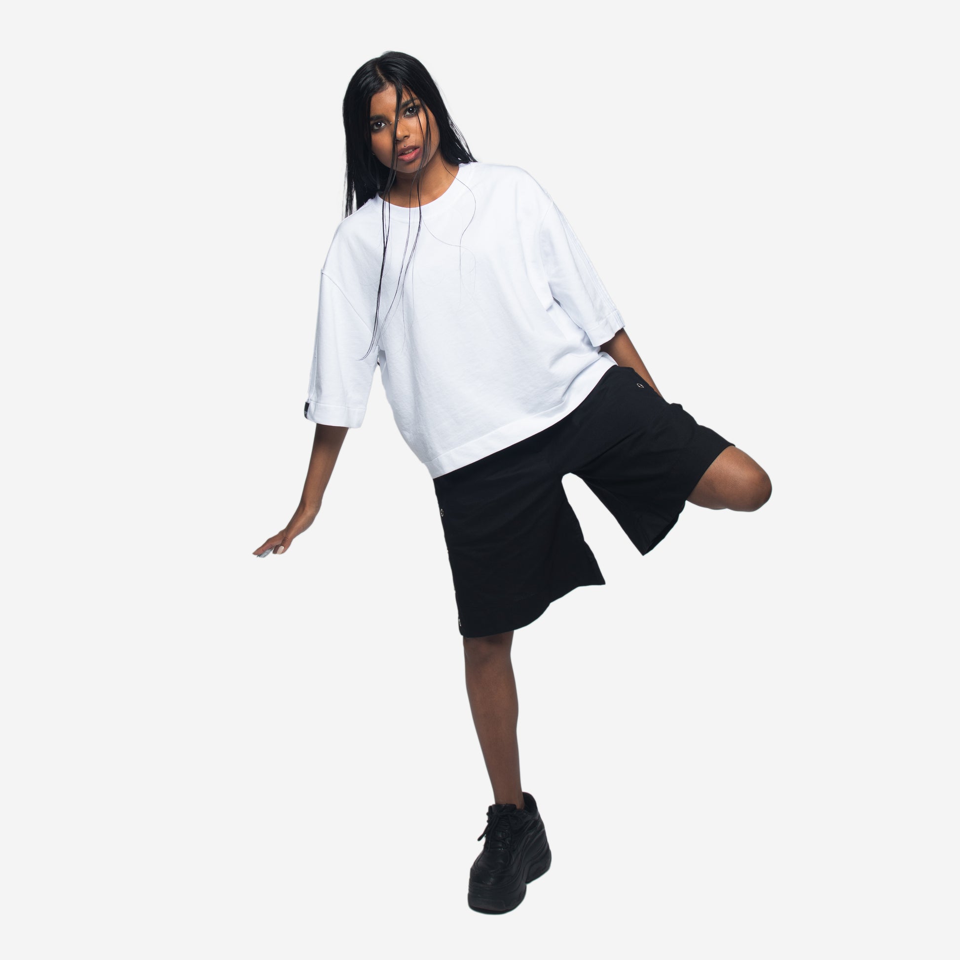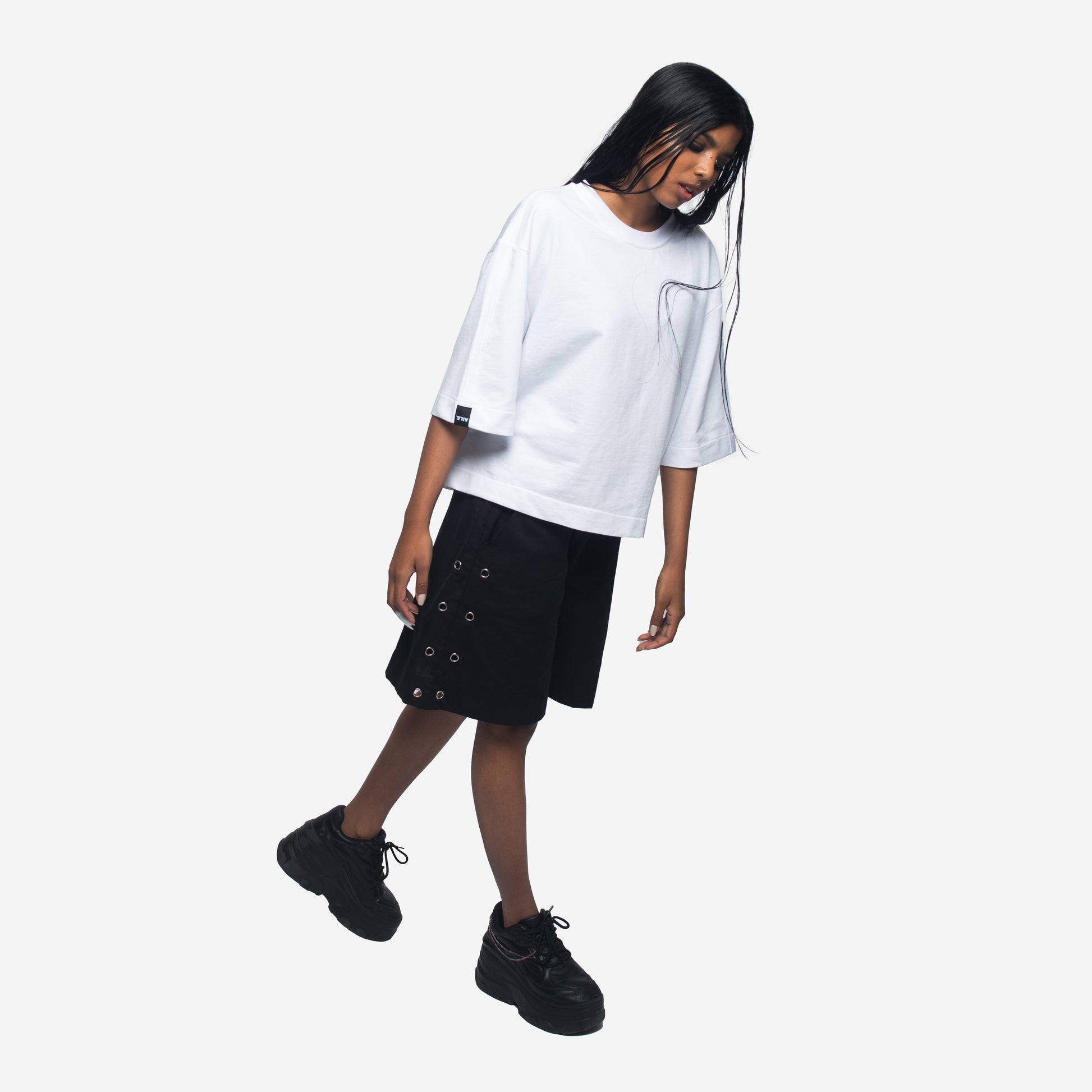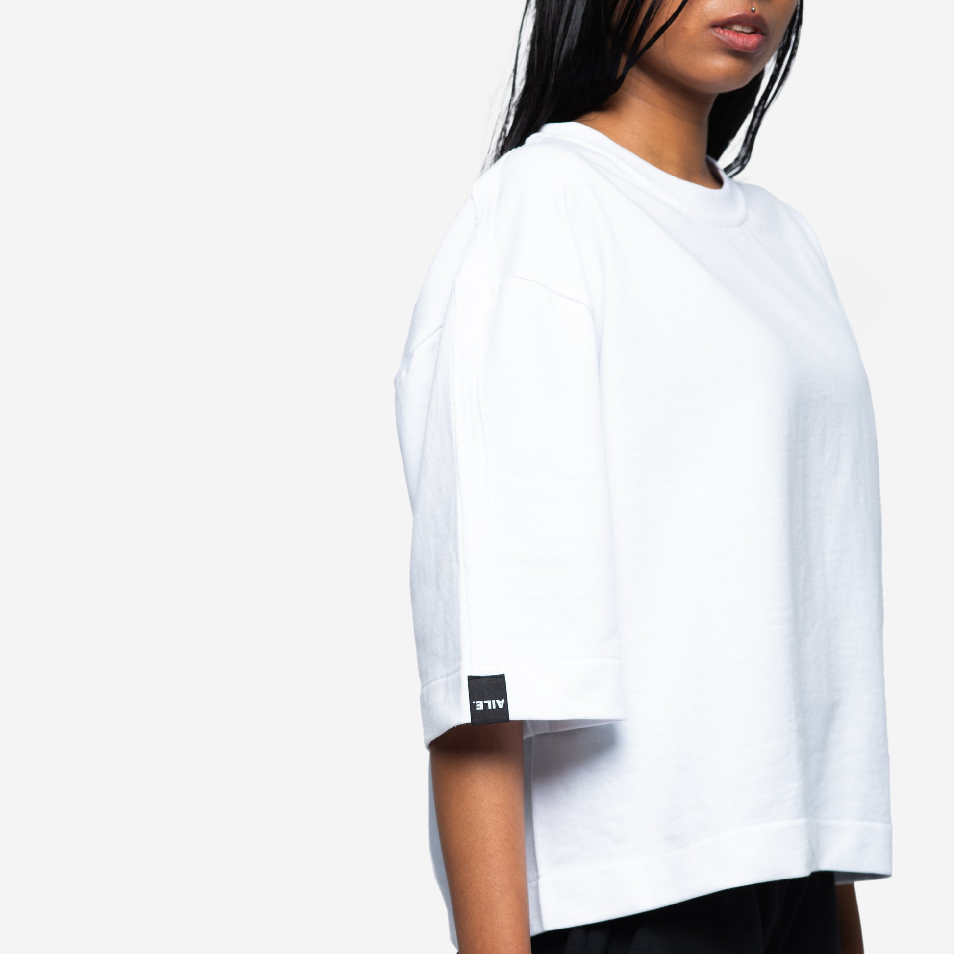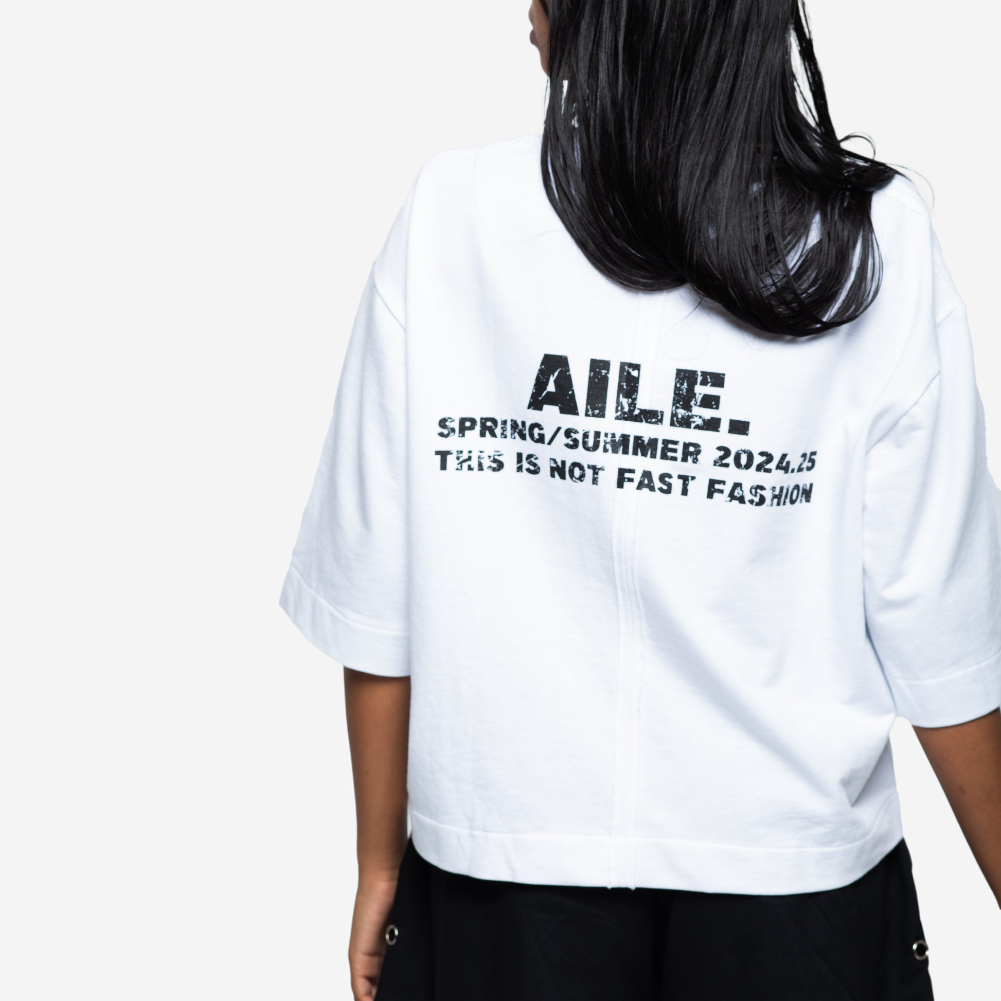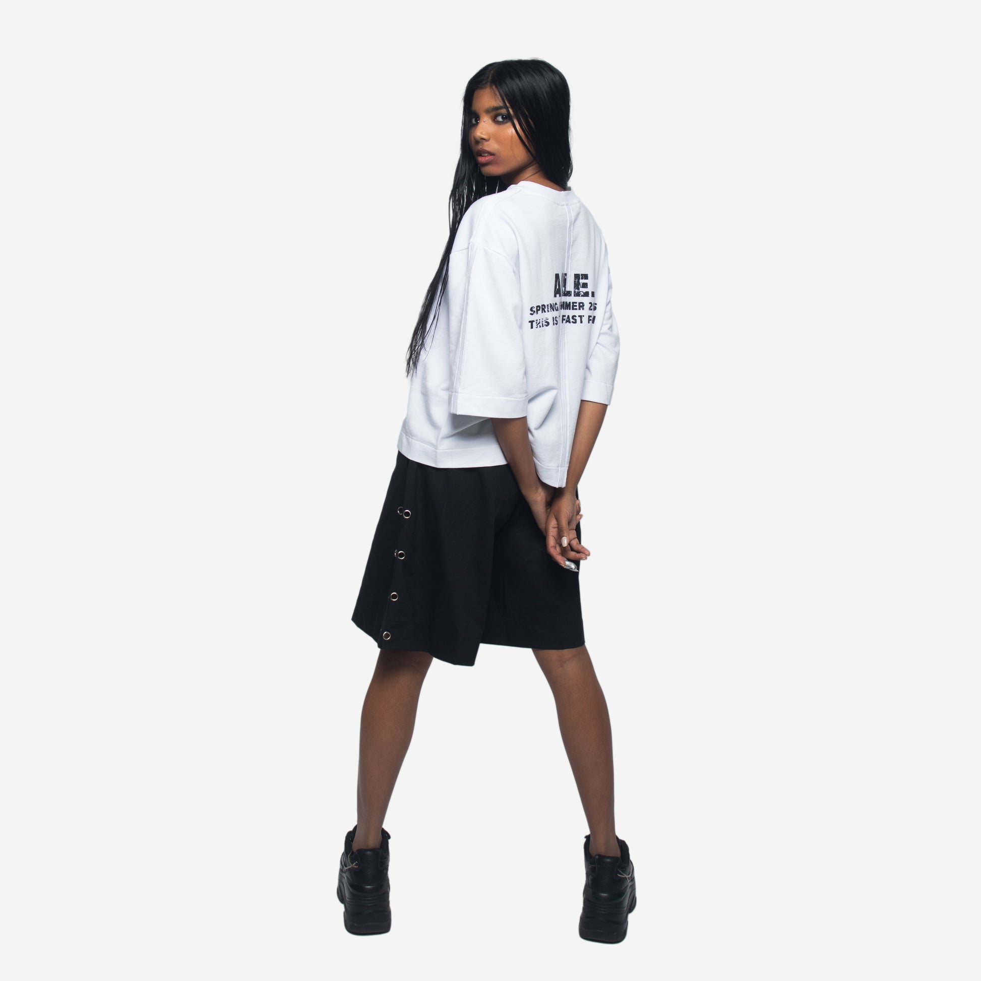 T-shirt with a cropped/boxy fit in white with a single seam on the hemmed back and seamless sides. Screen printing on the back with a worn effect.