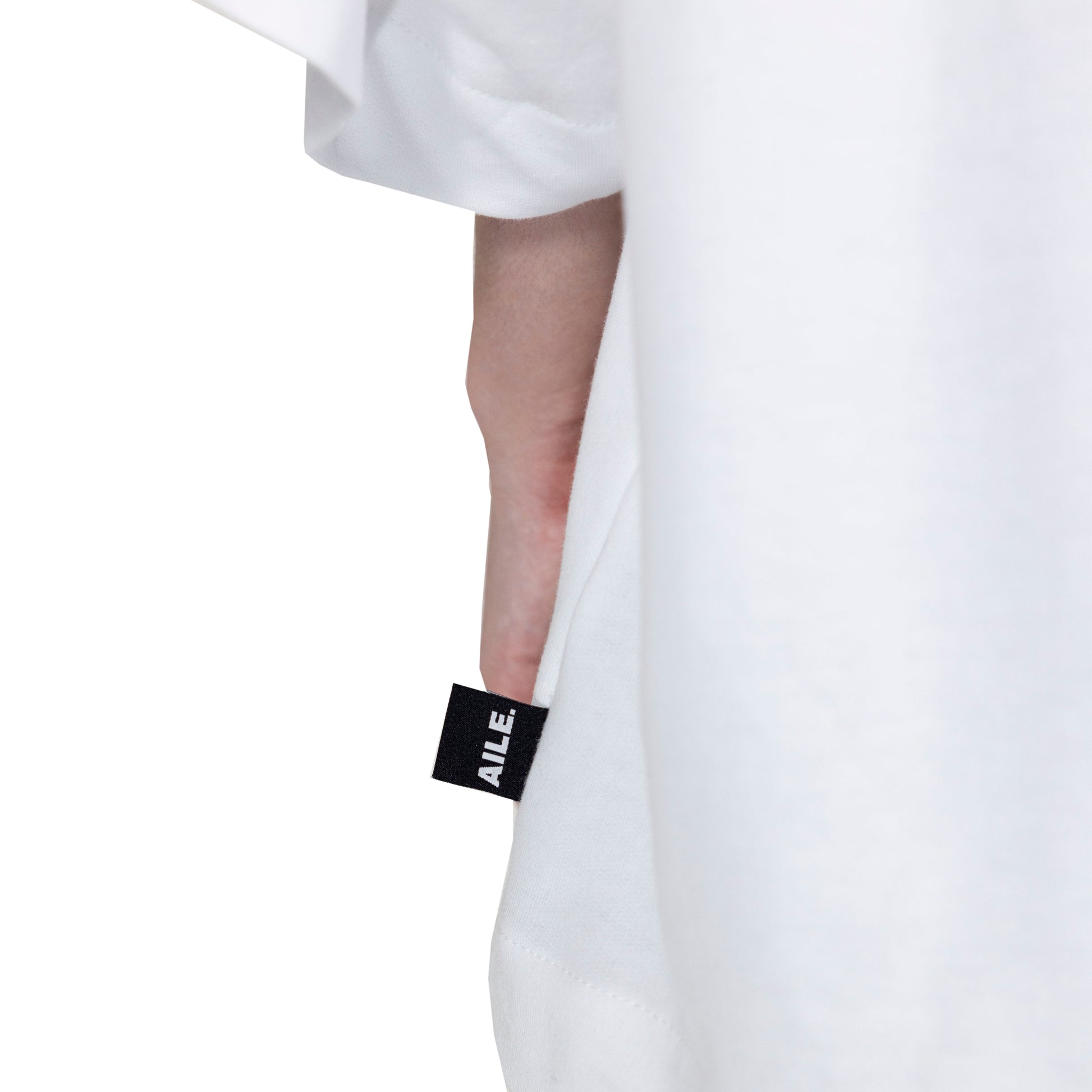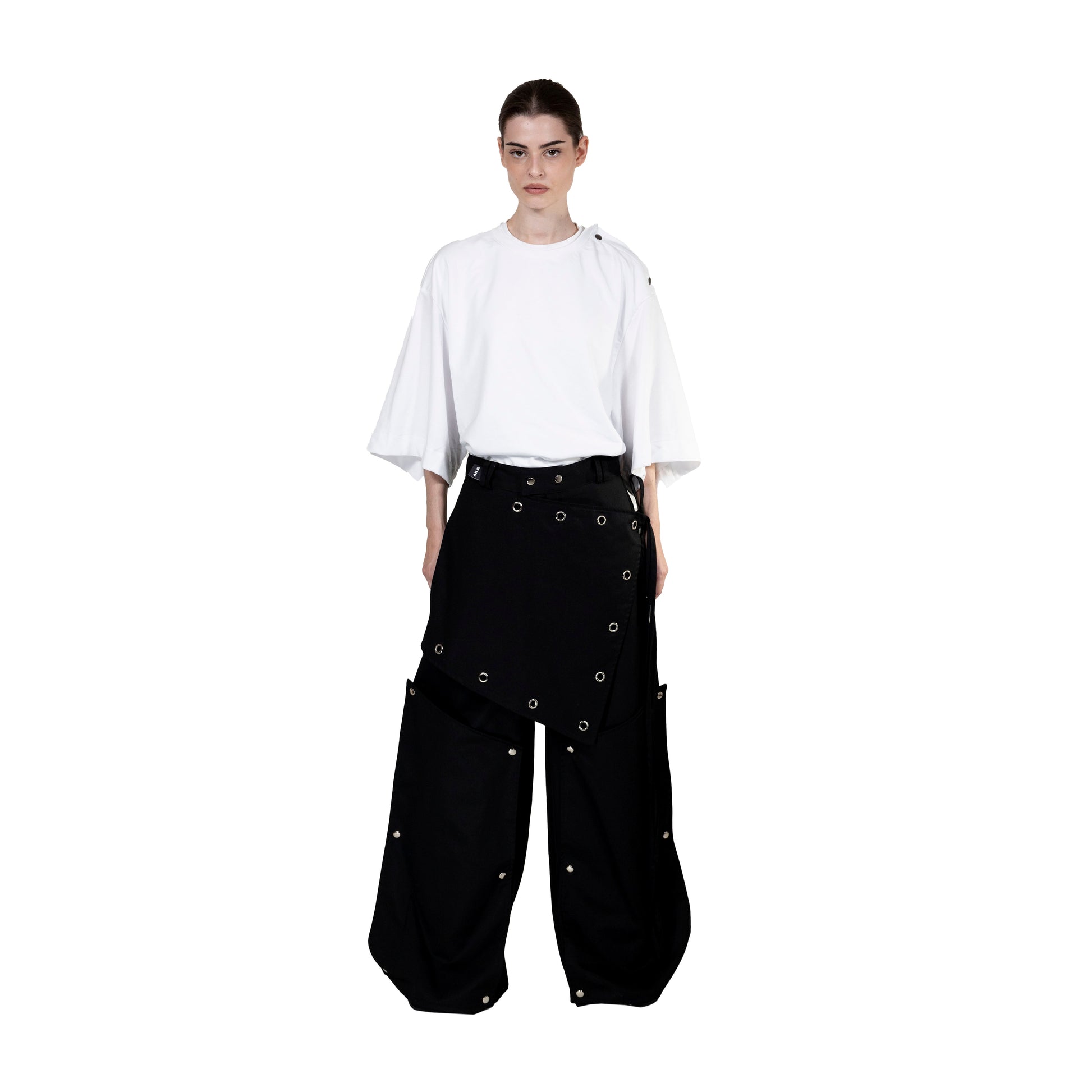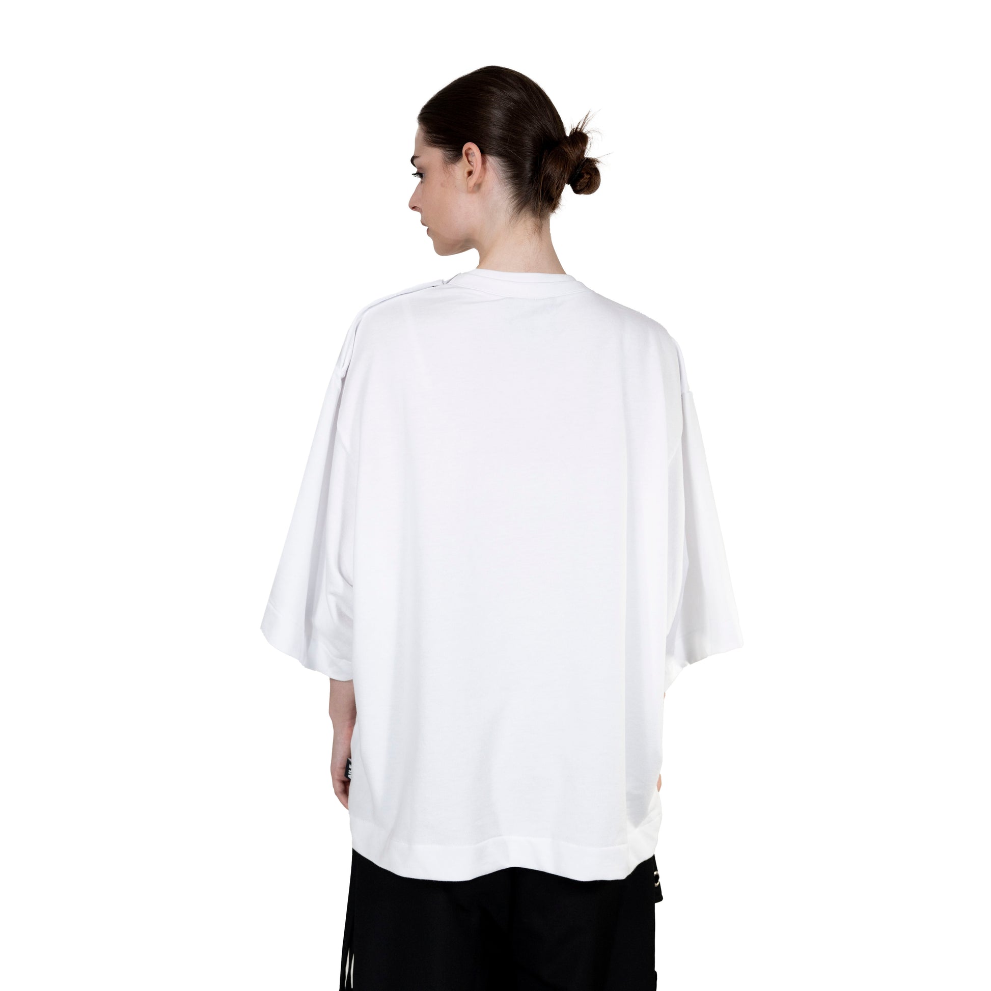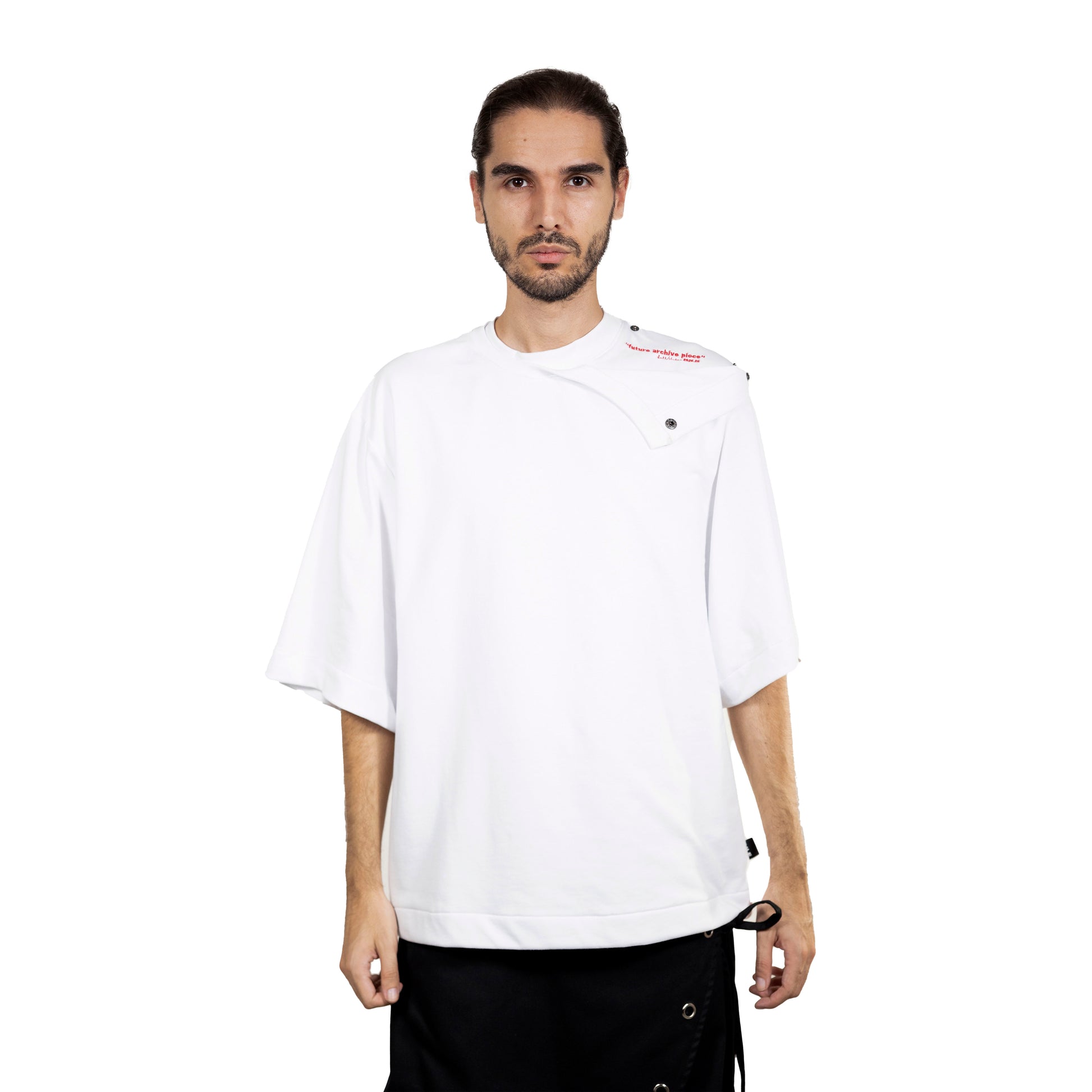 Oversized white t-shirt with double fabric on the front. Buttons on the shoulder and embroidery on the inner layer.