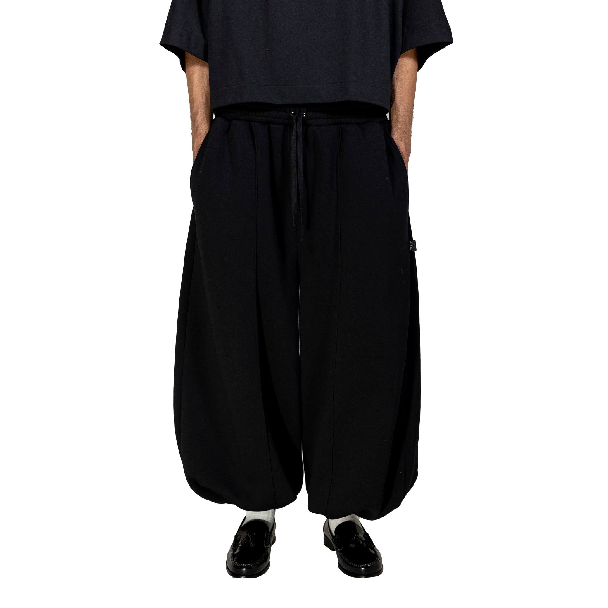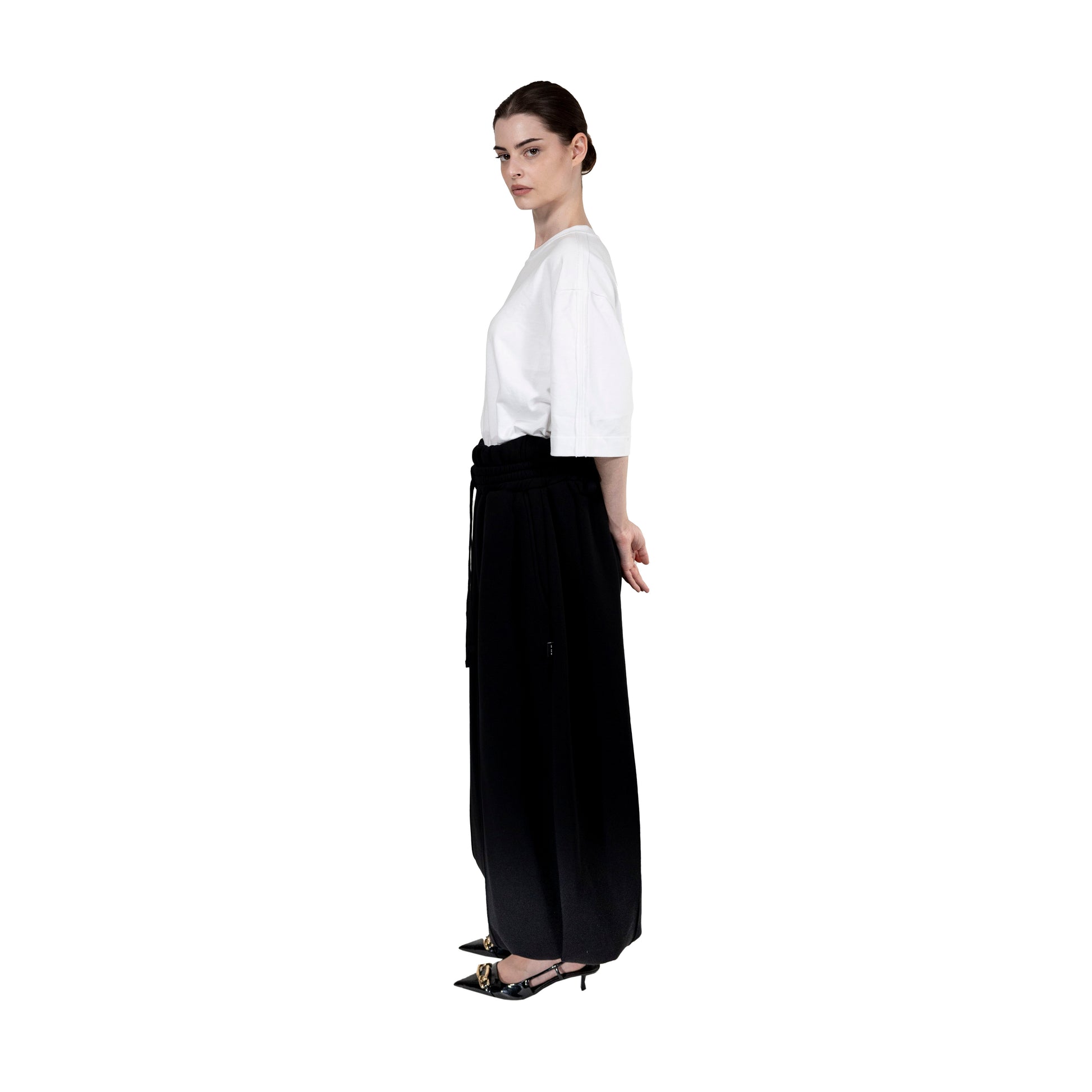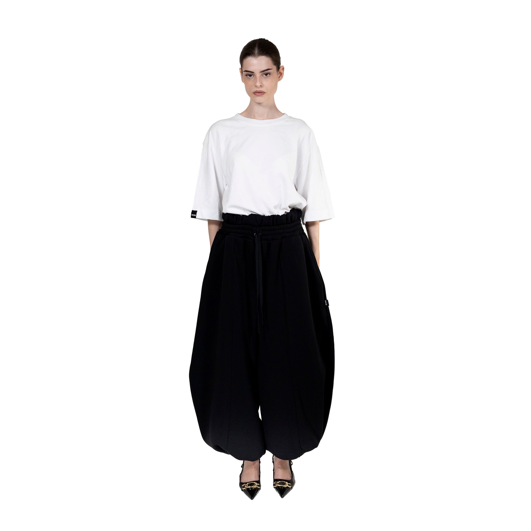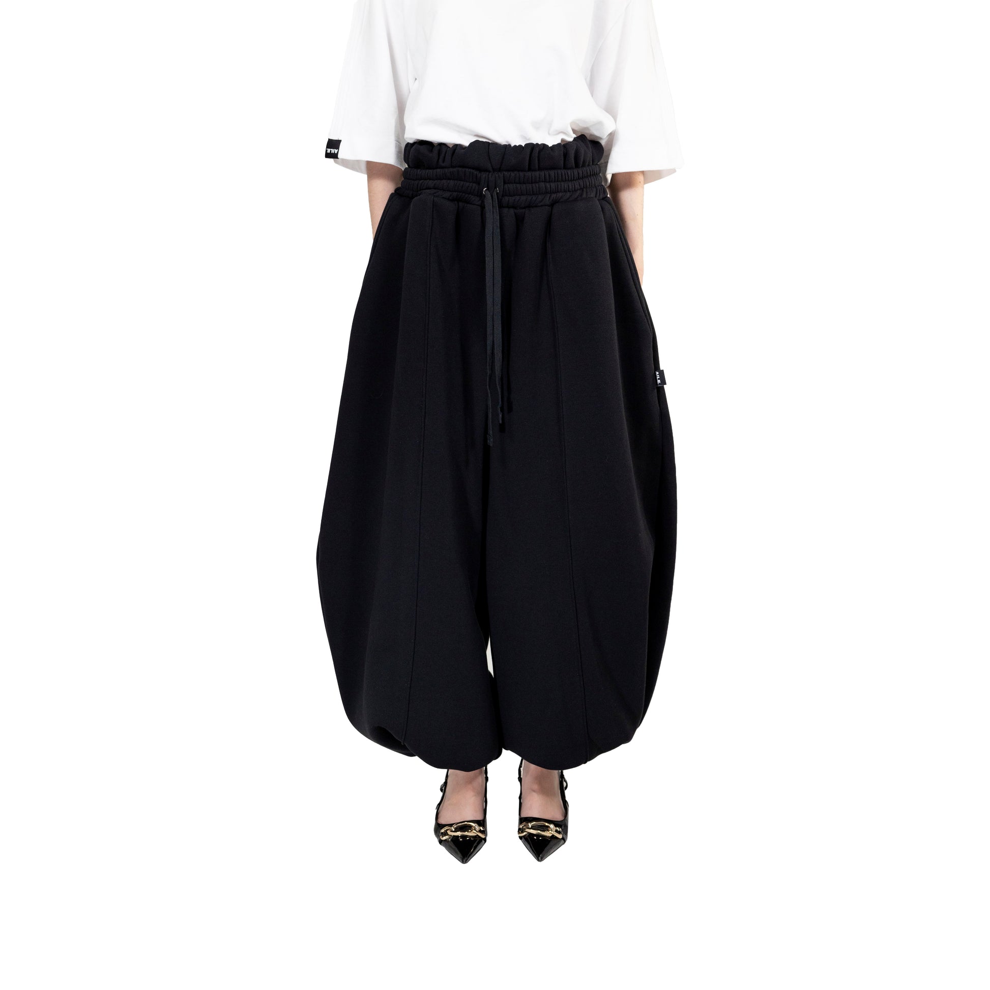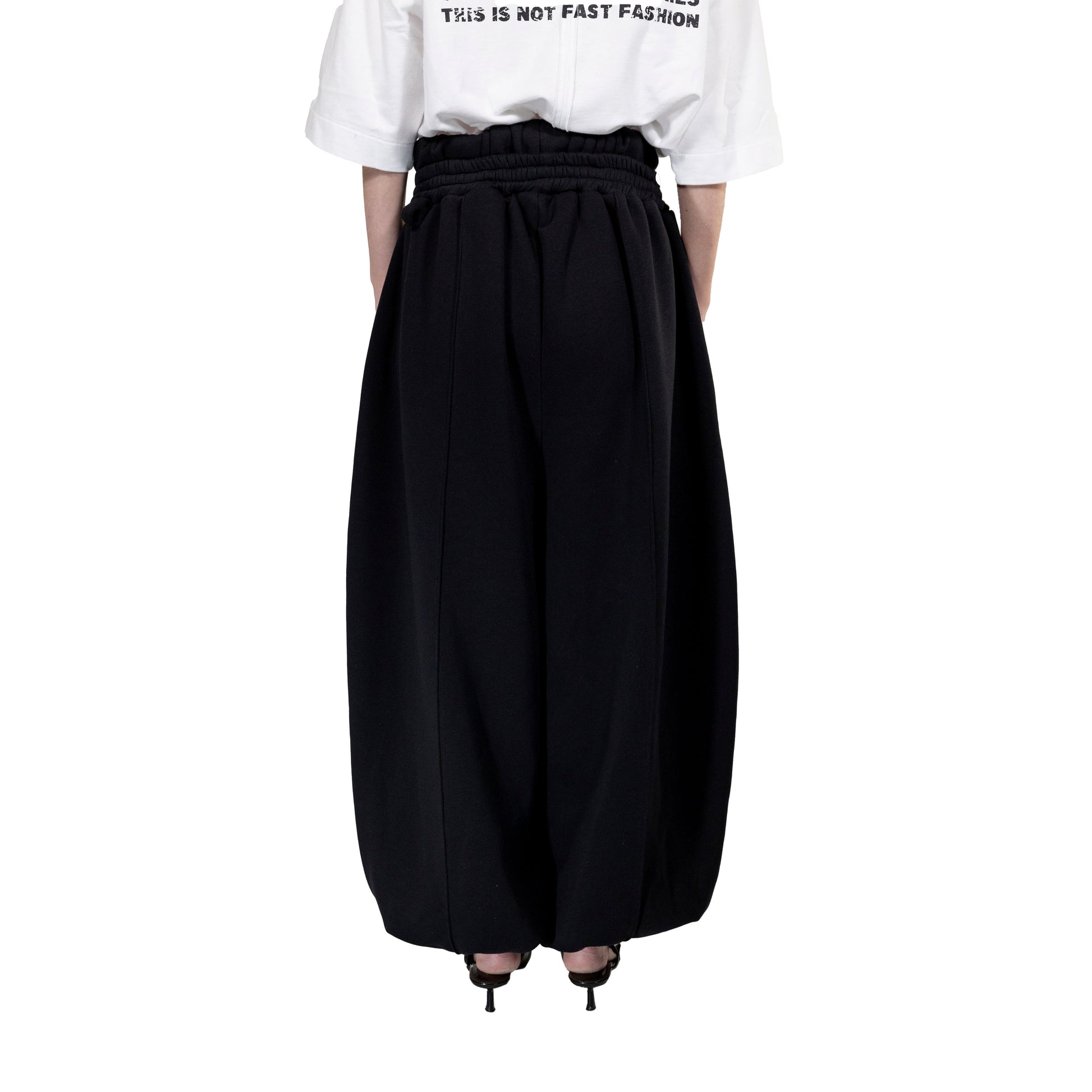 Tracksuit pants with double waistband. Balloon shape.
