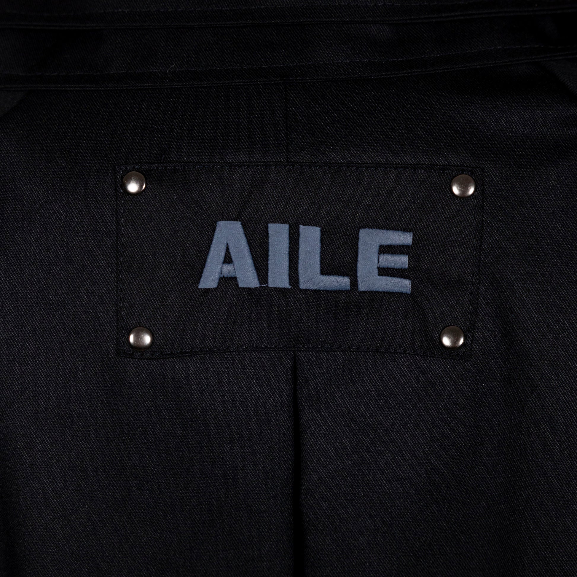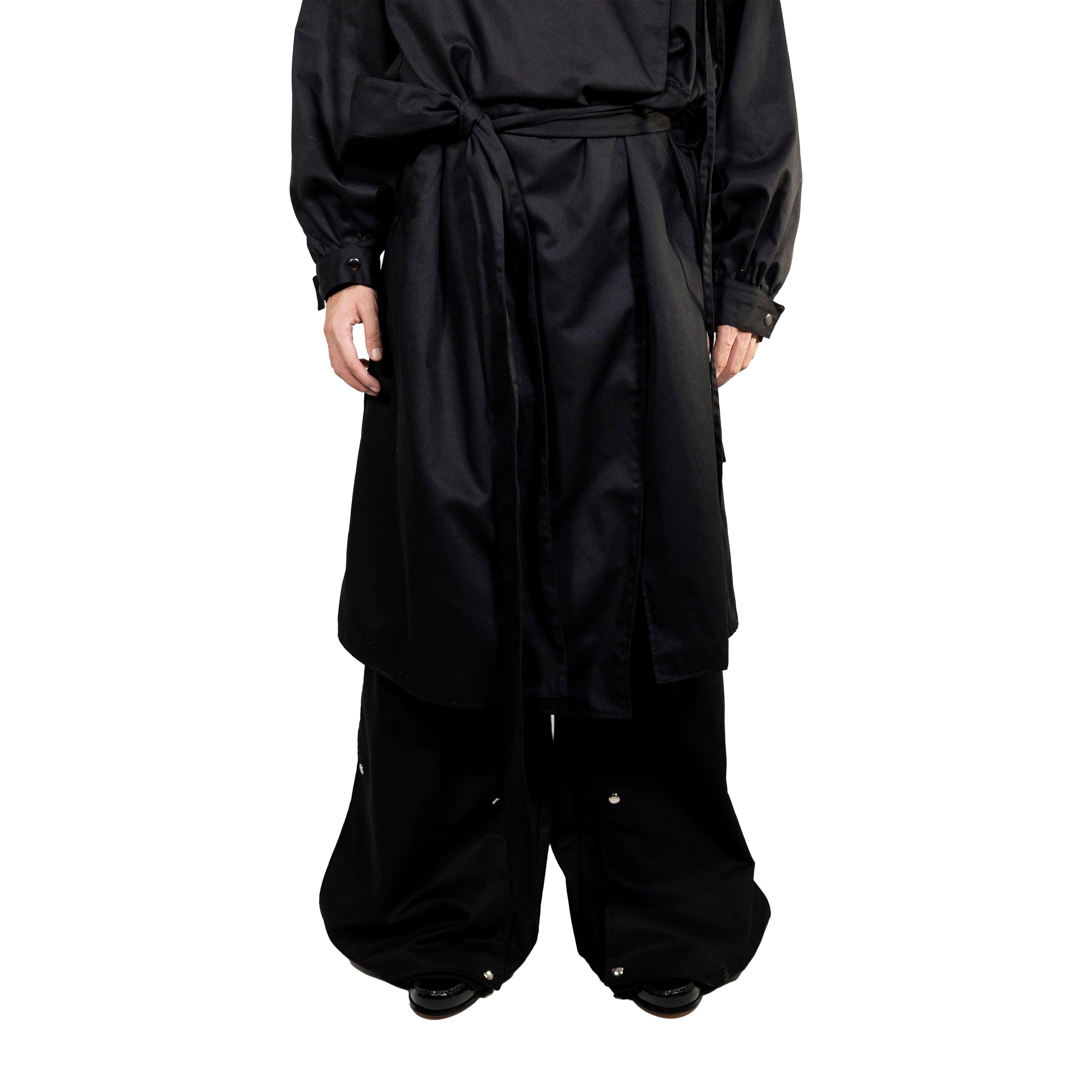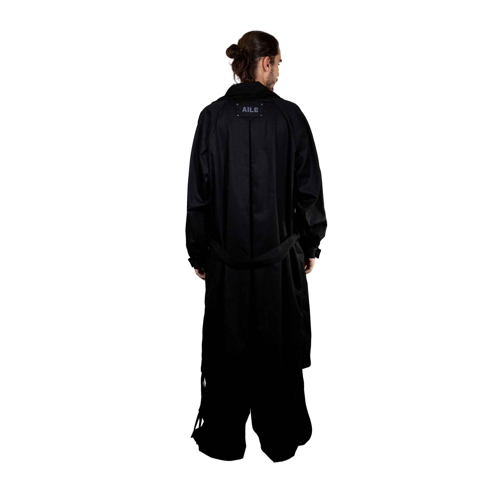 Black long trench coat with adjustable sleeves and embroidered pleat on the back.