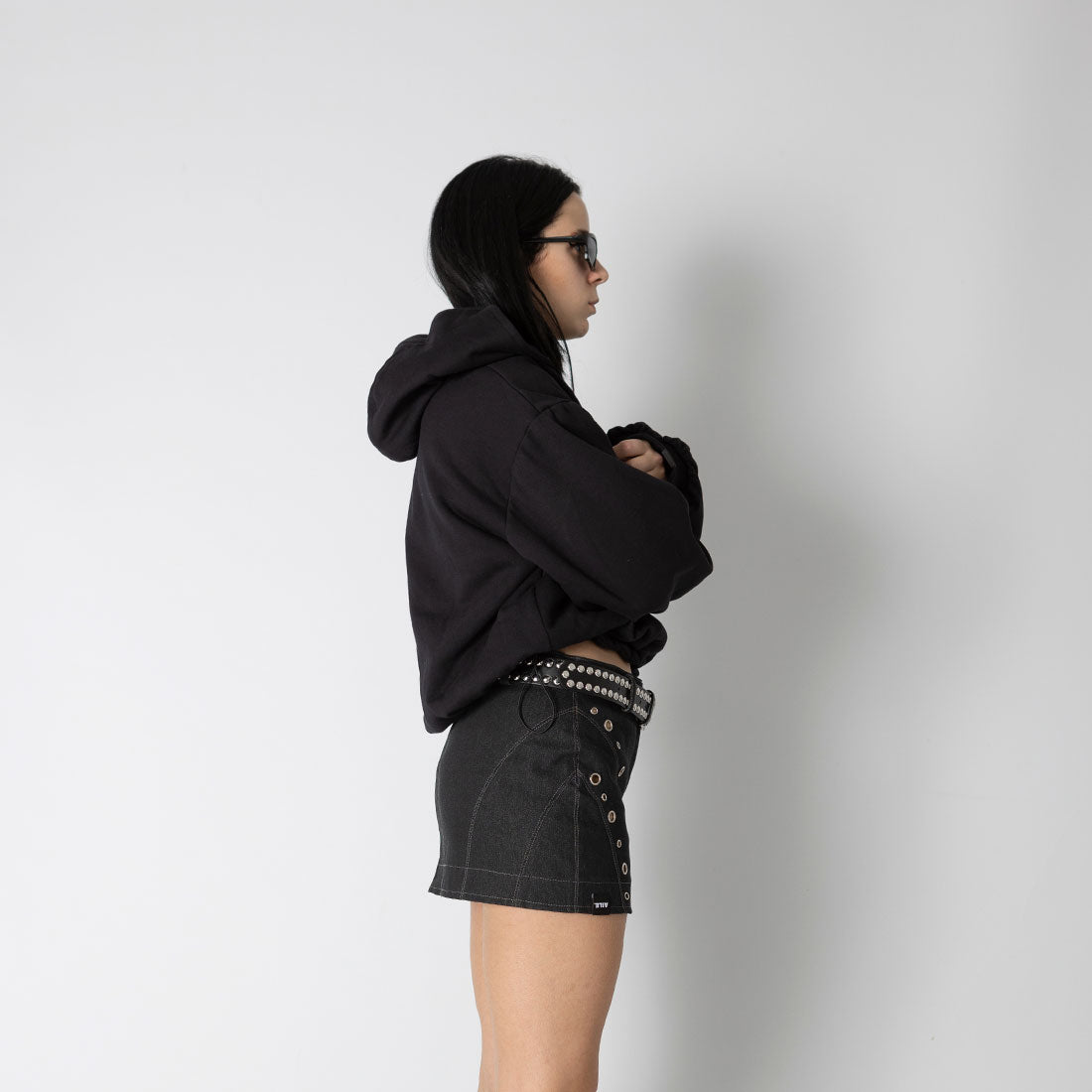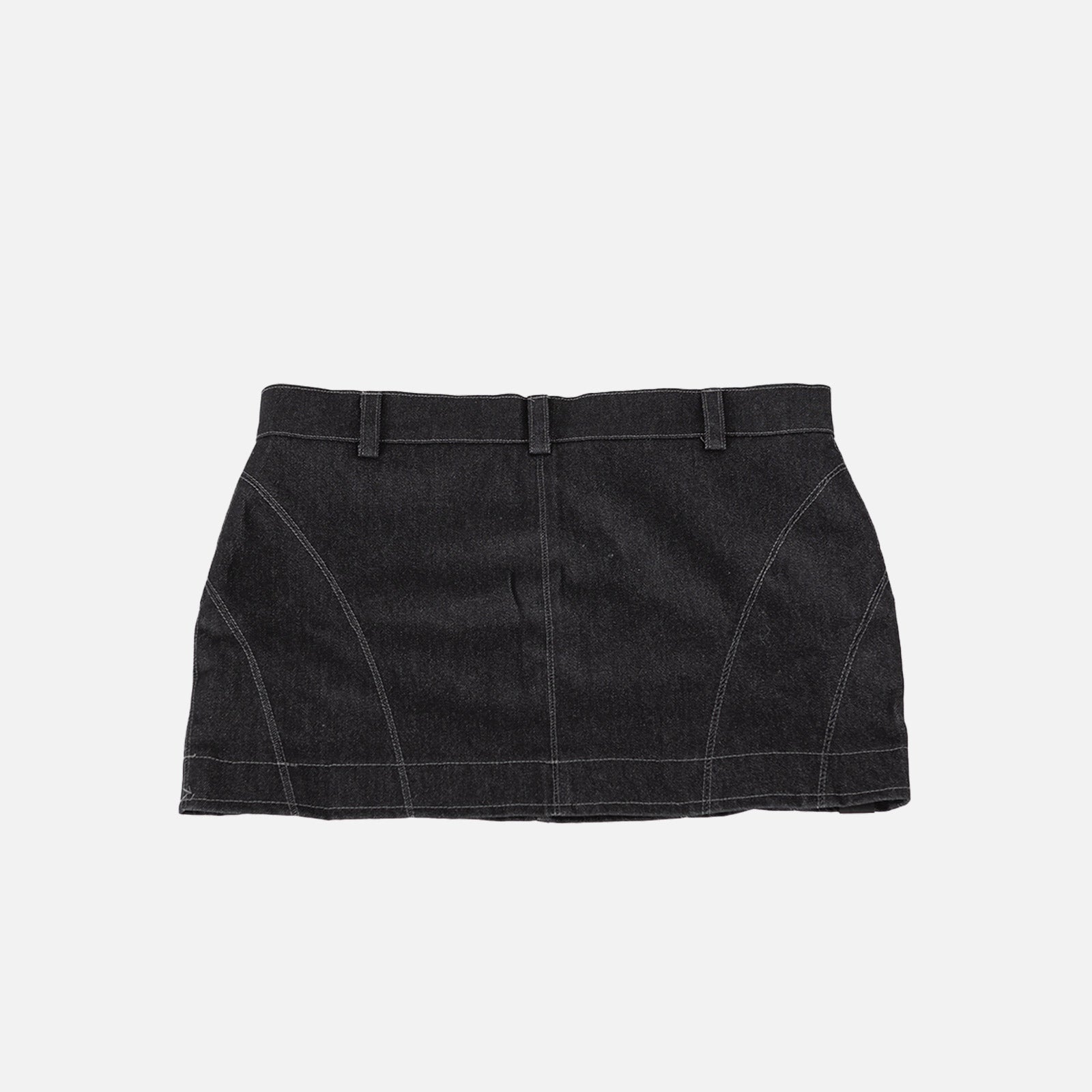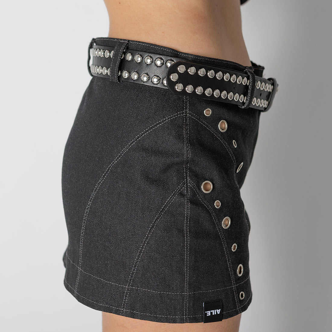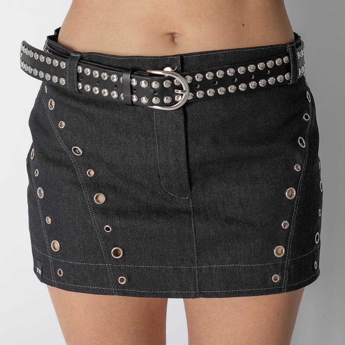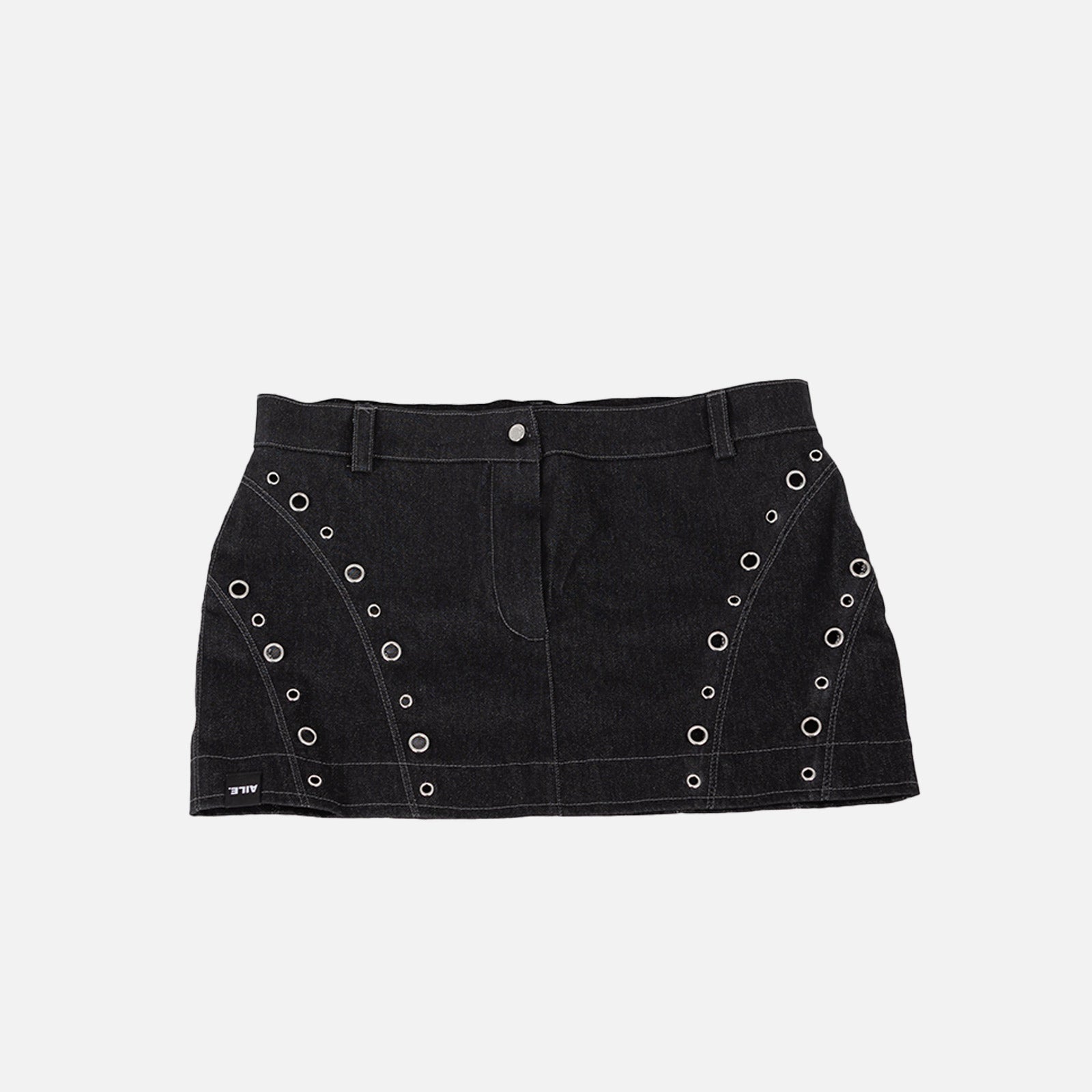 Jupe en denim avec surpiqûres contrastées. Fermeture à boutons et à glissière. 5 passants de ceinture. Rangée d'œillets sur les coutures.