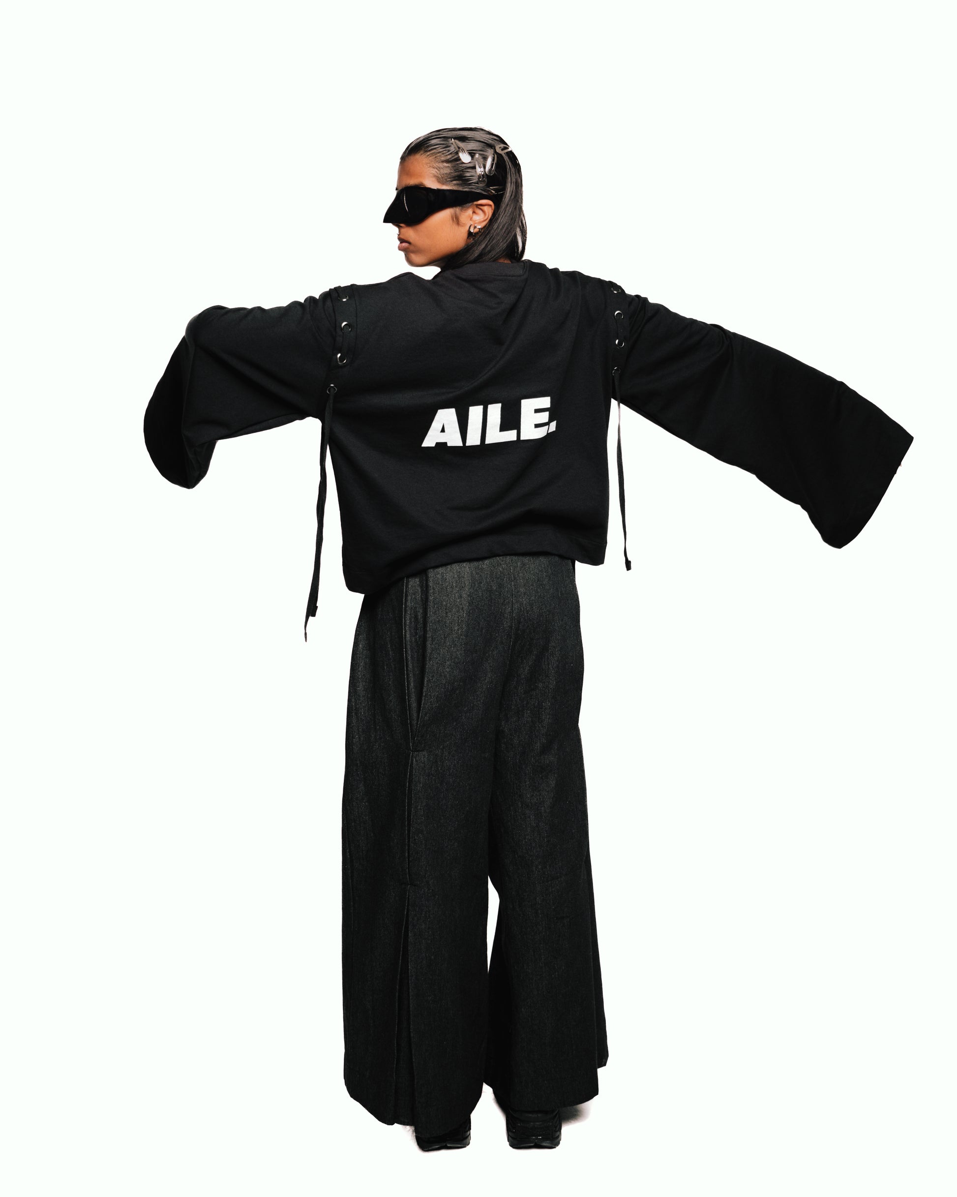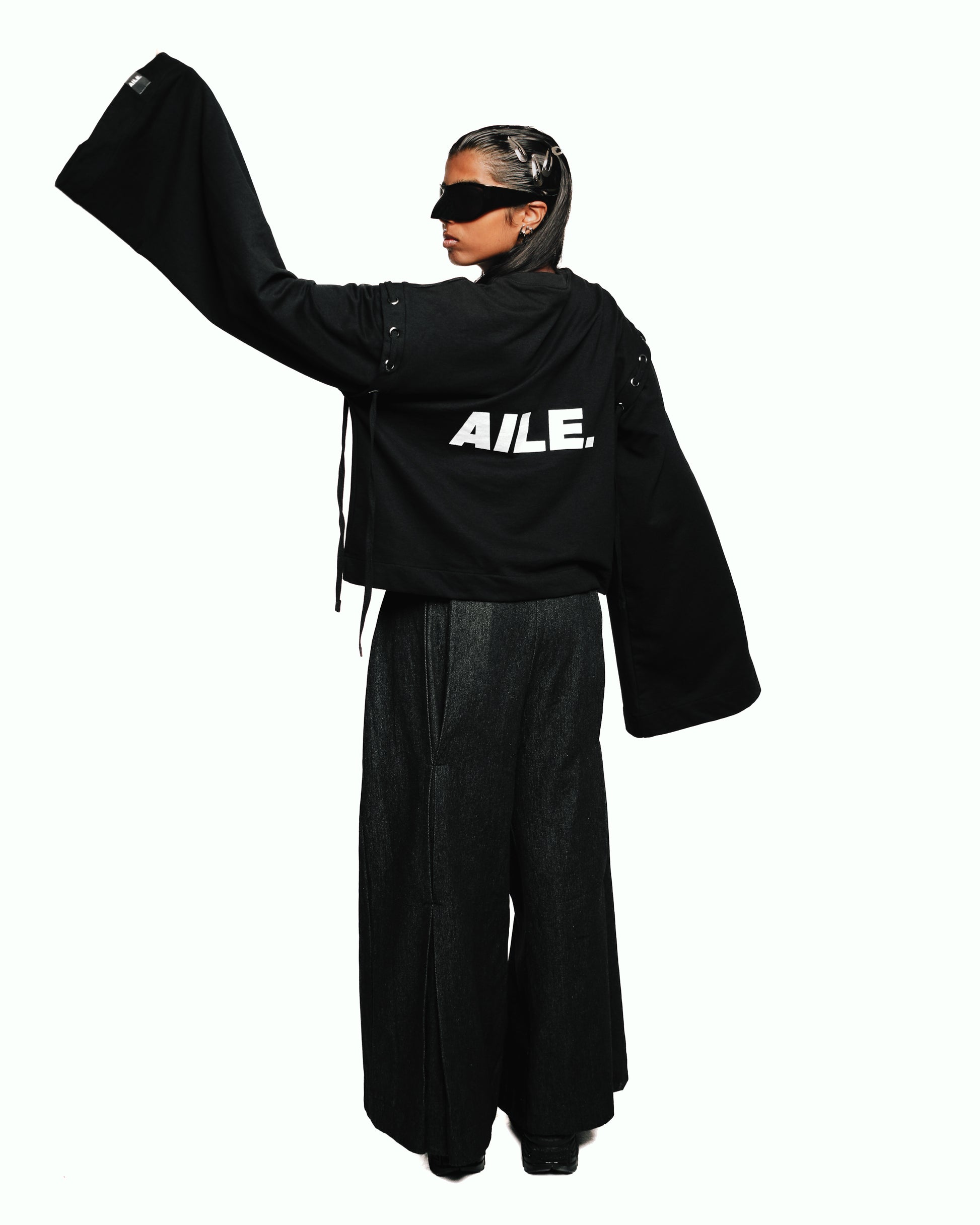 T-shirt noir avec effet épaulettes sur manches longues. Clous sur épaulière avec cordons amovibles. Logo blanc au dos du t-shirt réalisé avec une technique de sérigraphie de haute qualité.
