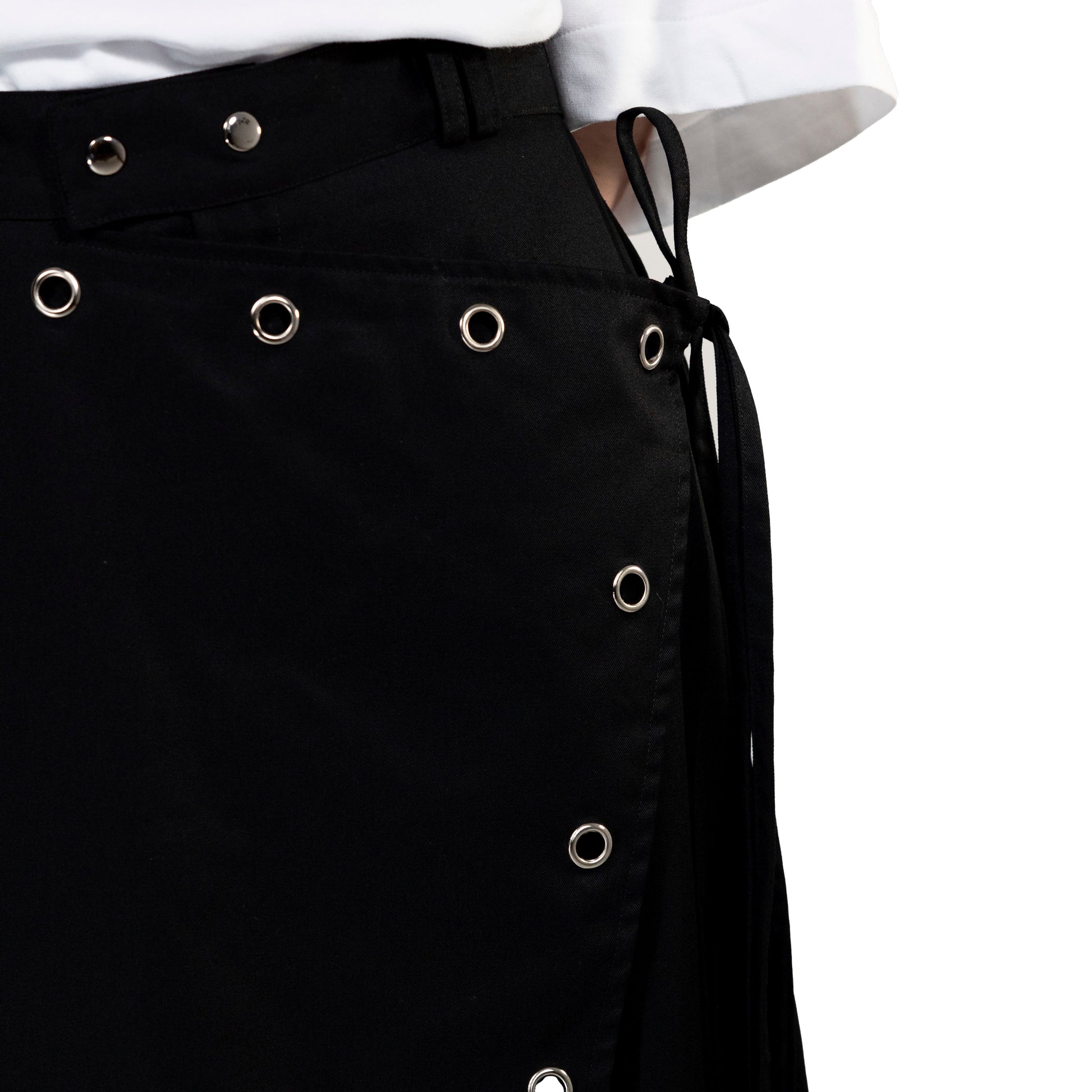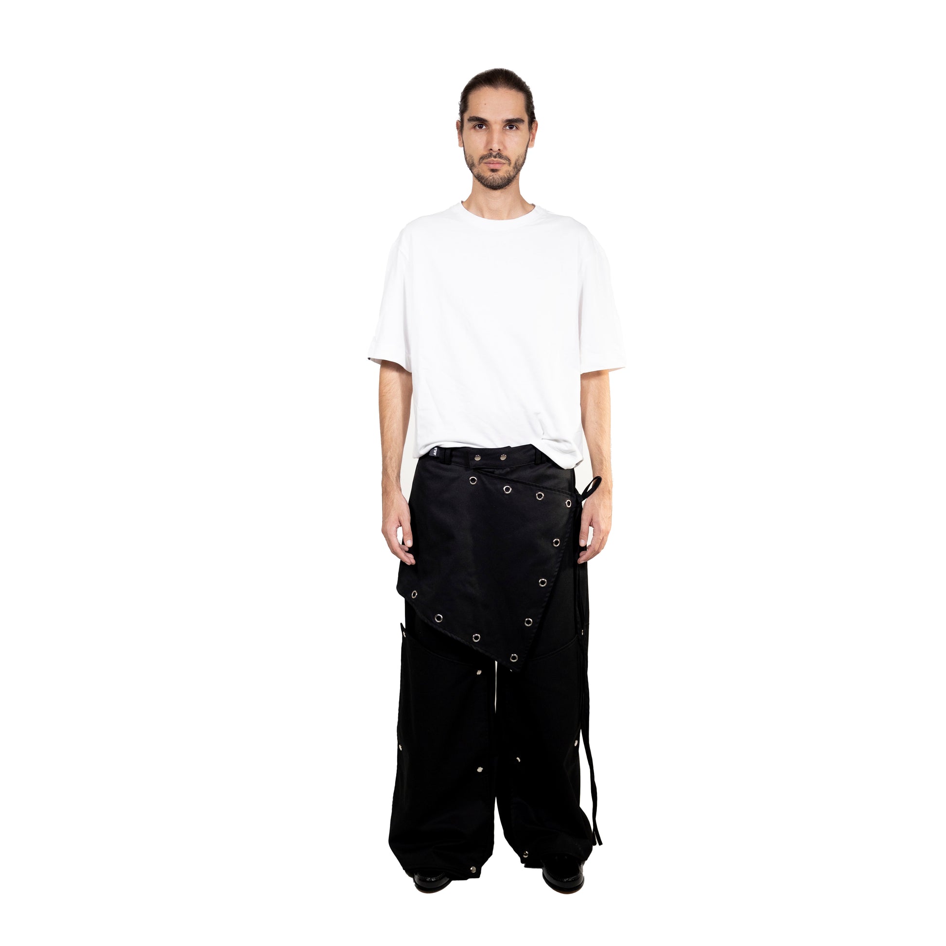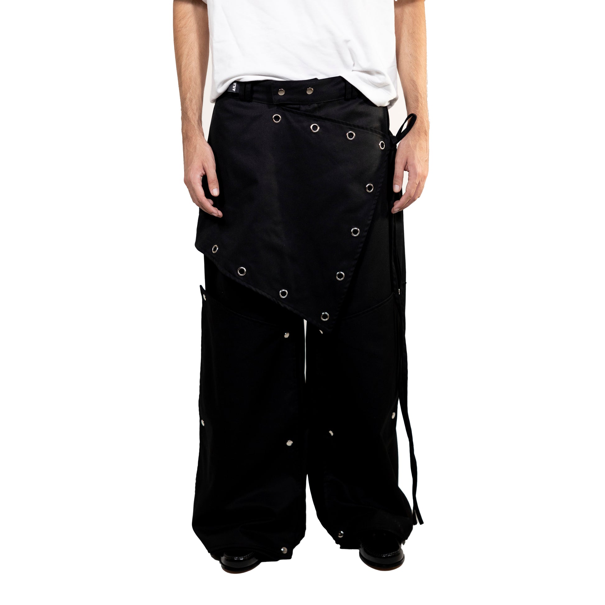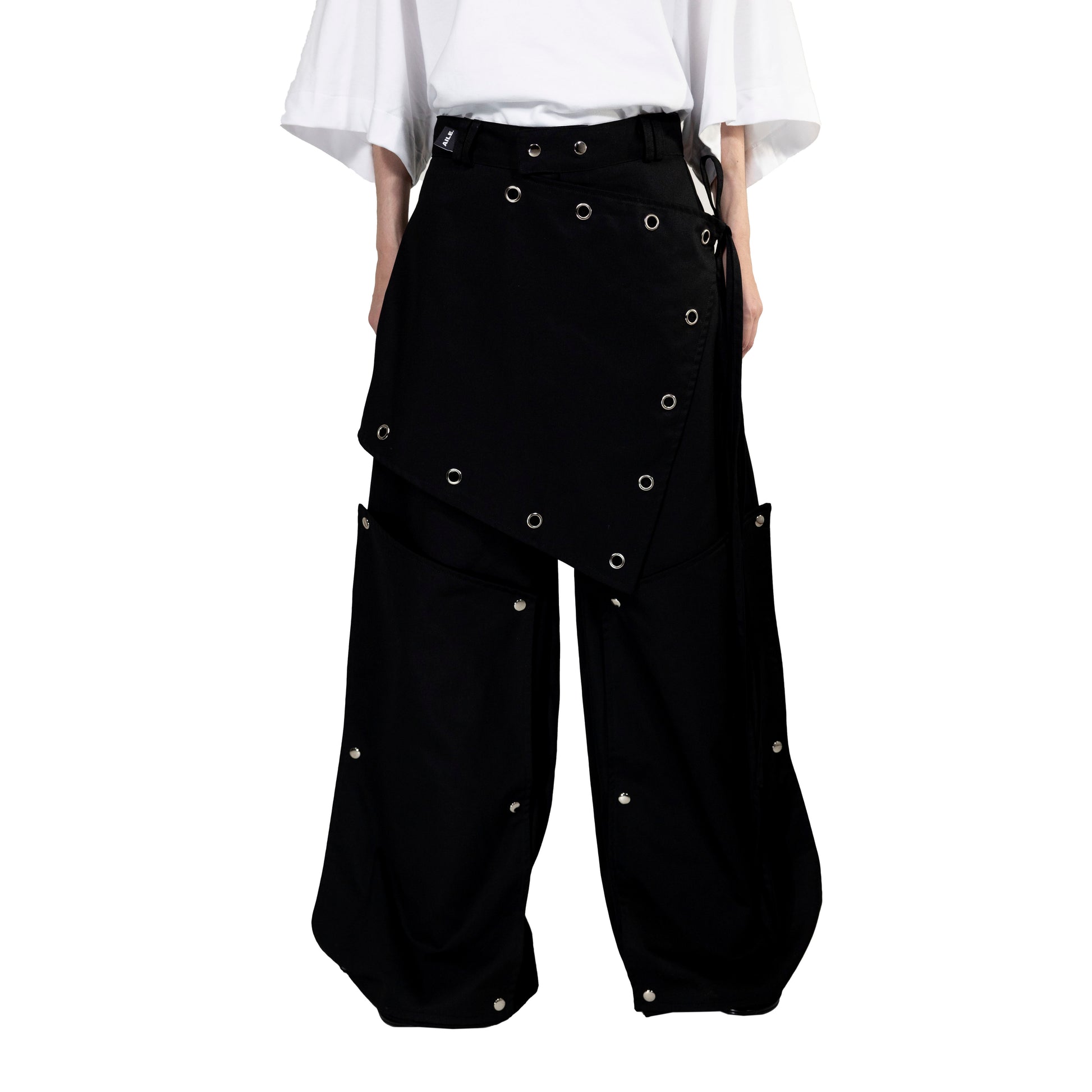 Long pants with an overlay skirt and removable leg pads.