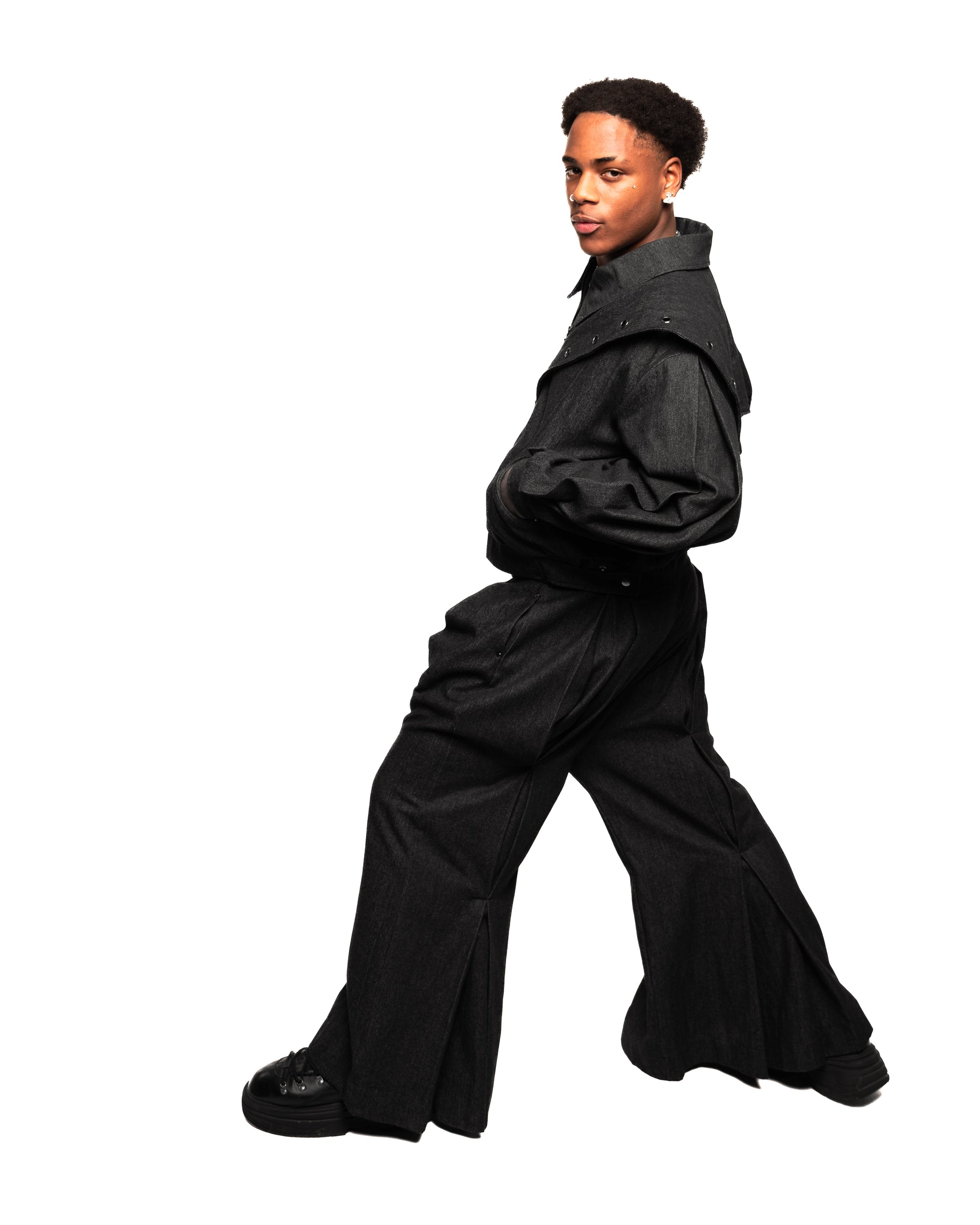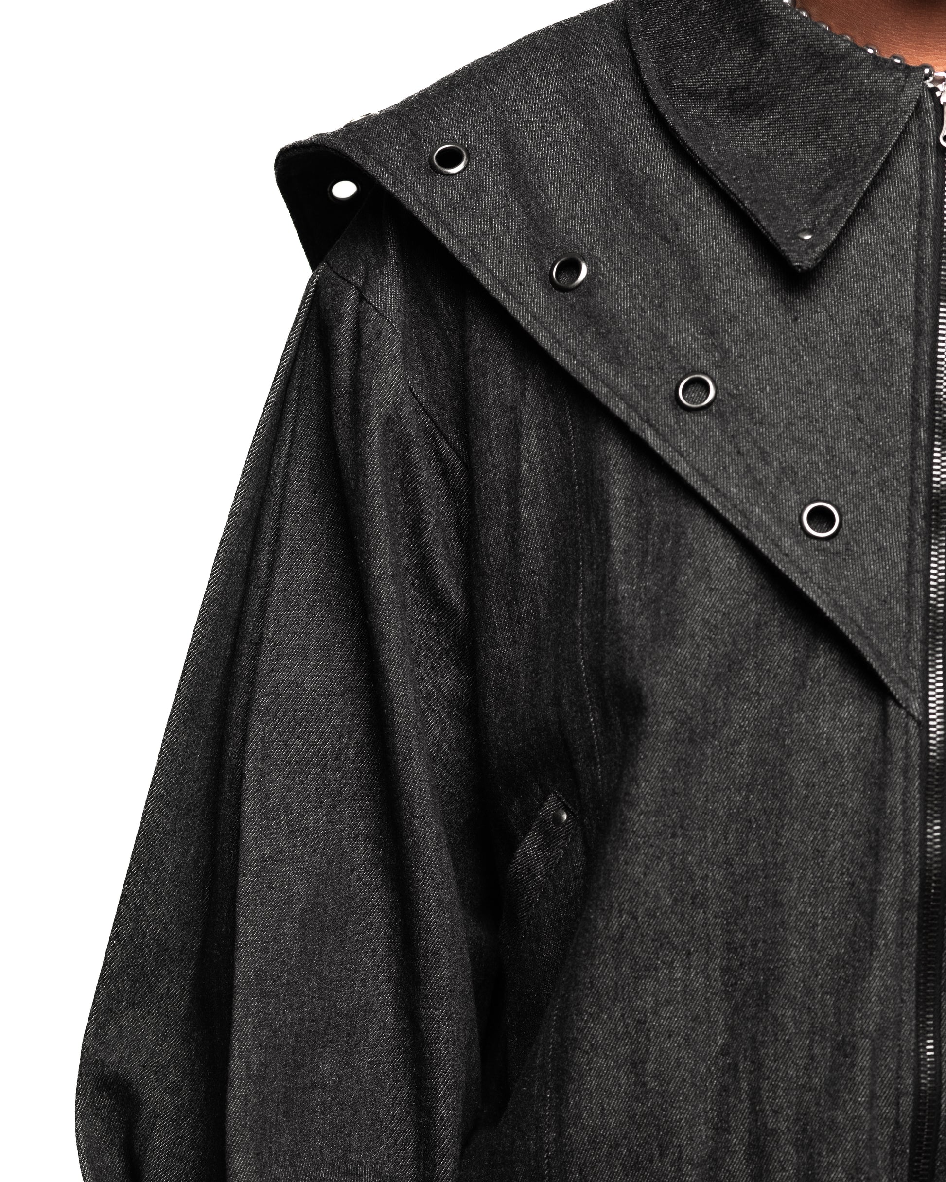 Veste universitaire en tissu denim noir avec rabat brodé au dos. Clous sur tout le revers, ceinture avec boutons réglables sur les côtés, poignets, fermeture éclair sur le devant et poches avant.
