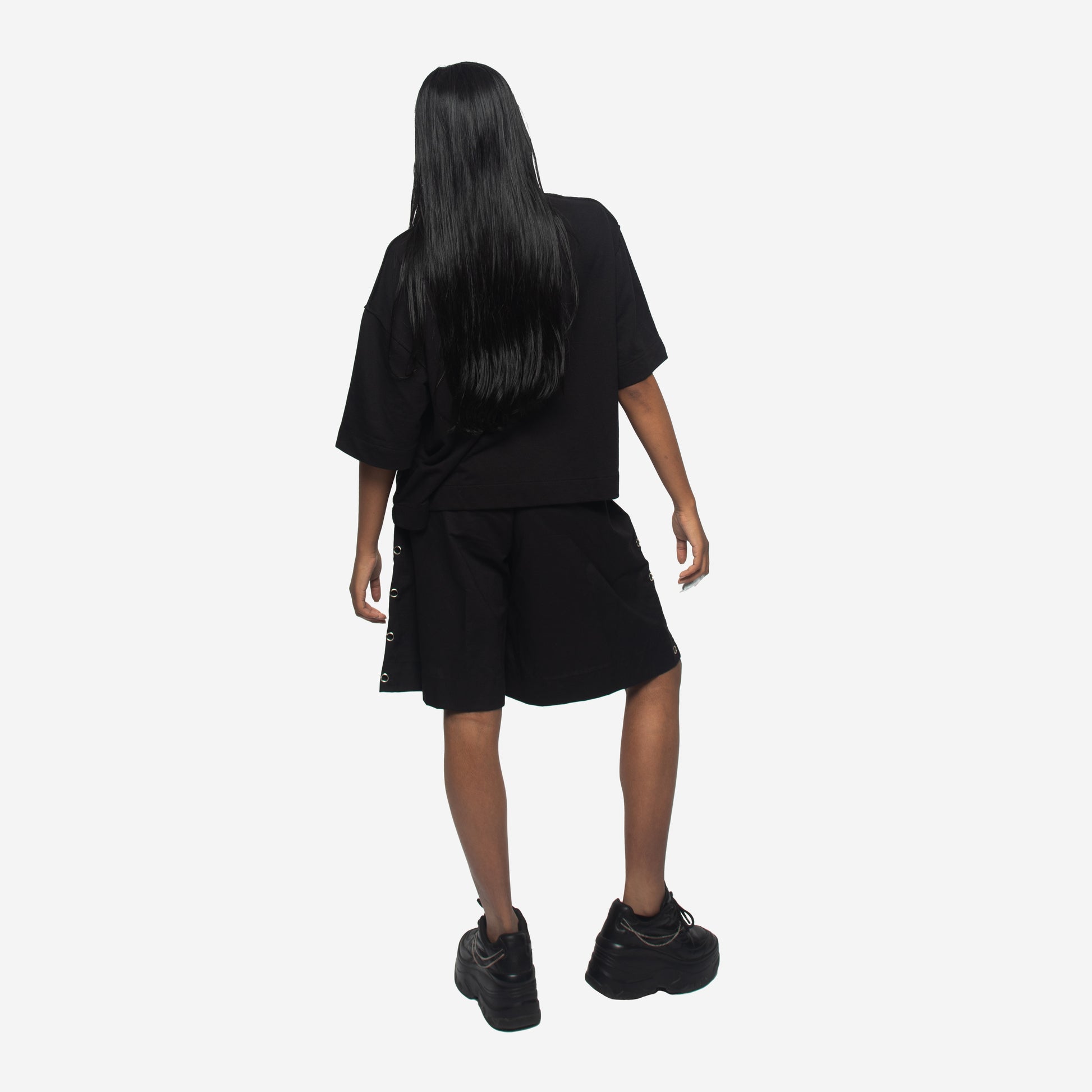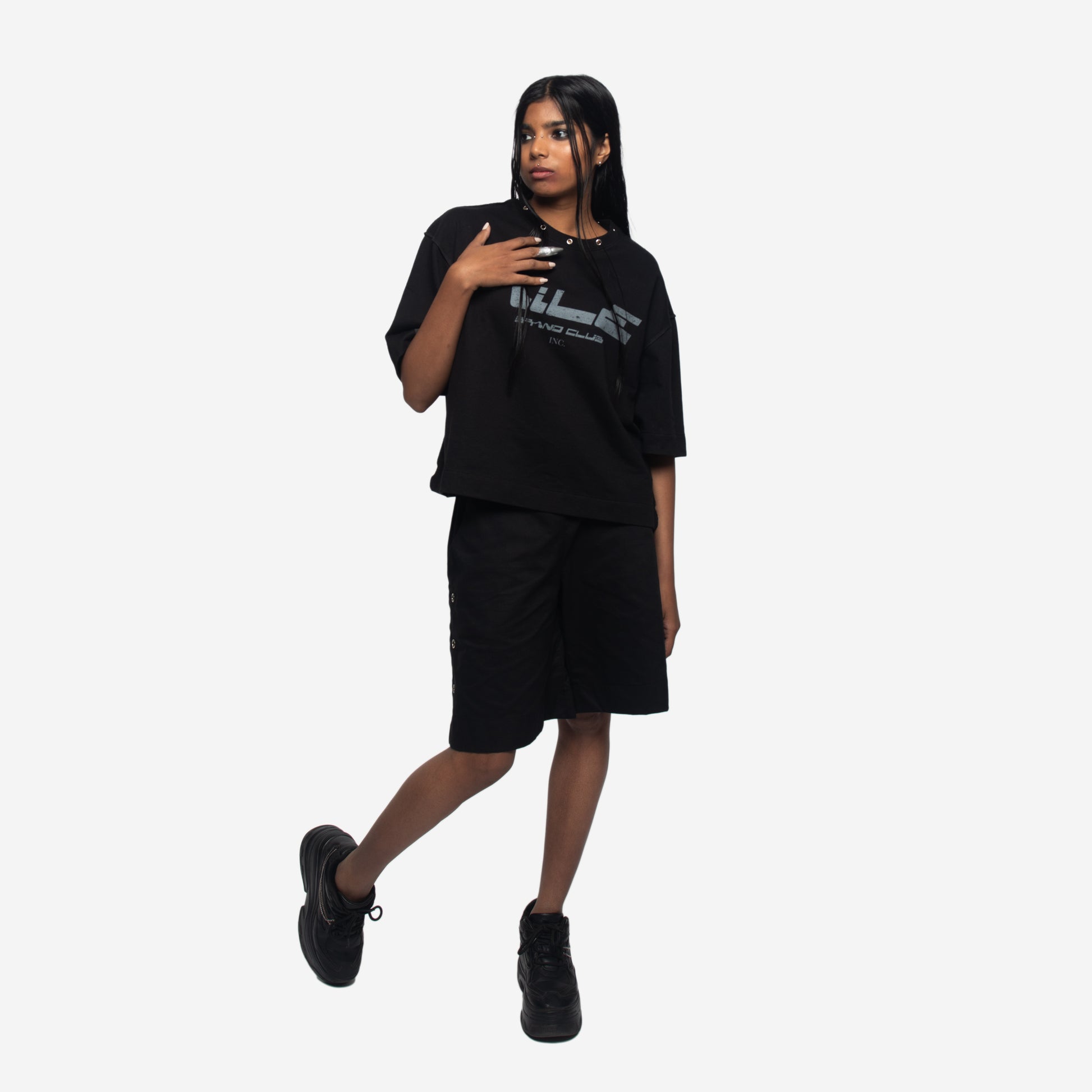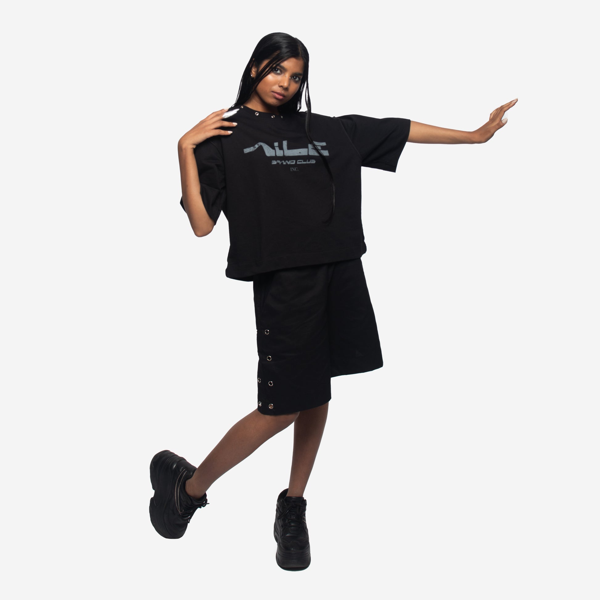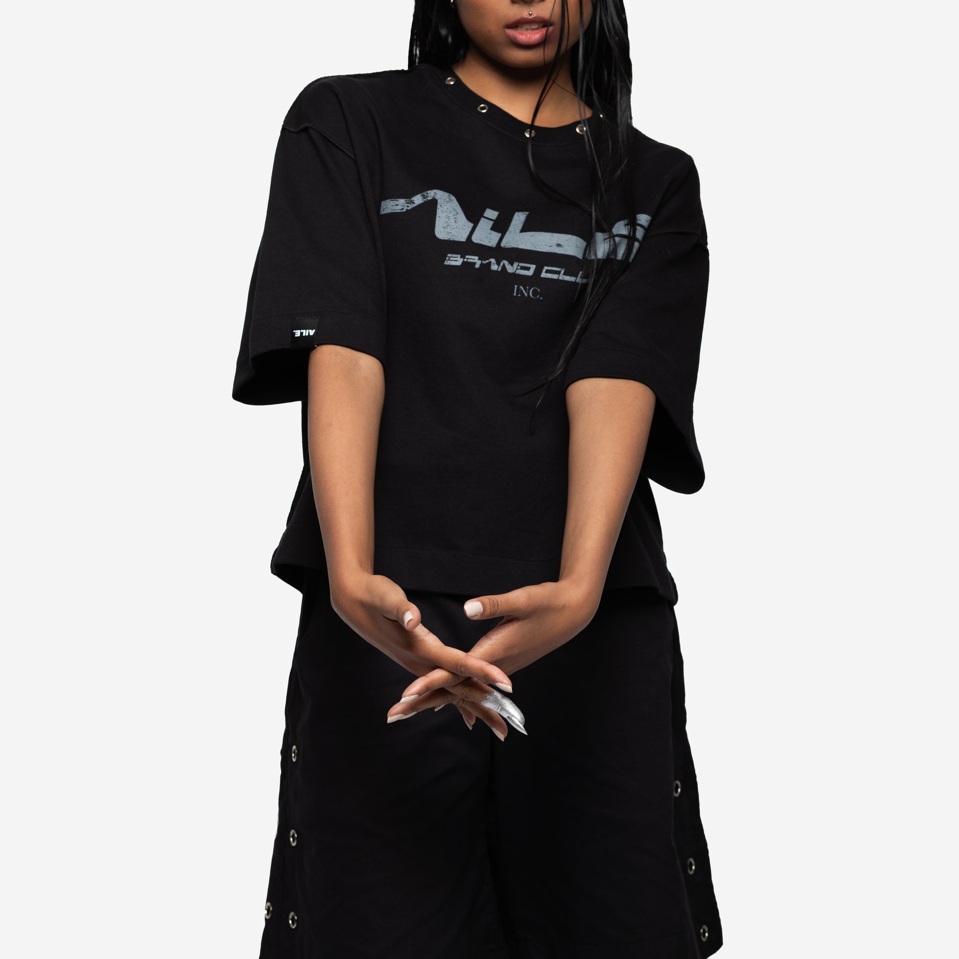 Camiseta con fit cropped/boxy en color negro con costuras vistas, tachuelas en el cuello y serigrafía frontal.