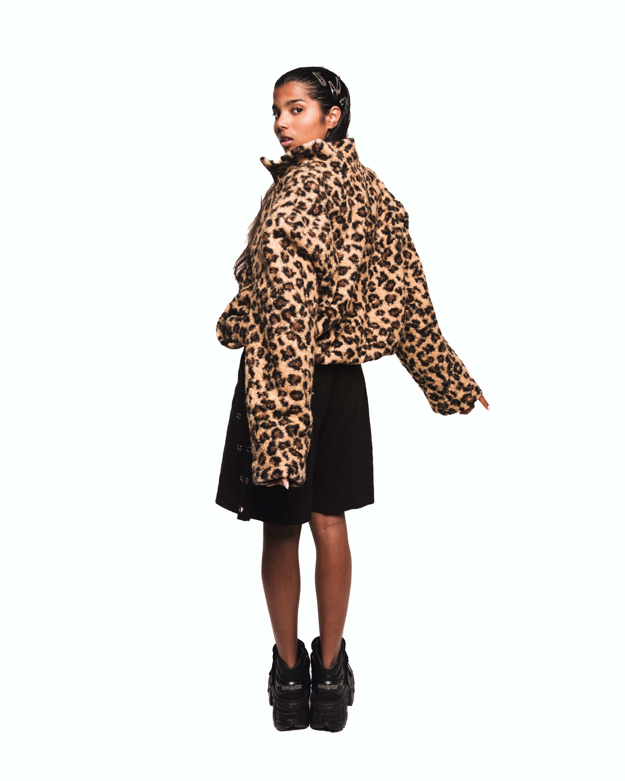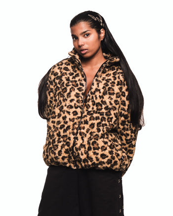 Chaqueta polar de manga larga con estampado de leopardo con interior forrado de pelo negro. Cremallera negra en el delantero y bolsillos delanteros con etiqueta de marca. Ajuste en cintura con goma interior y tankas.